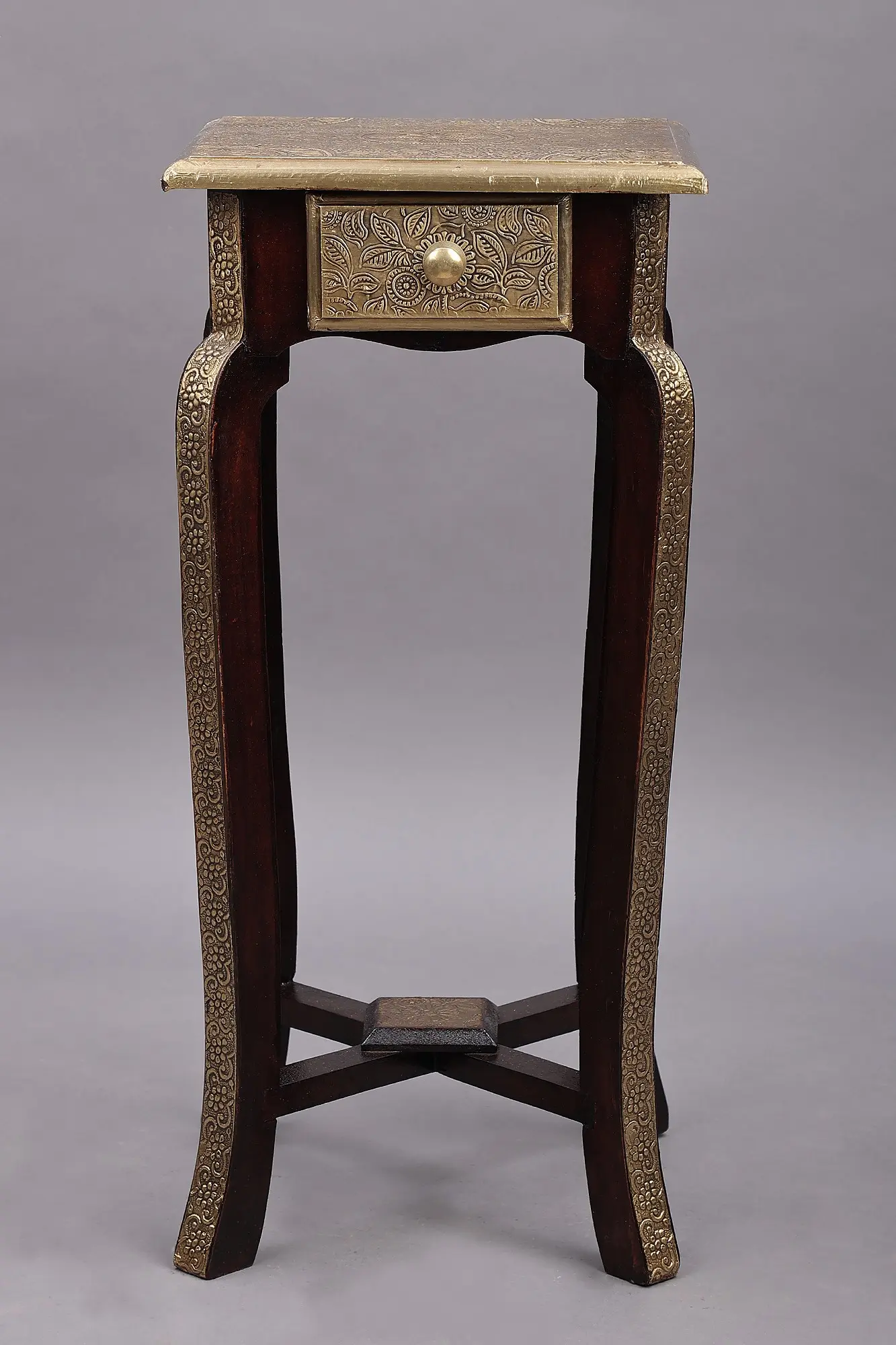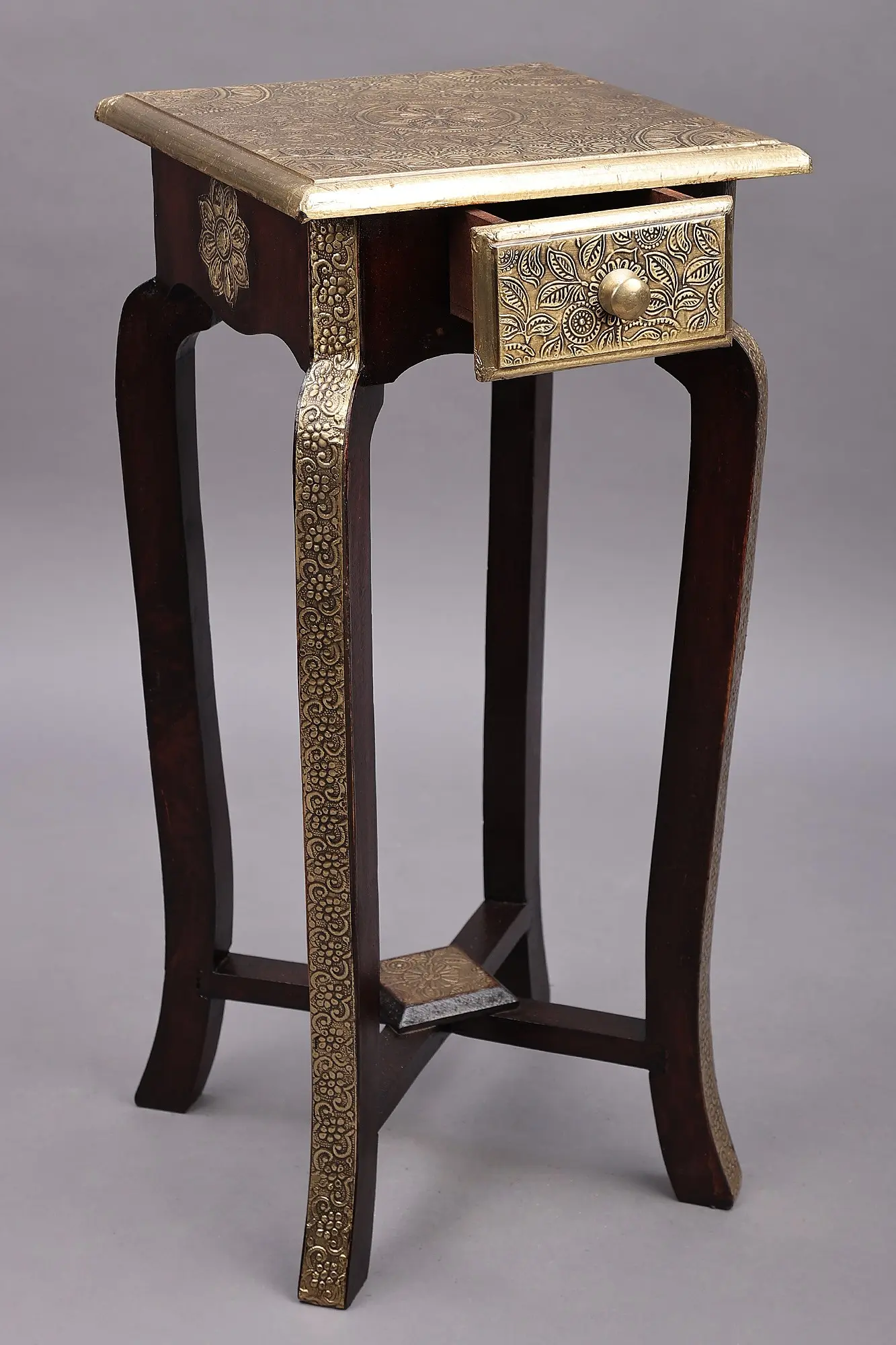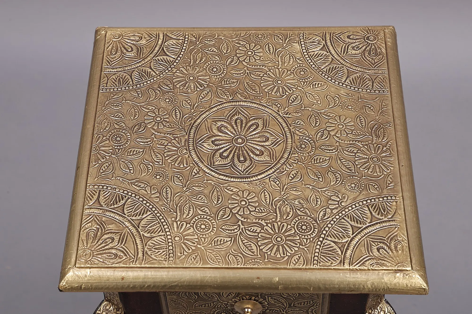 This stool is not only a beautiful object but also a practical one. The addition of a small drawer provides a discreet storage space for small items, keeping your living area tidy and organized. Whether used as a bedside table, a plant stand, or simply as an accent piece, this stool will add character and charm to any space. The drawer front features a stunning floral design in brass, with an ornate knob that makes it easy to open and close. The attention to detail continues around the legs where the brass has been etched in similar floral patterns. This piece is carefully constructed to be sturdy and durable, ensuring that it will be a cherished part of your home for years to come. The stool's balanced design ensures stability, while the natural beauty of the materials makes it a versatile addition to a variety of decor styles.