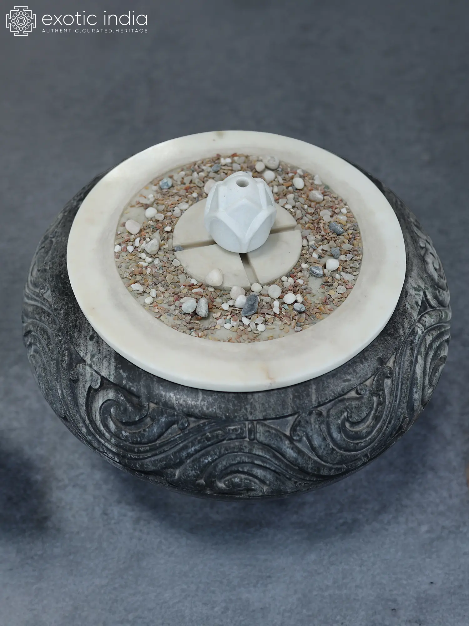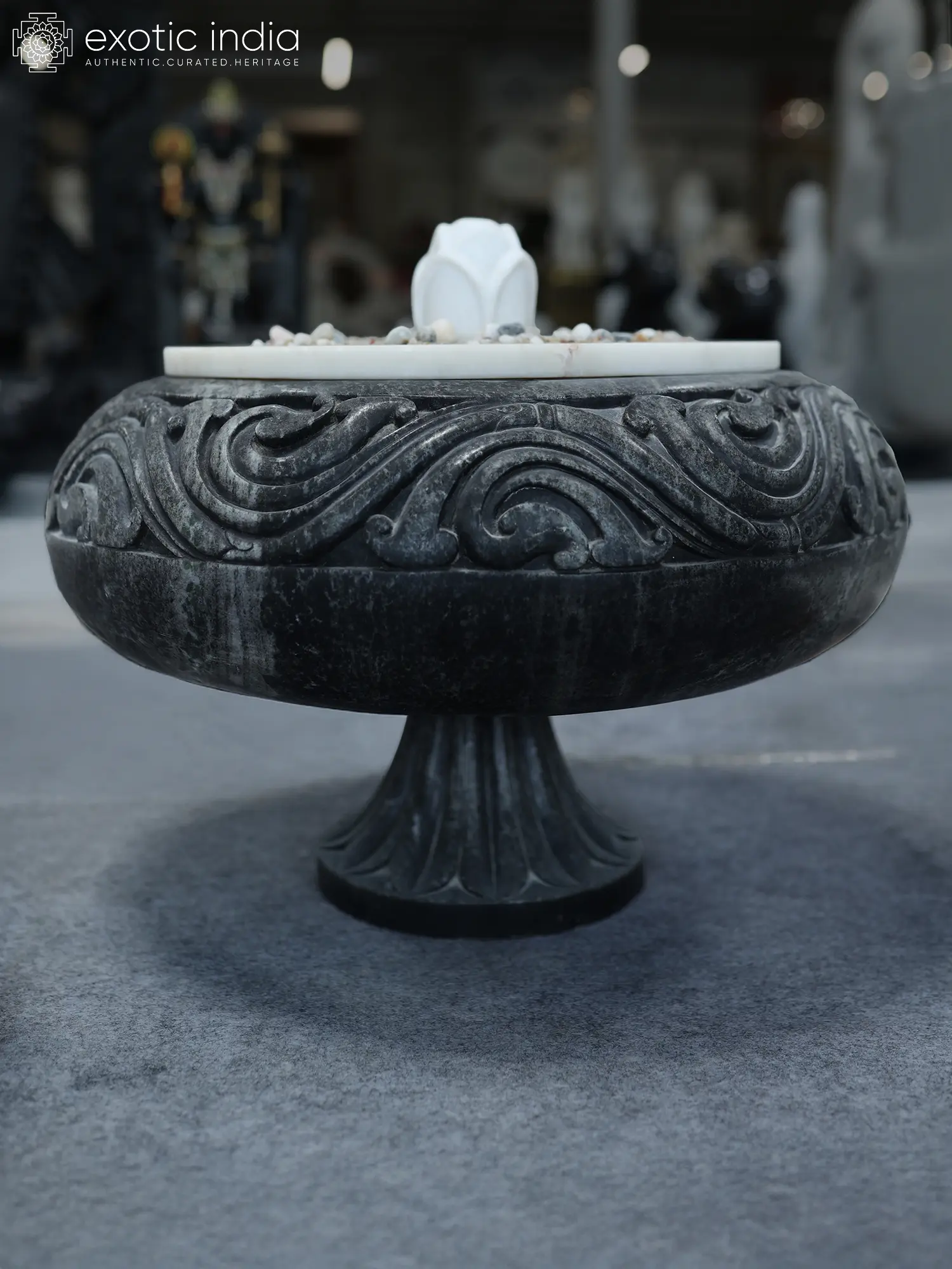 The deep, rich tones of the dark marble form a dramatic contrast with the pristine white accents, creating a visually arresting composition. Intricate patterns, reminiscent of flowing water or unfurling vines, adorn the generous basin, adding a layer of sophisticated detail. The smoothly polished surfaces invite touch, offering a sensory experience that complements its visual allure. Its substantial dimensions provide a commanding yet graceful presence, designed to integrate seamlessly into your curated space.