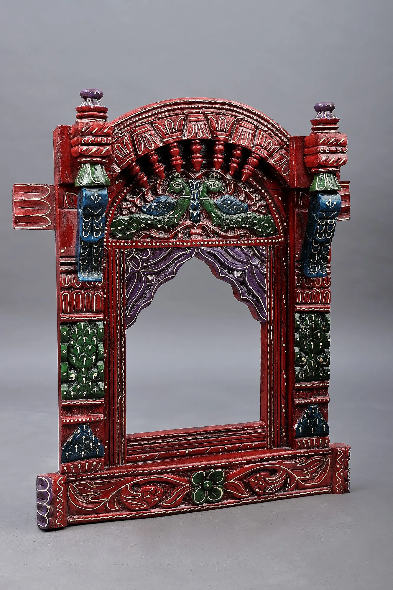 The splendid entire jharokha window decorative is raised on rectangular bars, one at the bottom, one each at both corners and covered with a semi-circular bar from above. In the middle, two very beautiful panels have been stretched in an angular way, on which two attractive parrots are sitting, adding to the beauty of the whole temple. The design of seven identical posts as lampshades enhances the charm. In addition, the item features a natural red–brown–white rangoli tone for a unique look.