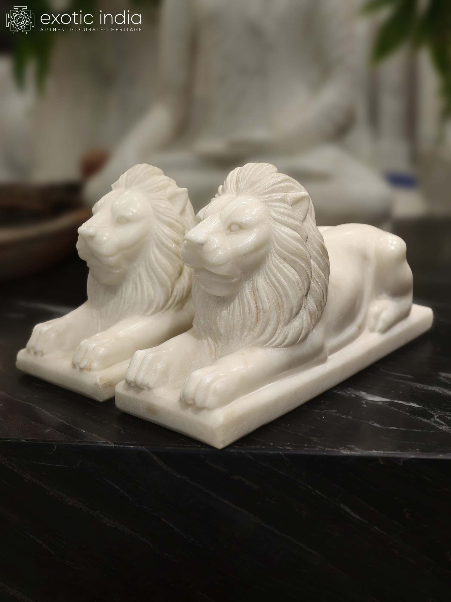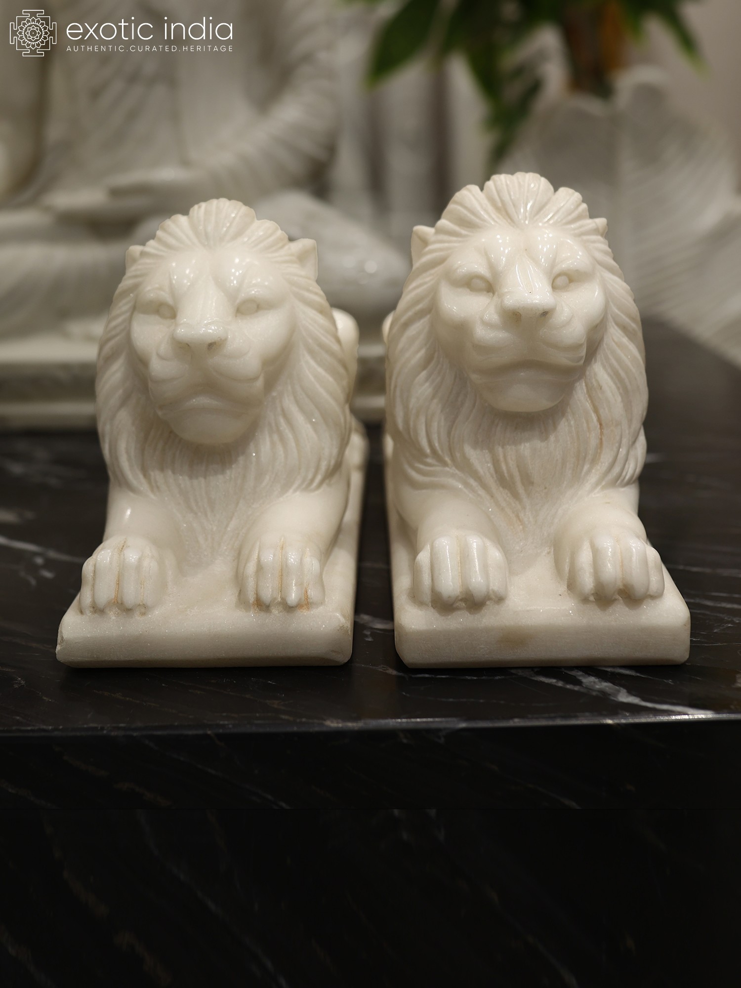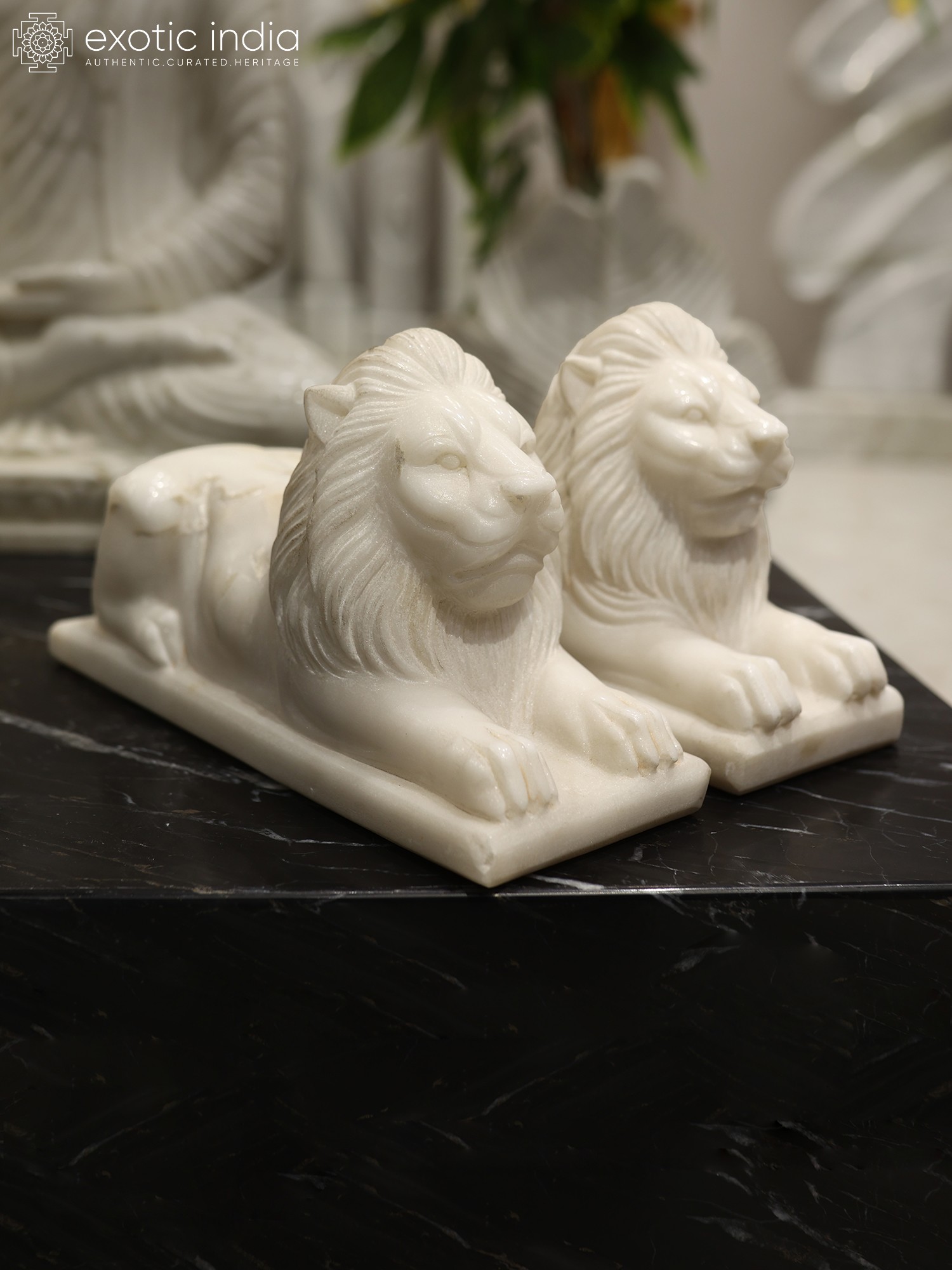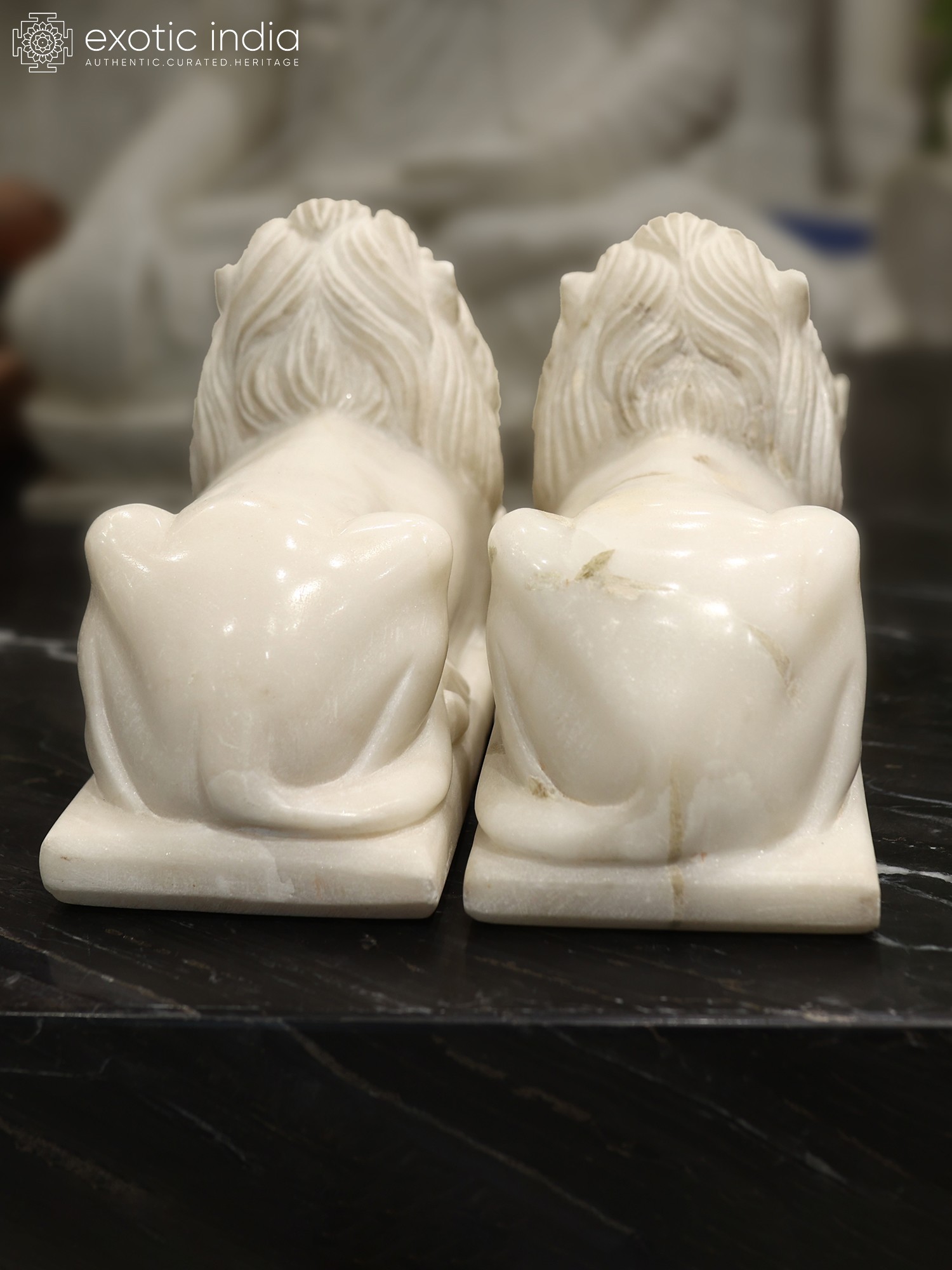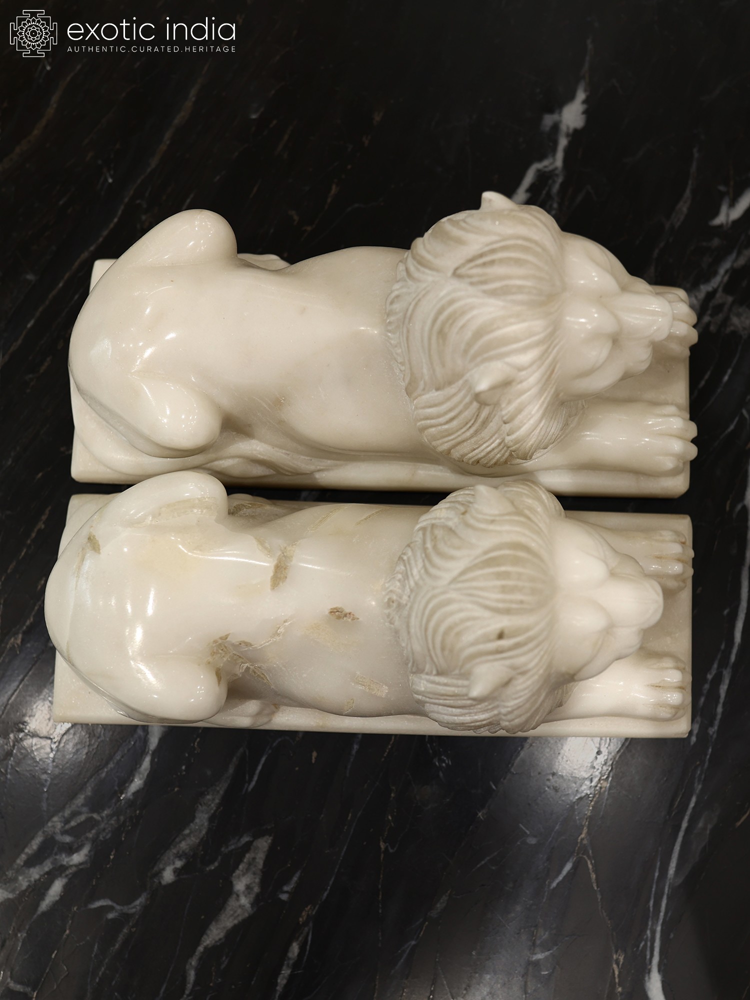 12" Symbol of Guardianship - Pair Statue of Lion | Home Decor | White Marble | Excellent Indian Art