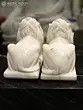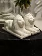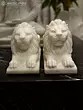 Introducing a pair of magnificent lion statues, meticulously carved from pure, natural white marble. These striking figures stand as potent symbols of strength, courage, and royalty, bringing an air of distinguished grandeur to any space. Each lion is rendered with an impressive attention to detail, from the flowing mane that frames their noble faces to the powerful, resting posture of their paws. The smooth, cool touch of the marble and its subtle translucence invite admiration, hinting at the artistry and dedication involved in their creation.