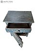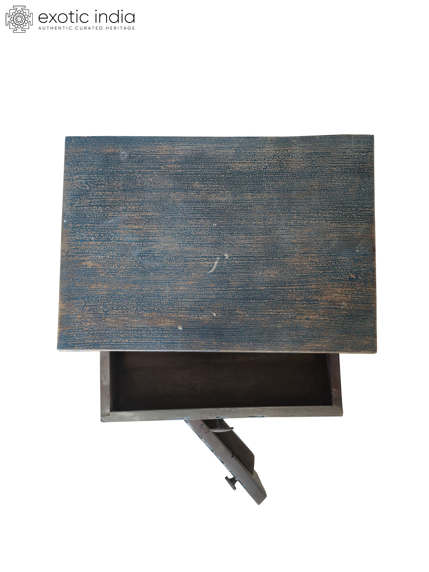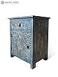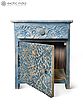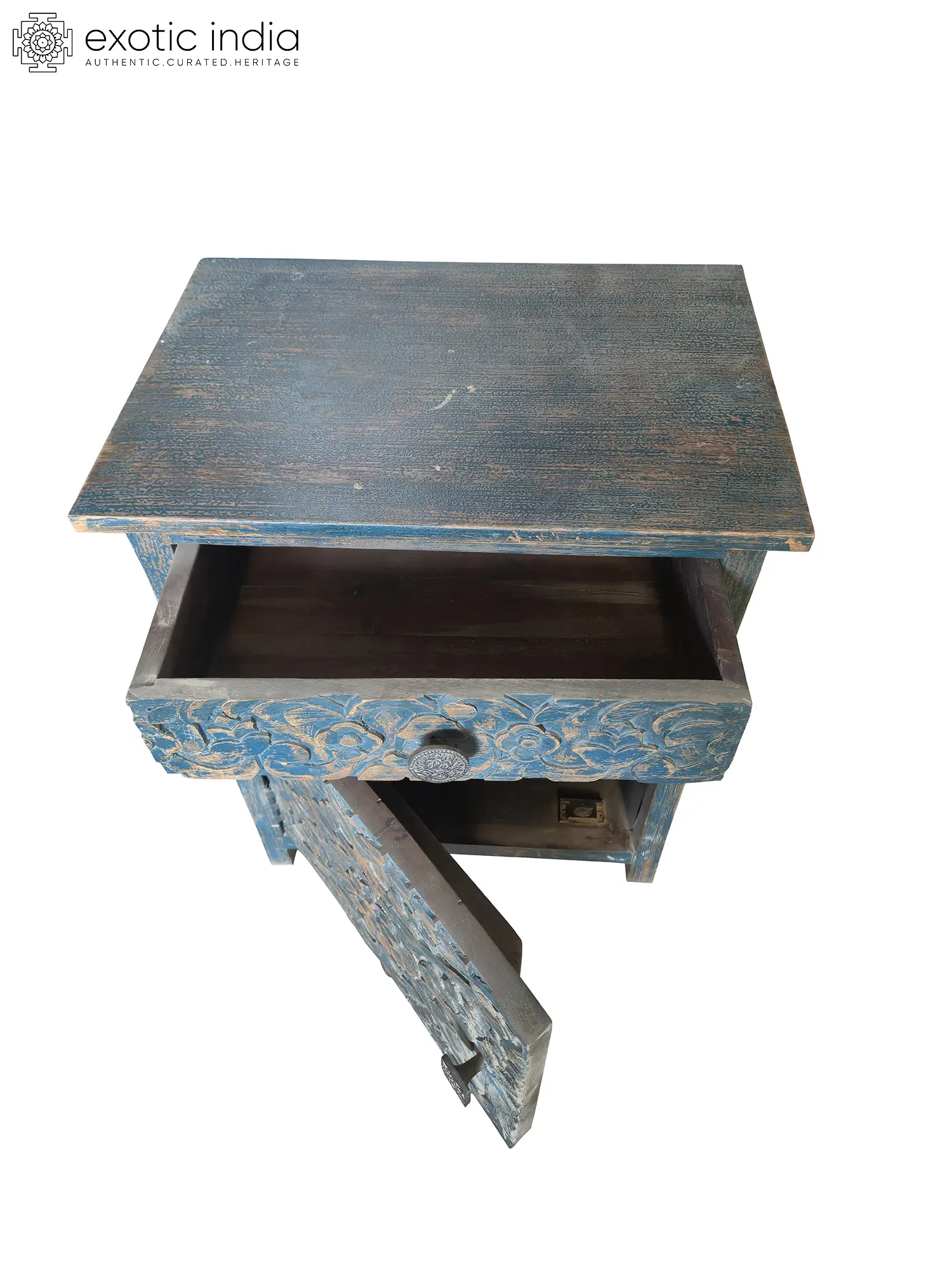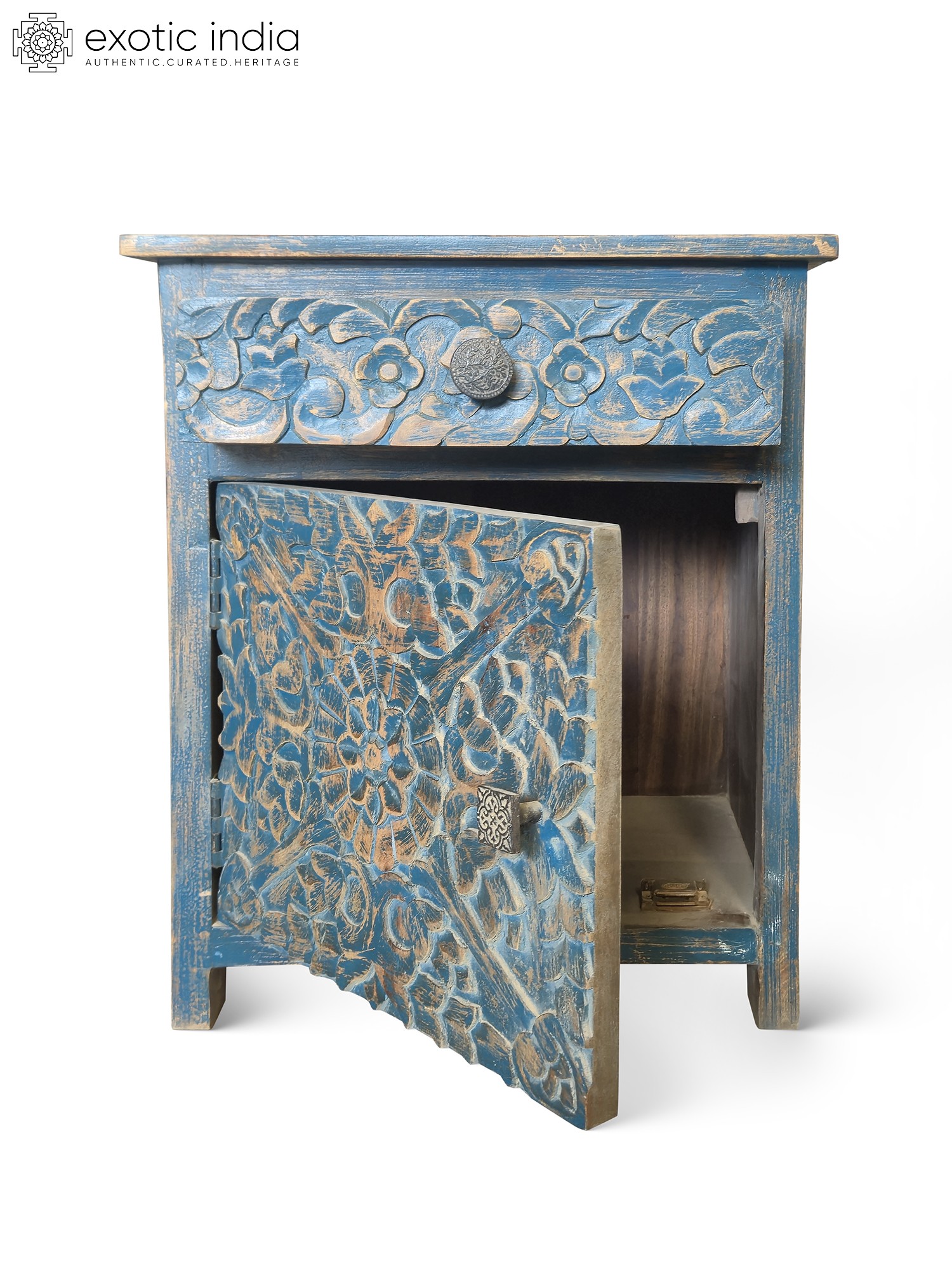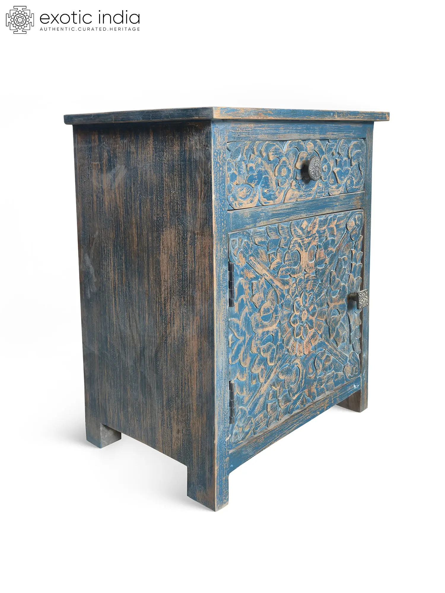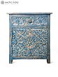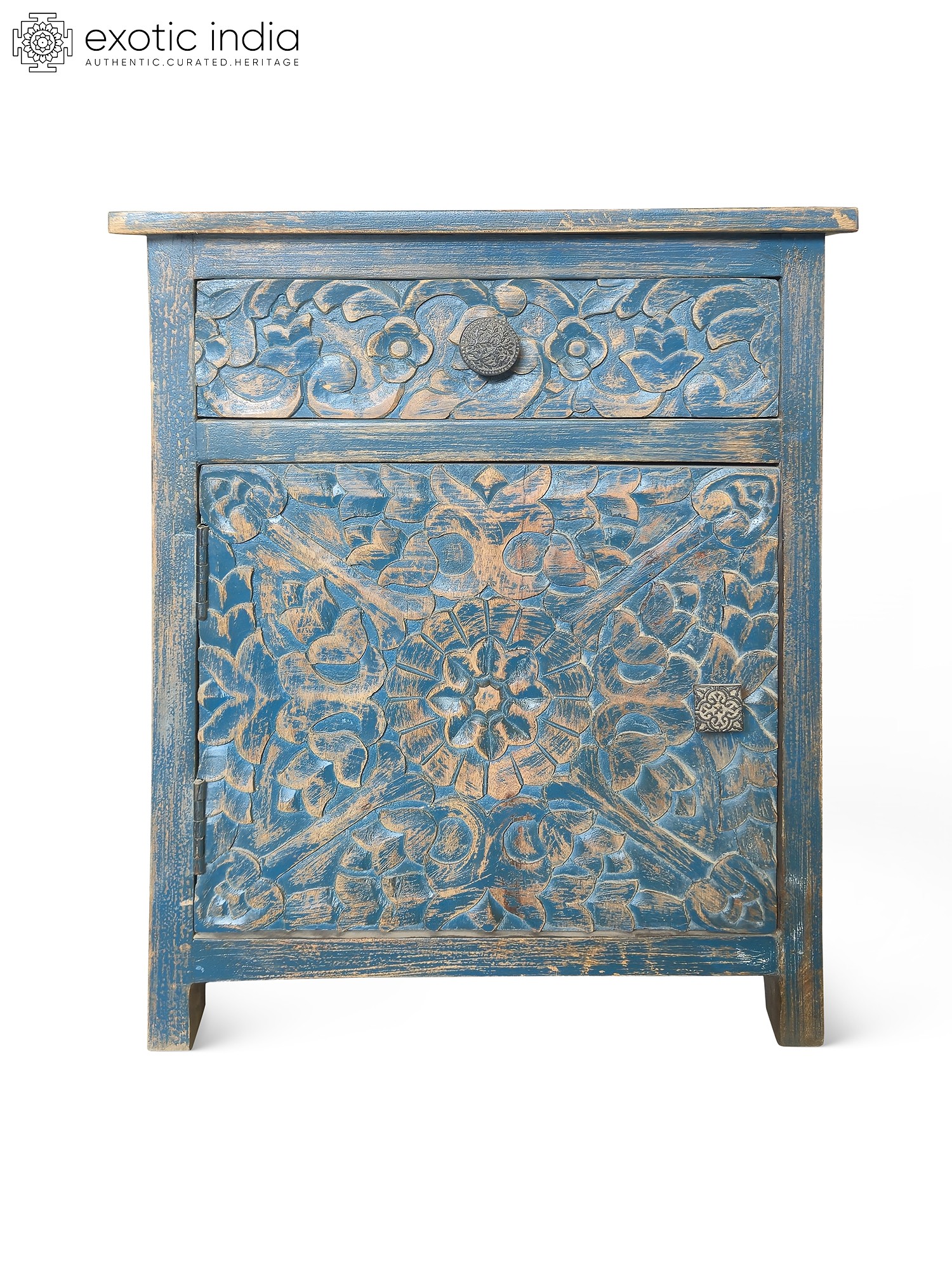 Introducing a piece that effortlessly blends form and function, this exquisite cabinet is a testament to timeless craftsmanship and artistic detail. Crafted from rich mango wood, it boasts a captivating vintage aesthetic, immediately drawing the eye with its distressed blue finish. This unique coloration, with hints of the natural wood peeking through, creates a sense of history and character, making it a standout addition to any room. The surface is adorned with intricate, hand-carved floral motifs that wrap around the single door and the drawer front, showcasing the skill and dedication of the artisans who brought this piece to life.