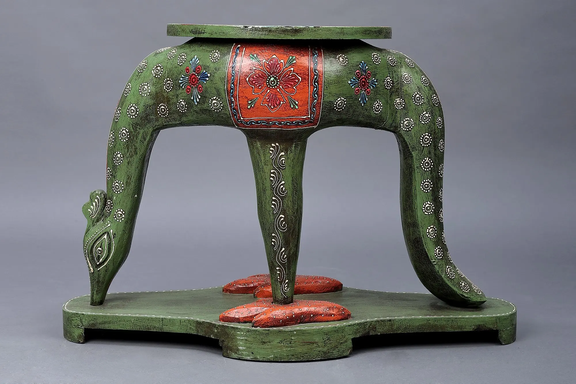 Be unique, be real and step into a realm of artistic marvel with this Decorative Hand Painted Wooden Peacock Table—the epitome of uniqueness and elegance. This extraordinary table, an embodiment of the Jodhpur style of furniture painting, showcases intricate white floral patterns and dots arranged in a mesmerizing Rangoli, echoing the tradition of Alpana. The vivid palette, reminiscent of Rajasthani Meenakari's work, enhances the table's allure. The otherwise prominent green color of the piece is symbolic of growth and fertility. Crafted as a peacock gracefully drinking water, the exquisite tail is adorned with delicate dotted designs. The table top rests on the majestic back of the peacock, making it not just a piece of furniture but a masterpiece of cultural artistry.
