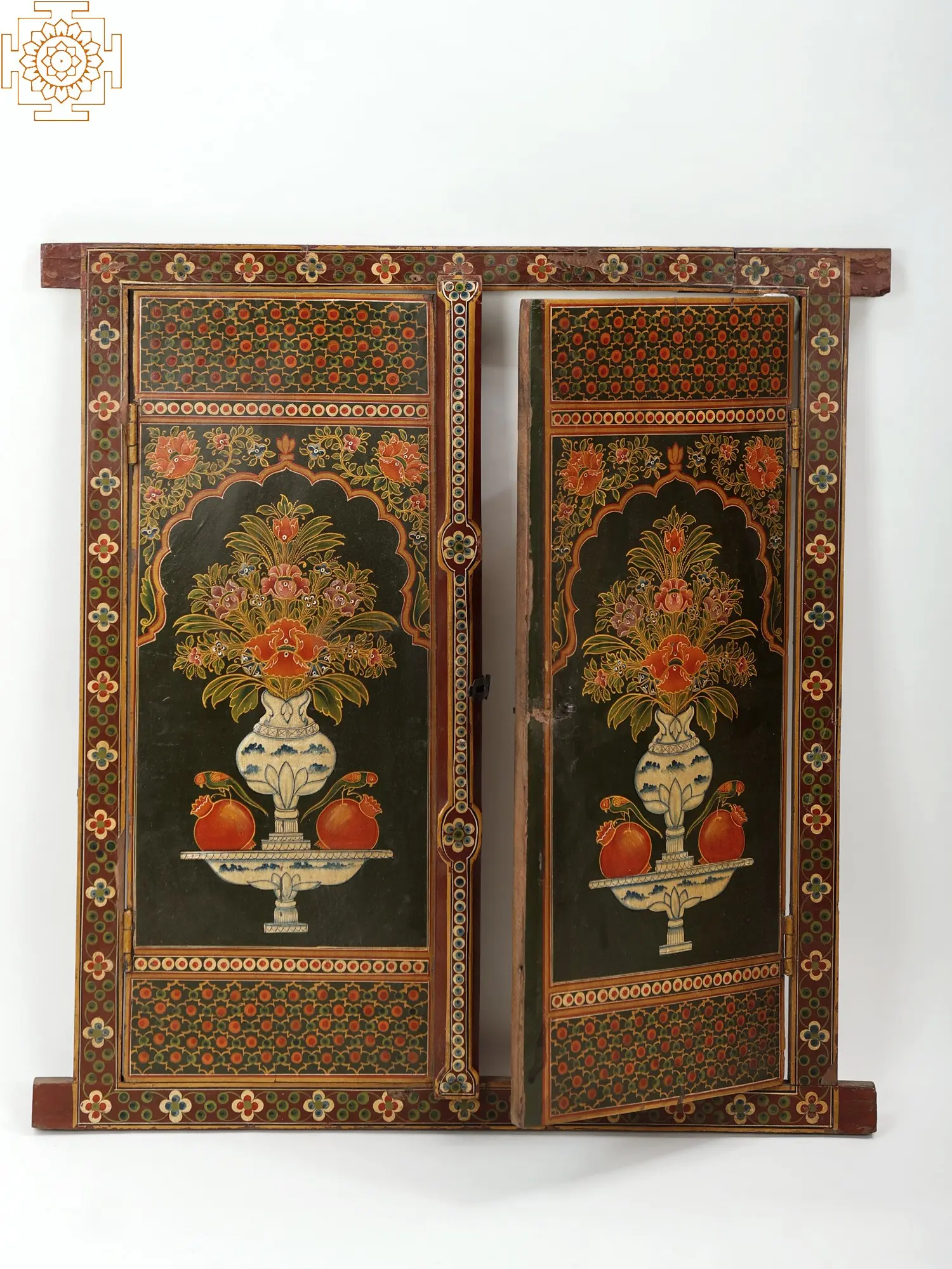 This vibrant wooden window is hand-painted by skilled artisans. Two identical cream coloured ceramic vases have been made in two layers in very attractive and pleasing designs. The lower one is shown as a bowl on which two fruits are placed, and the upper layer is standing on the lower layer like a fountain, decorated with exotic flowers and leaves. Both the bouquets are looking very attractive placed side by side on the wooden top. This unique article is certainly for your living room.