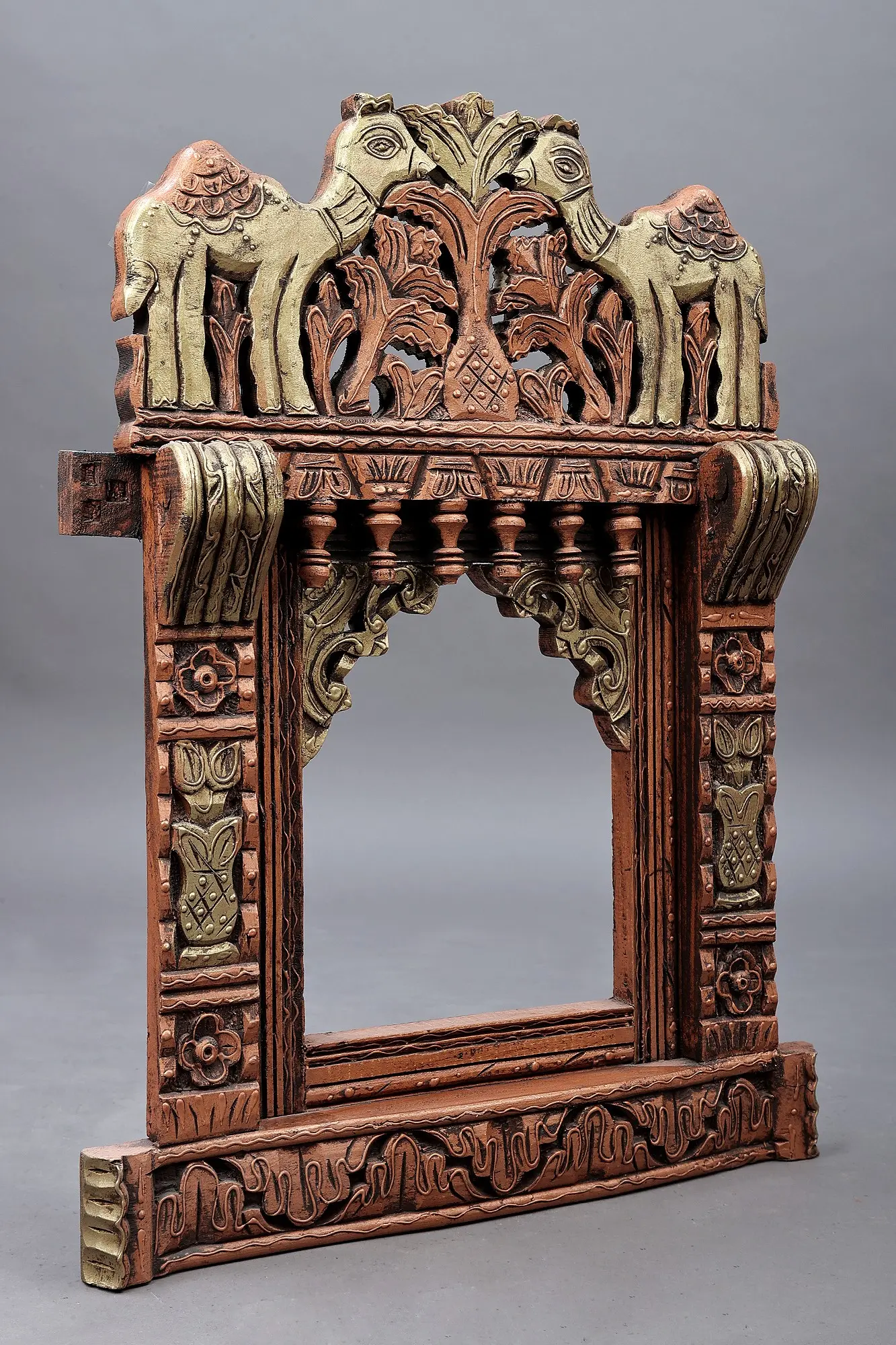 This jharokha (window is carefully carved by hand from mango wood to feature an impressive level of detail. Delightful in its innate form, the silver-colored pair of protecting young camels adds an elegant look to this pleasing sculpture. The design, rendered as the principal entrance gate of a Rajputi citadel, and unprecedented carving of flowers, leaves, and a pair of urns (kalash), the vibrant light brown and silver shades shining with quality polish, enhance its majesty. An exclusive and unique item for your dwelling.