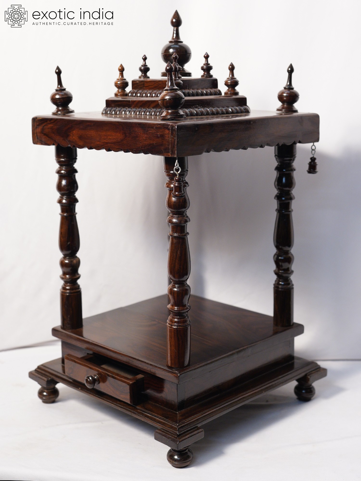 Beyond its aesthetic appeal, this temple is designed with functionality in mind. A smoothly gliding drawer is discreetly incorporated into the base, providing convenient storage for prayer beads, incense, scriptures, or other essential items, keeping your sacred space organized and clutter-free. Miniature bells are affixed to the corners of the roof to create a peaceful, meditative atmosphere. The turned legs provide a stable base and elevate the temple, allowing it to be the focal point of the space. The decorative embellishments atop the temple add to its exquisite charm, creating a sense of timeless beauty.