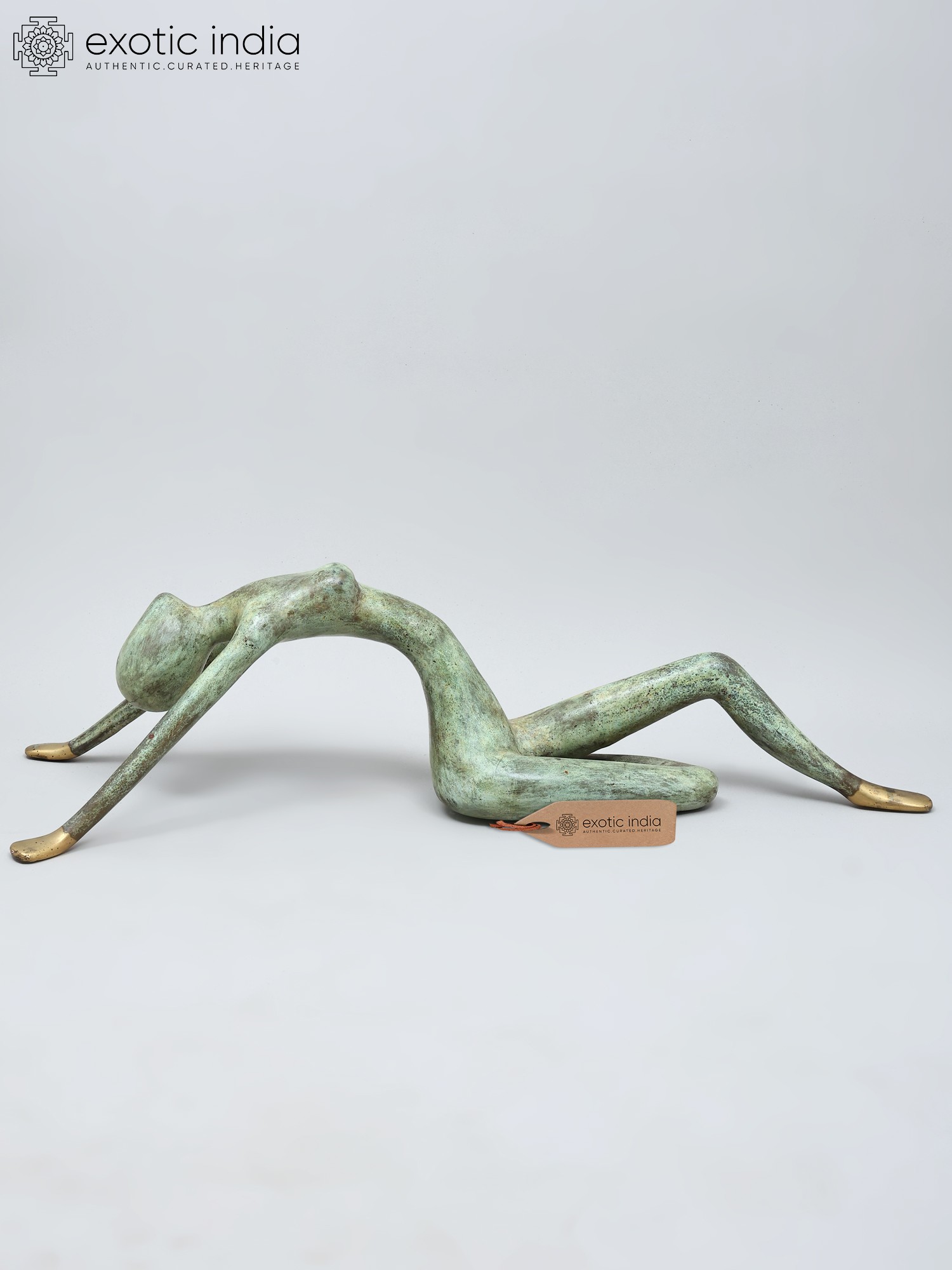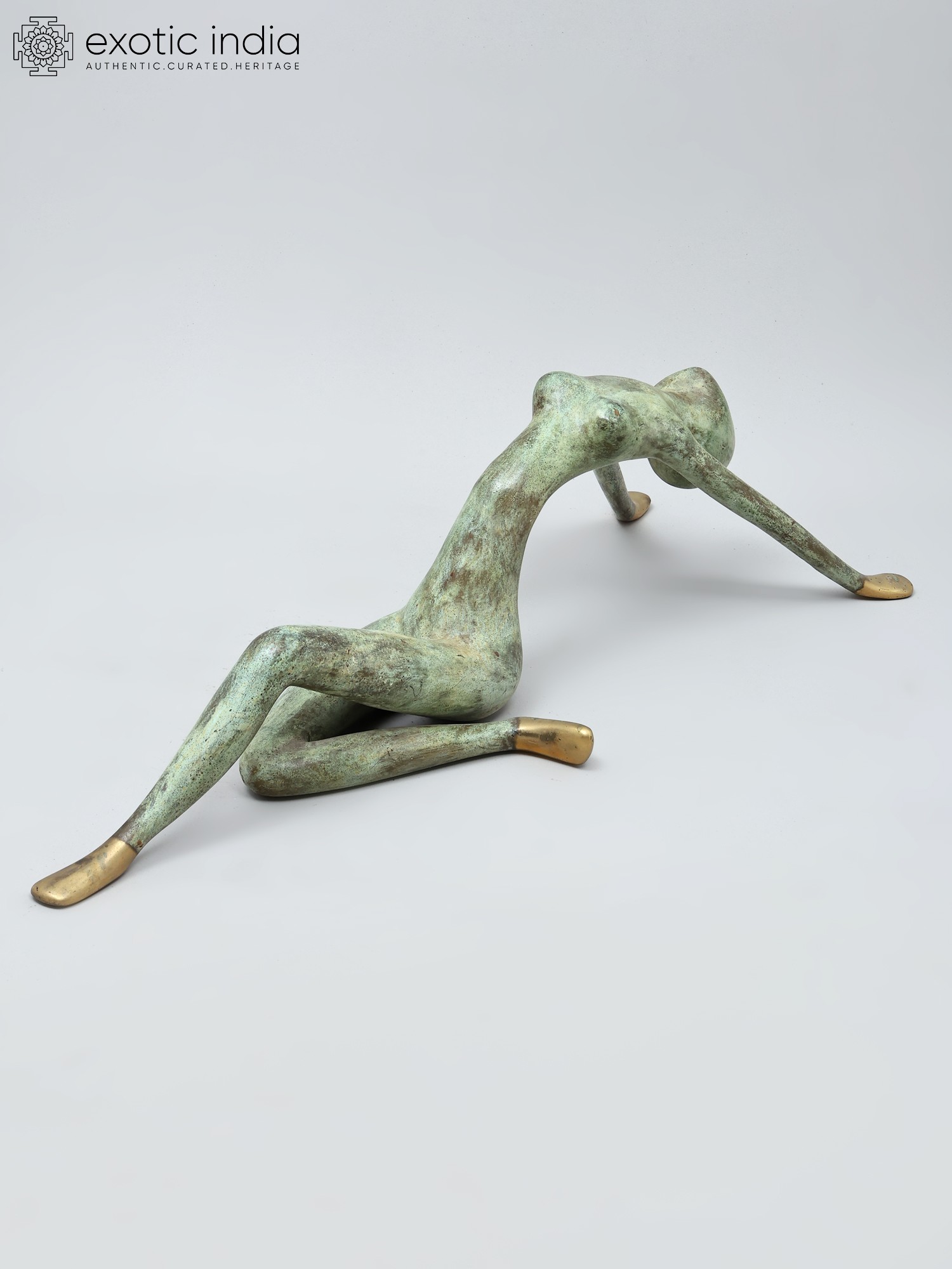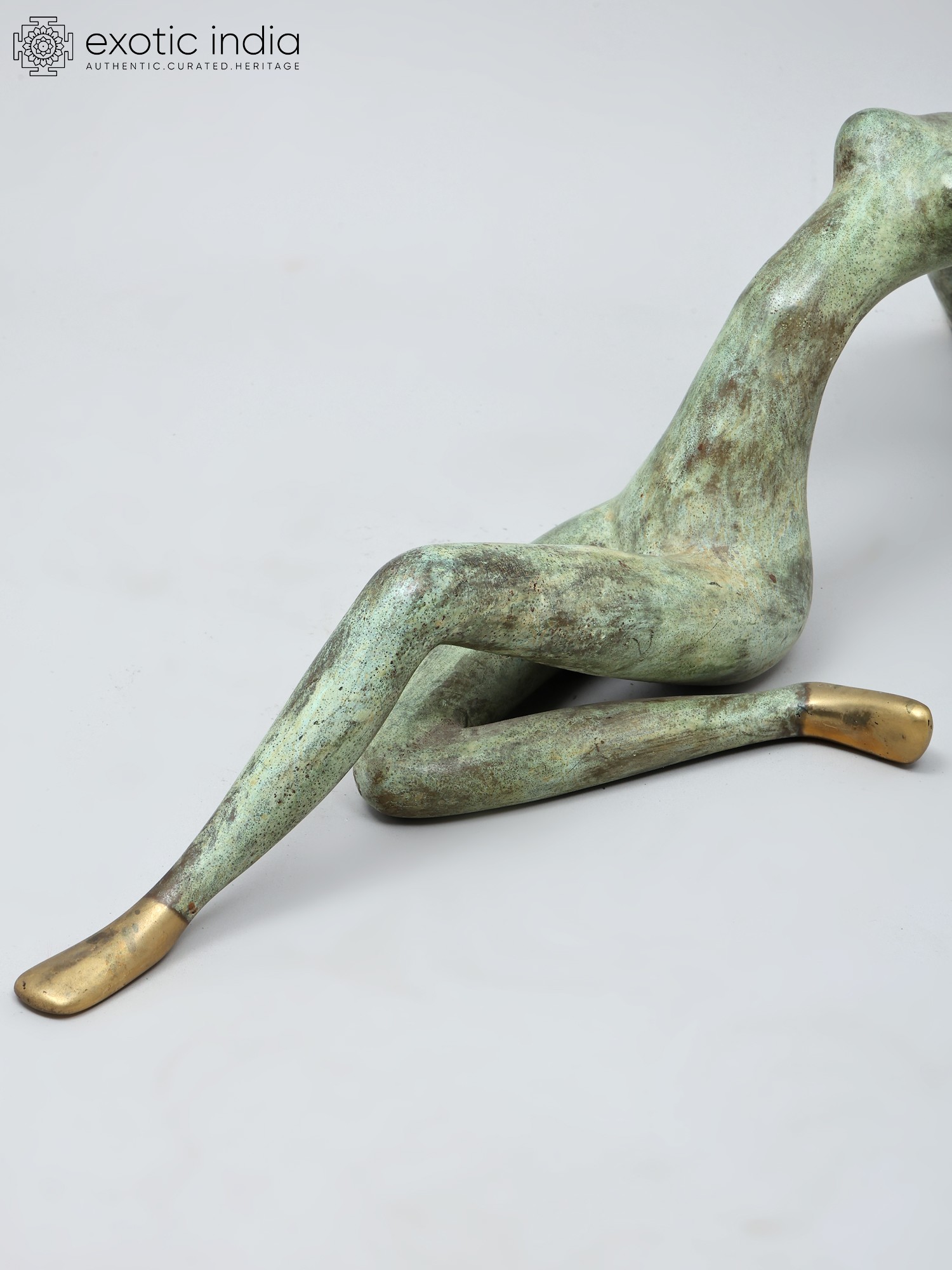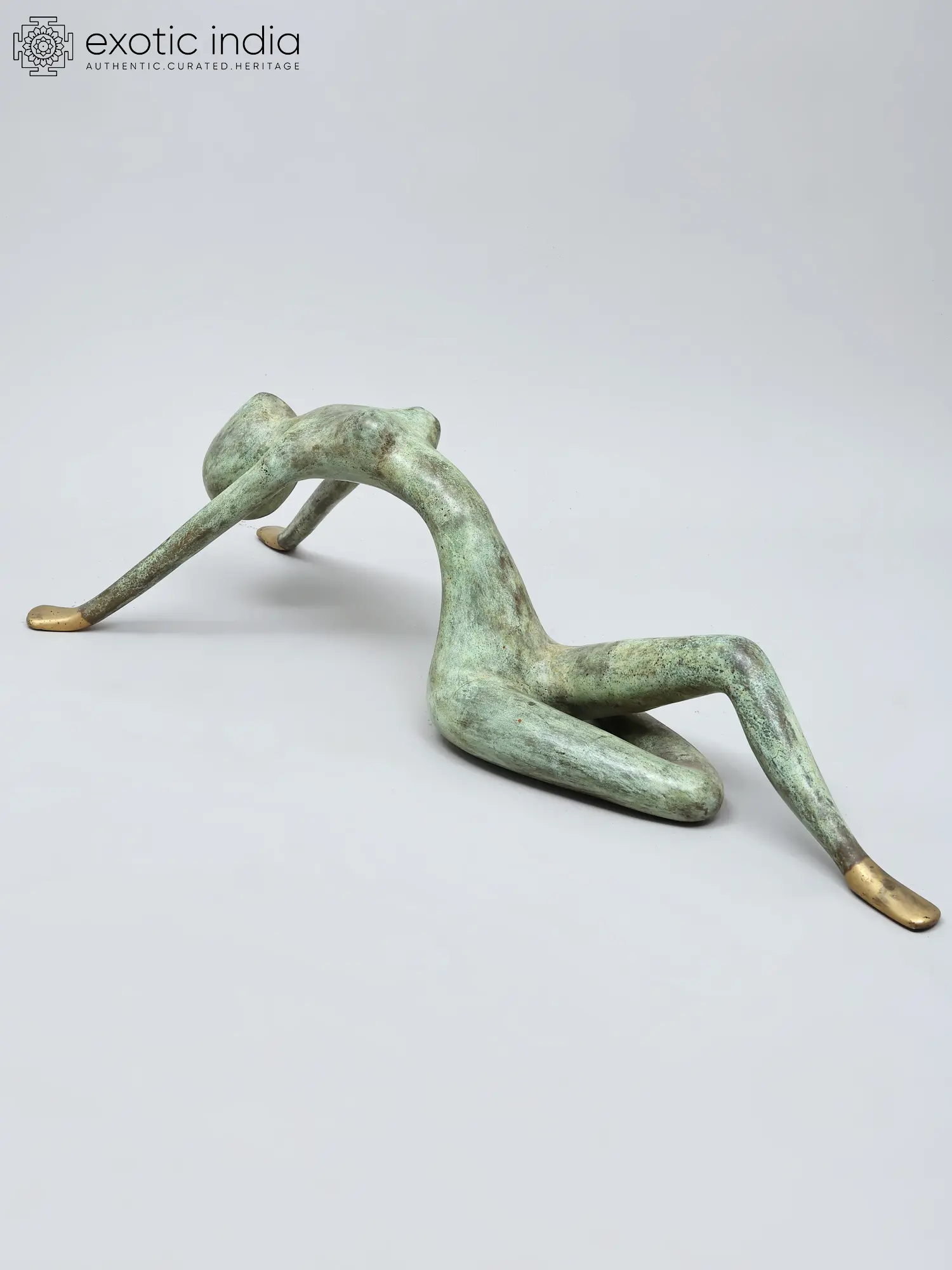 This exquisite brass sculpture captures a moment of profound calm and fluid motion, embodying the essence of contemporary artistry. The stylized female form is rendered with a grace that suggests a deep connection to the inner self, making it a perfect addition to any space seeking serenity and aesthetic appeal. The verdigris patina, achieved through meticulous craftsmanship, lends an antique charm and a tactile richness to the piece, while the polished brass accents on the extremities of the figure provide a striking contrast, drawing the eye and highlighting the dynamic pose.