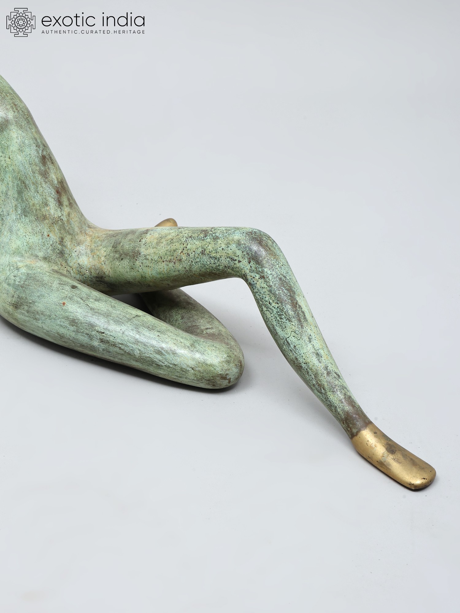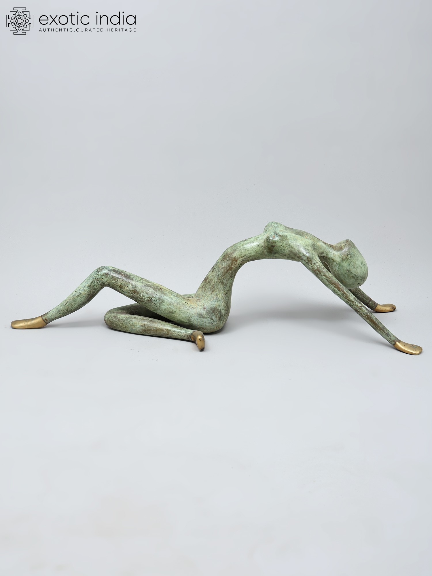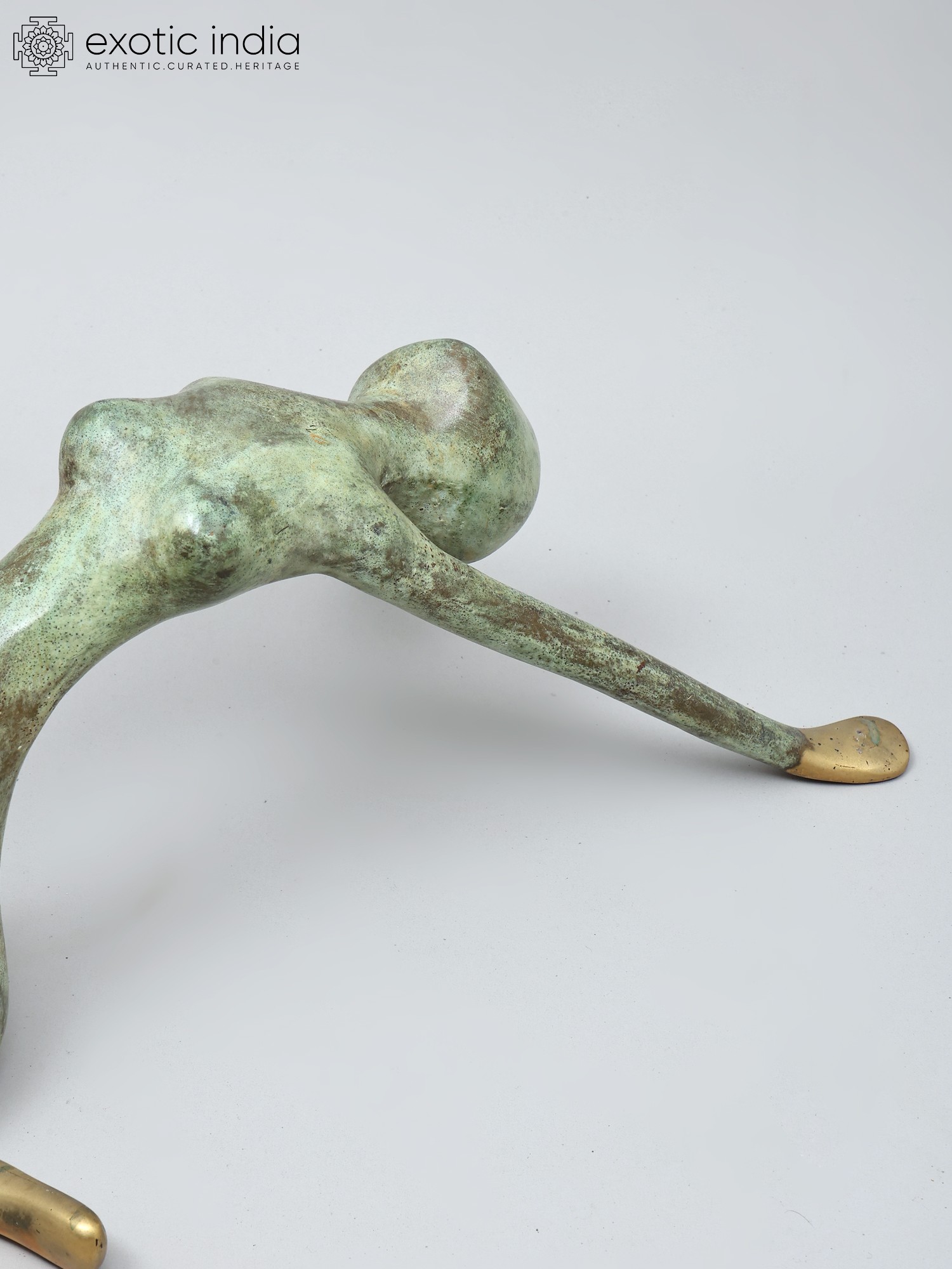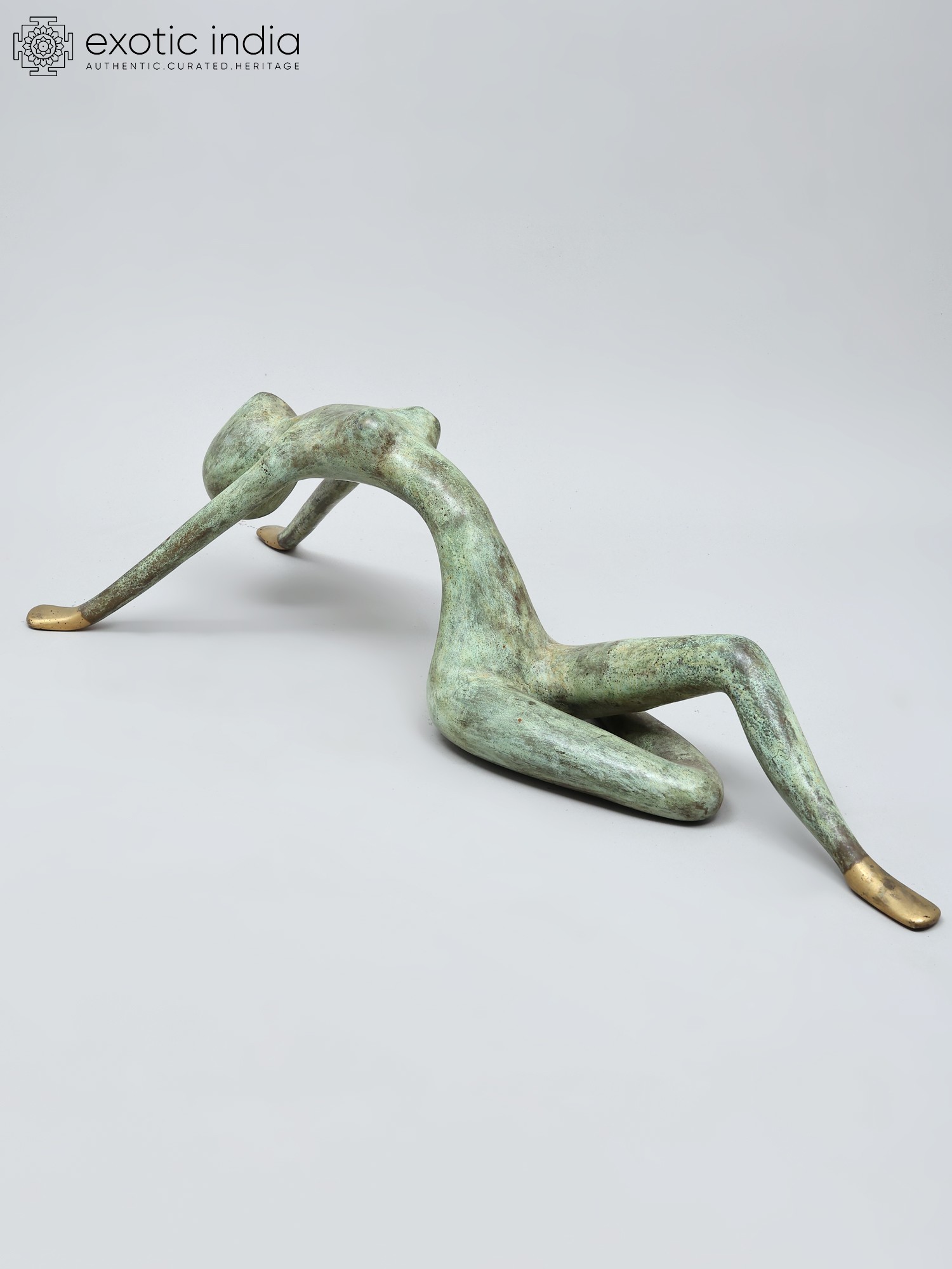 This exquisite brass sculpture captures a moment of profound calm and fluid motion, embodying the essence of contemporary artistry. The stylized female form is rendered with a grace that suggests a deep connection to the inner self, making it a perfect addition to any space seeking serenity and aesthetic appeal. The verdigris patina, achieved through meticulous craftsmanship, lends an antique charm and a tactile richness to the piece, while the polished brass accents on the extremities of the figure provide a striking contrast, drawing the eye and highlighting the dynamic pose.