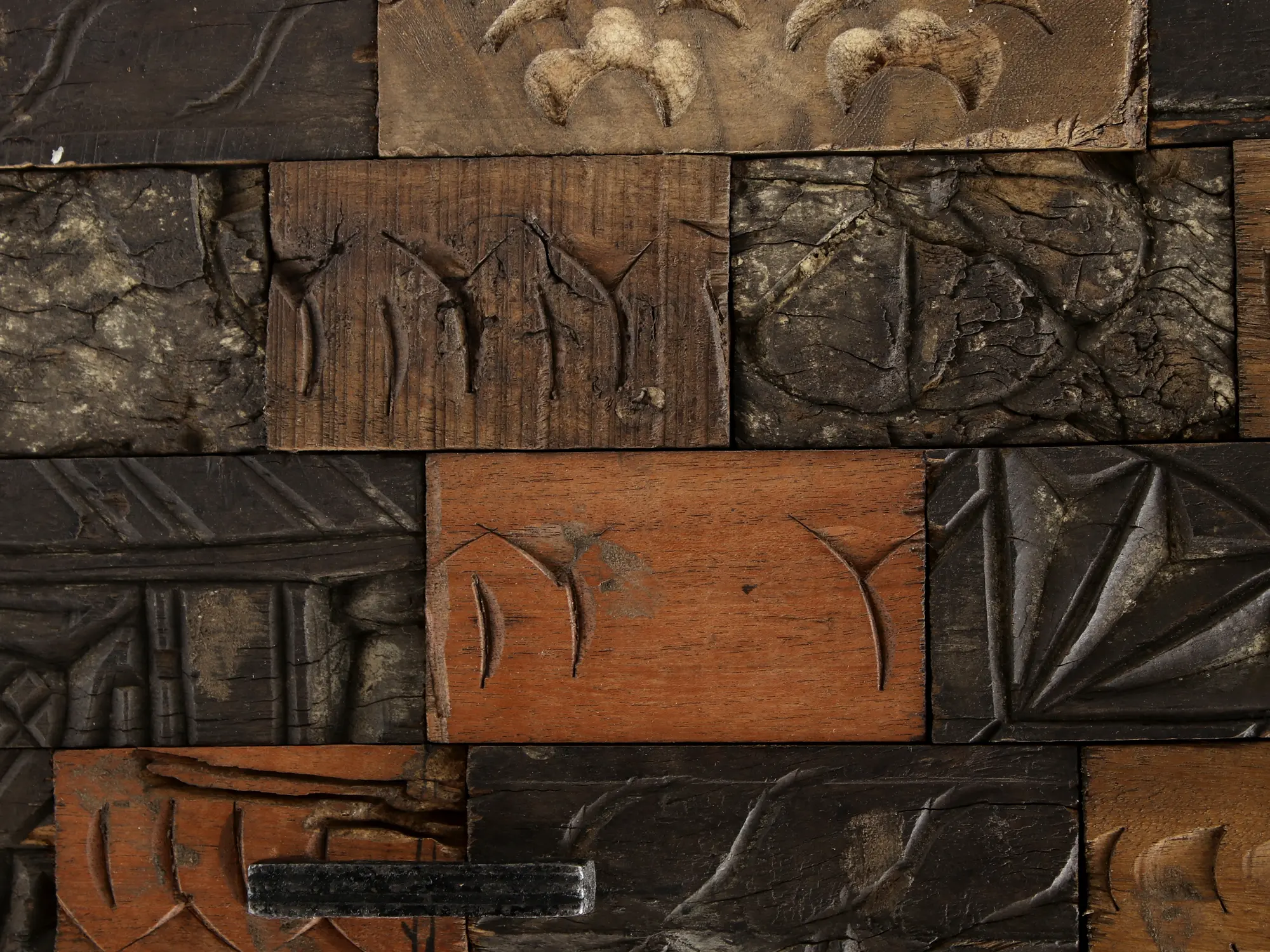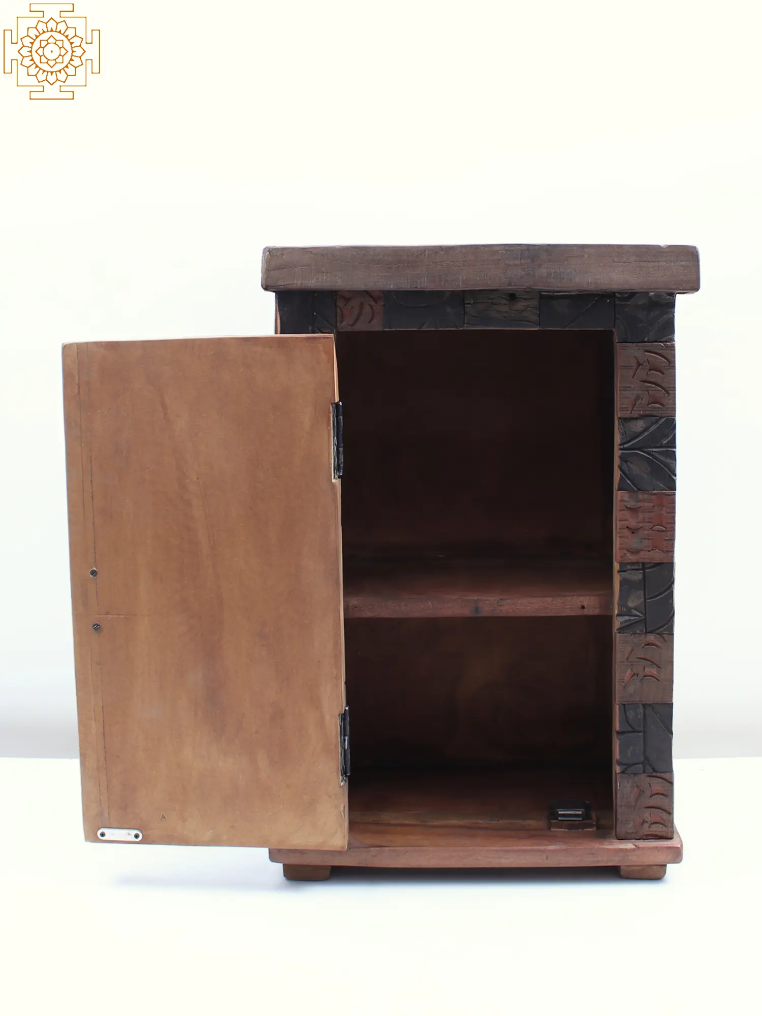Bring a touch of rustic charm and artisanal craftsmanship into your living space with this unique wooden cabinet. Each piece of wood used in its construction tells a story, showcasing a captivating mosaic of textures and carved patterns. The front panel is a testament to skilled handiwork, with a dynamic arrangement of wooden blocks, each featuring a distinct carved motif. From geometric shapes and floral designs to abstract swirls and lines, the intricate detailing invites closer inspection and adds a rich visual depth to the piece. The varied shades of wood, ranging from deep, aged browns and charcoals to warmer, natural tones, further enhance its character and create a visually compelling surface.
