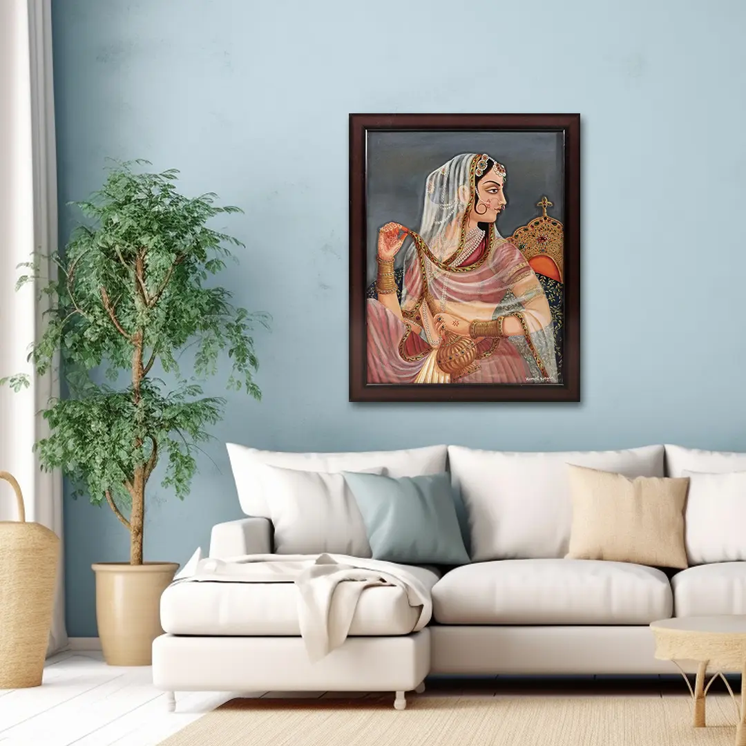 A royal woman, who recently wed a noble king, waits earnestly for her husband. Longing for her husband’s love she sits elegantly on a seat of red velvet and brocade cushions embellished in jewels. She directs her gaze to the left side, gaping outside the window, waiting for her lover’s return. In this oil painting, she lacks neither beauty nor grace. She is depicted in a pink slipover the sheer dupatta tastefully shows her bodice. Her long pearl necklace reaches her abdomen, sheer and plain snow-white that barely covers her shyness, accentuates her waistline even more. In her left hand, she modishly holds a Persian pedestal lamp which is covered and flecked in gemstone work. The basic pink garments easily blend with murky background. Covered in ivory silk with sufficient brocade, the artist triumphantly enhances the adornments she carries. Her hair ornaments, rings, arm bracelets: bindi on the forehead, henna on her palms, fingers and kohl outlining her eyes beautifies her ethnicity. Her appearance is perfect in necklaces, earrings, nose ring, and amulets. Portrait of the royal lady with its brilliant colours and royal appearance, reveals the newlywed's sensuality, evoking the essence of Rajasthani culture.