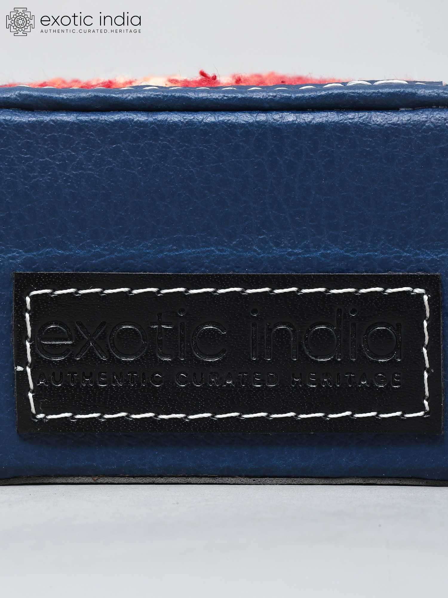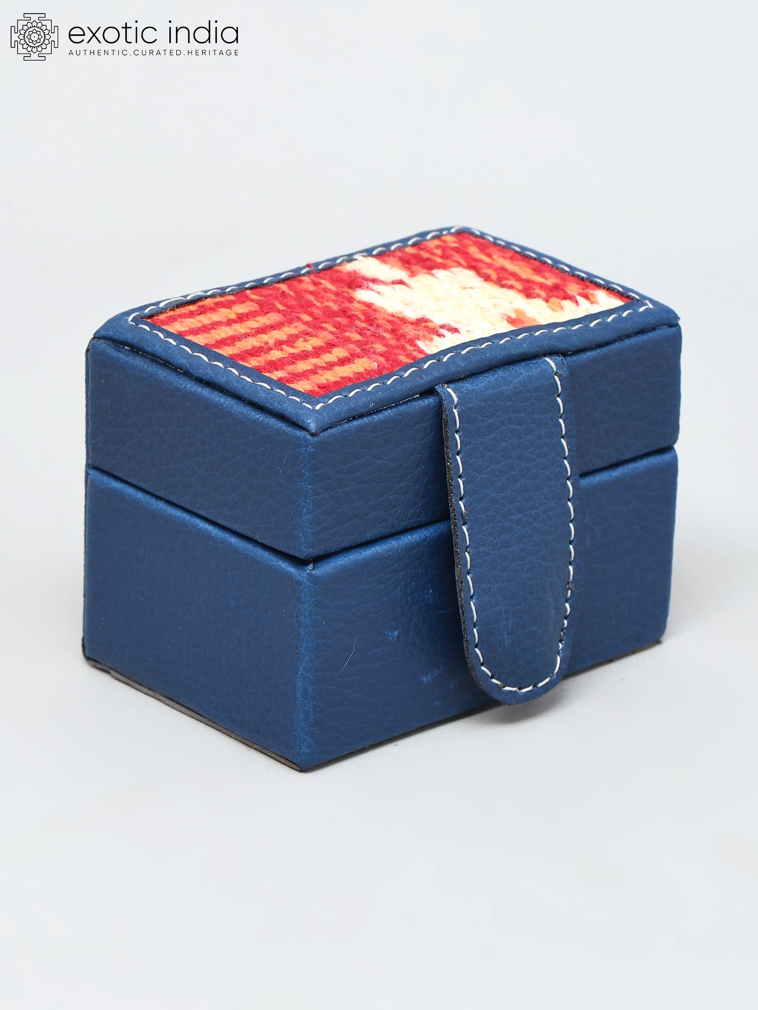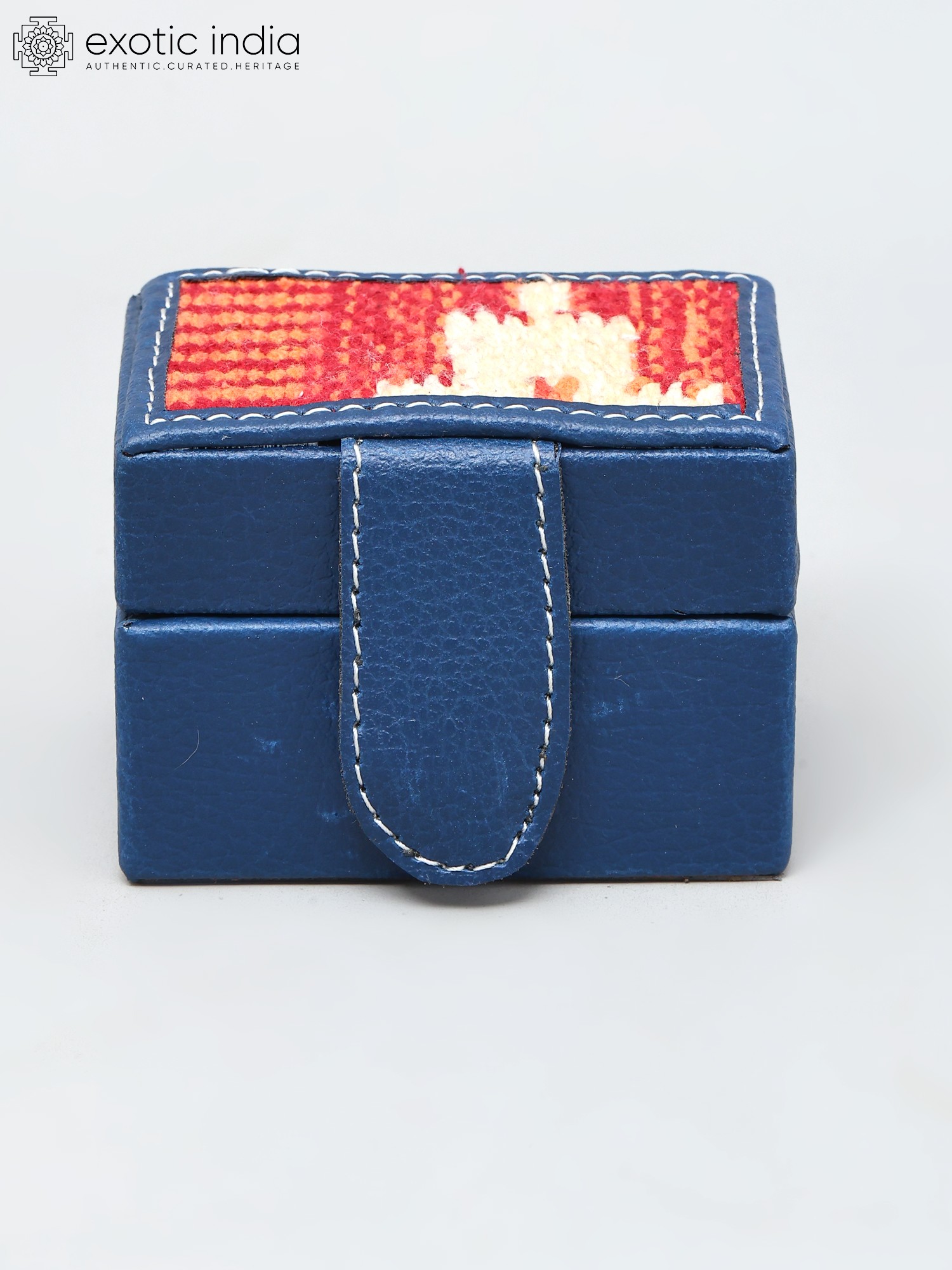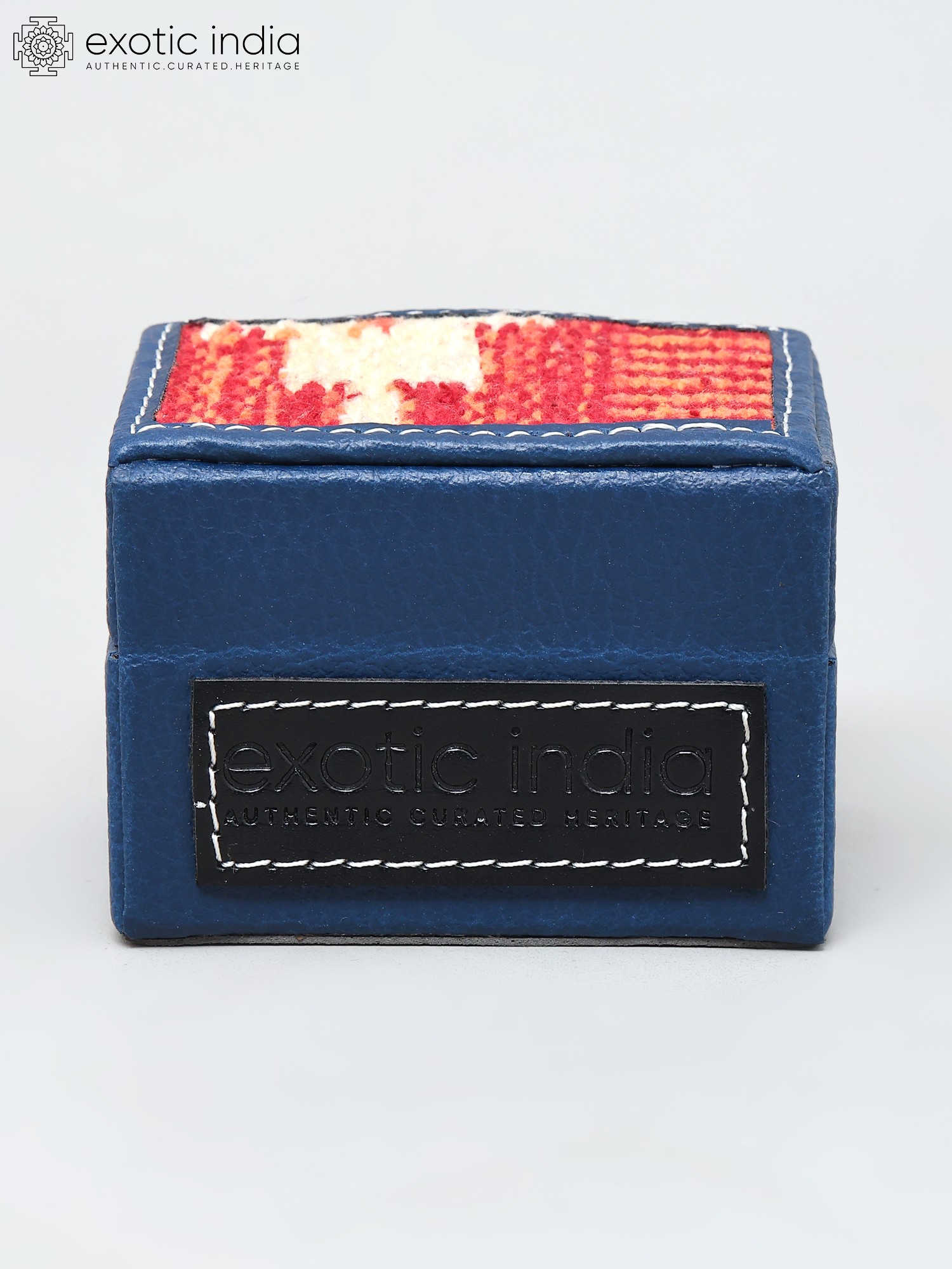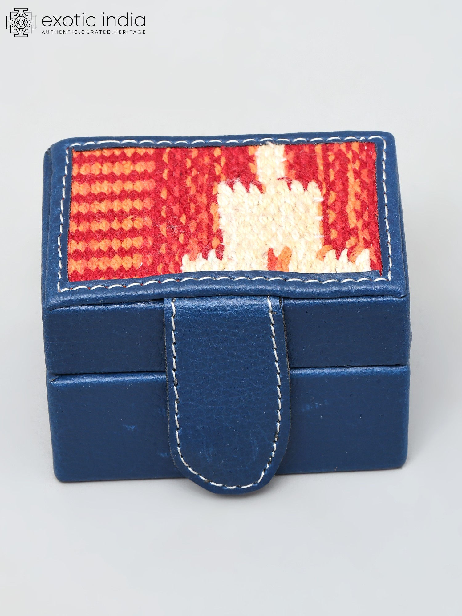 The allure of this compact box is amplified by its captivating lid. A vibrant and intricate tapestry-like textile adorns the top, featuring a dynamic interplay of warm reds, oranges, and creamy whites. This unique embellishment adds a handcrafted feel and a pop of color, transforming the storage box into a miniature work of art. The contrast between the smooth, supple leather and the textured textile creates a visually and tactilely appealing design.