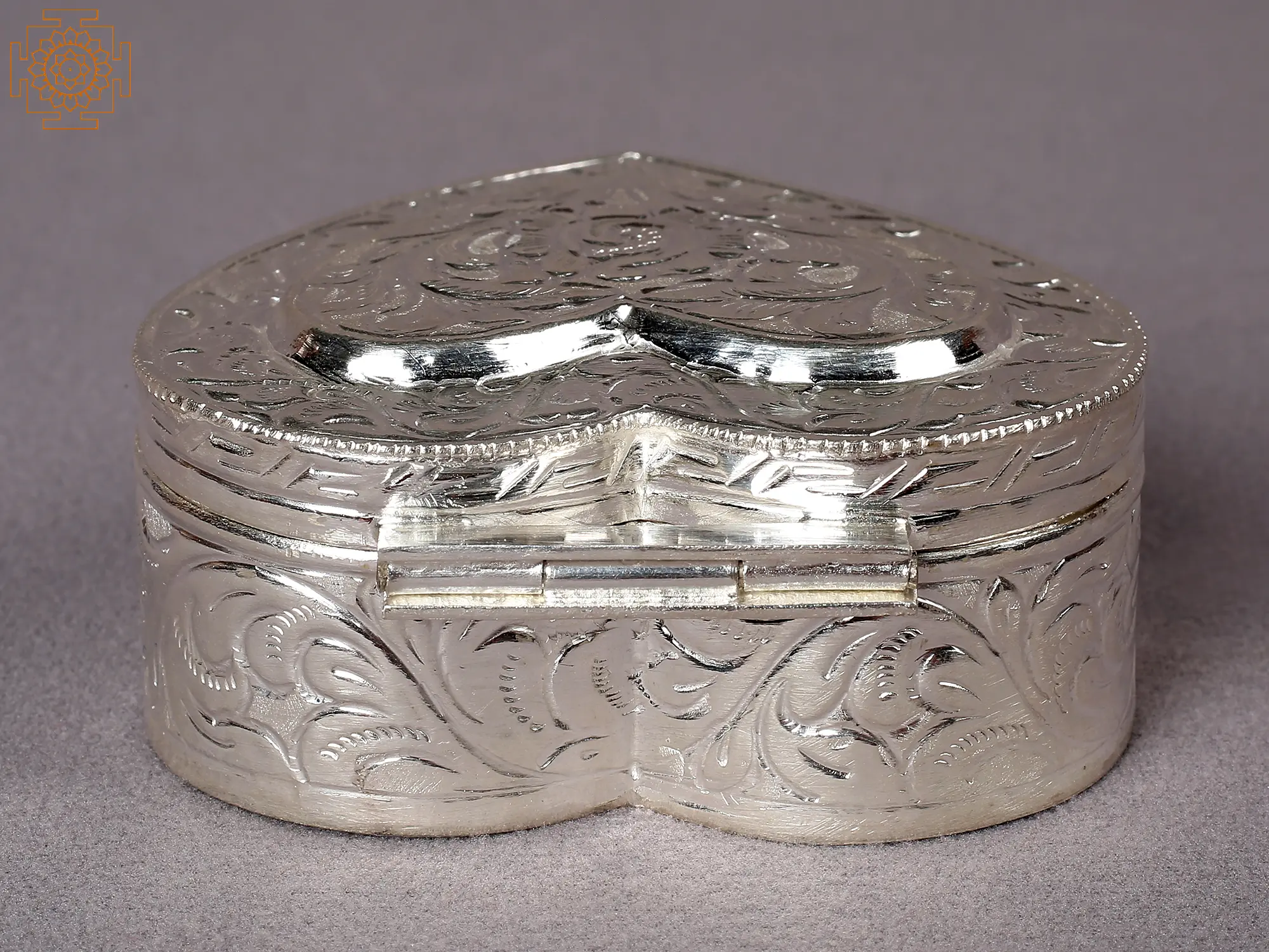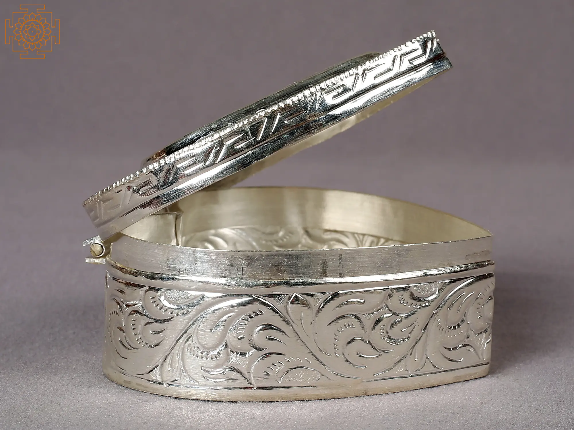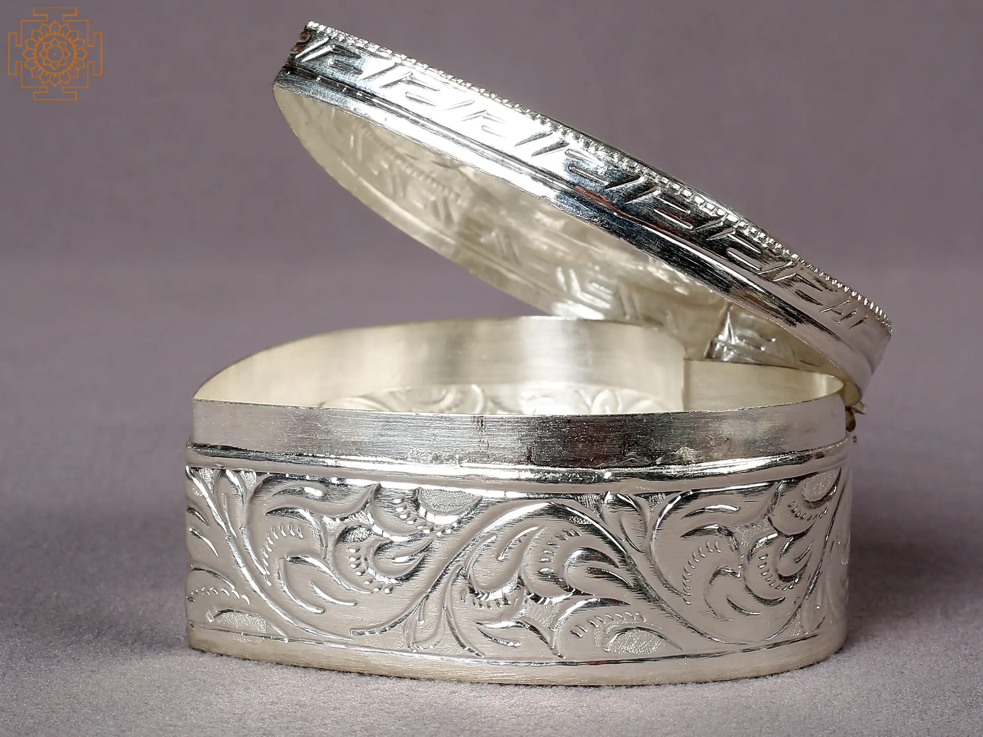 This exquisite Silver Betel Box from Nepal exemplifies the sacredness of silver, a metal revered in various cultures for its purity and spiritual significance. Crafted using the silver repousse technique, this box features intricate designs meticulously hammered into relief from the reverse side.