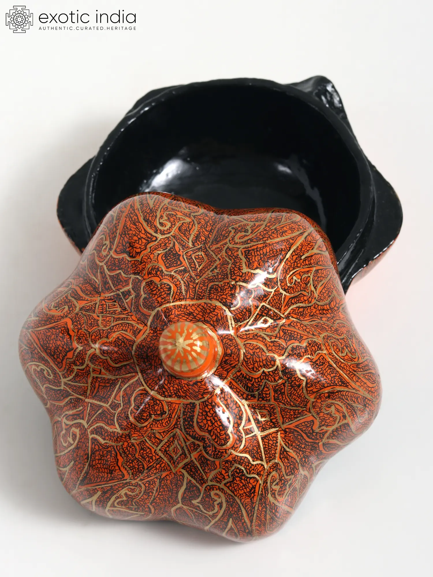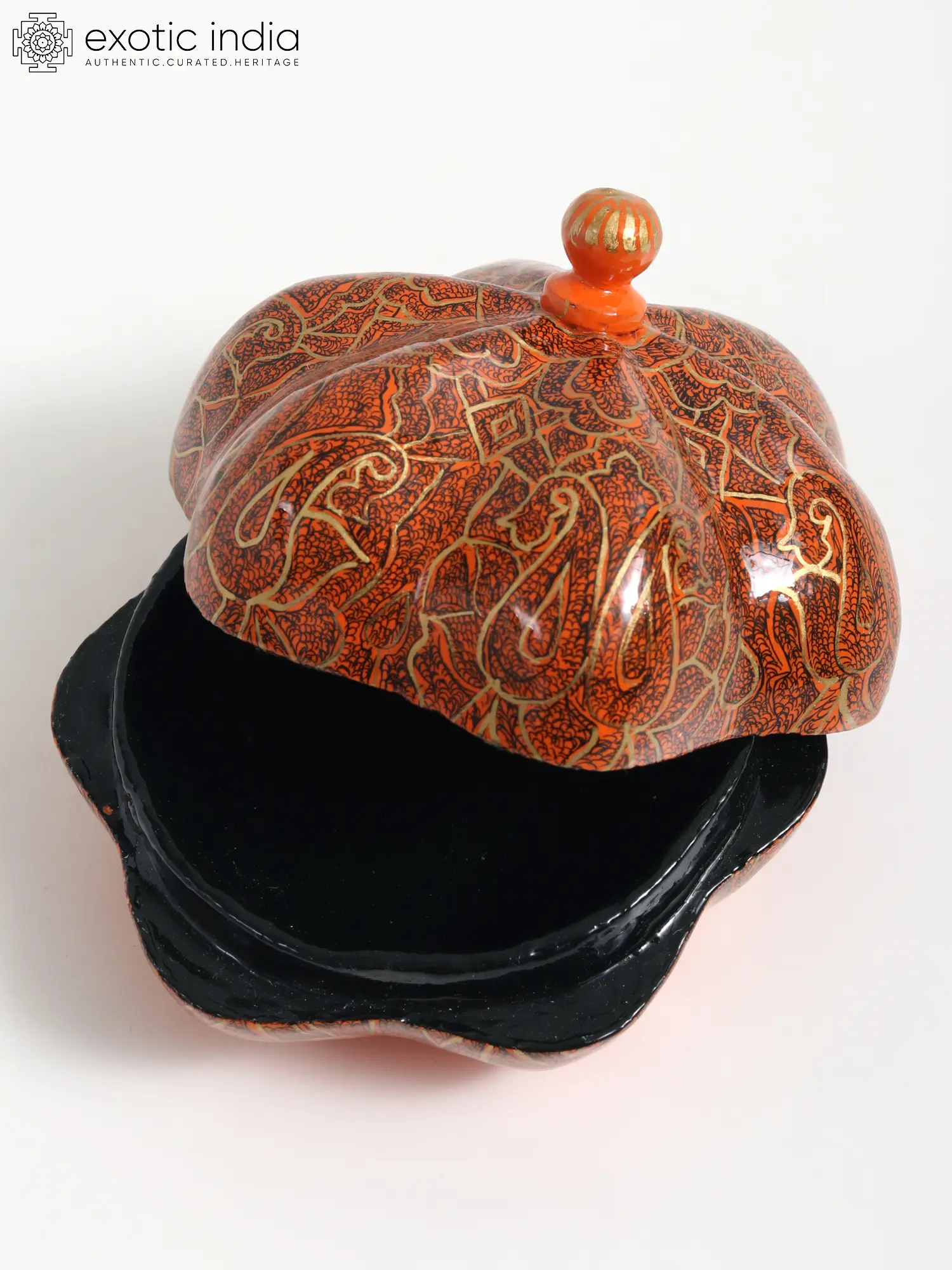 The Papier Mache technique, with its origins in Kashmiri craftsmanship, adds cultural significance to this piece. Not only does it exemplify exquisite artistry, but it also serves as a symbol of resilience and tradition, making this pumpkin-shaped box not just a storage accessory but a testament to the enduring beauty of Kashmiri Papier Mache craft.