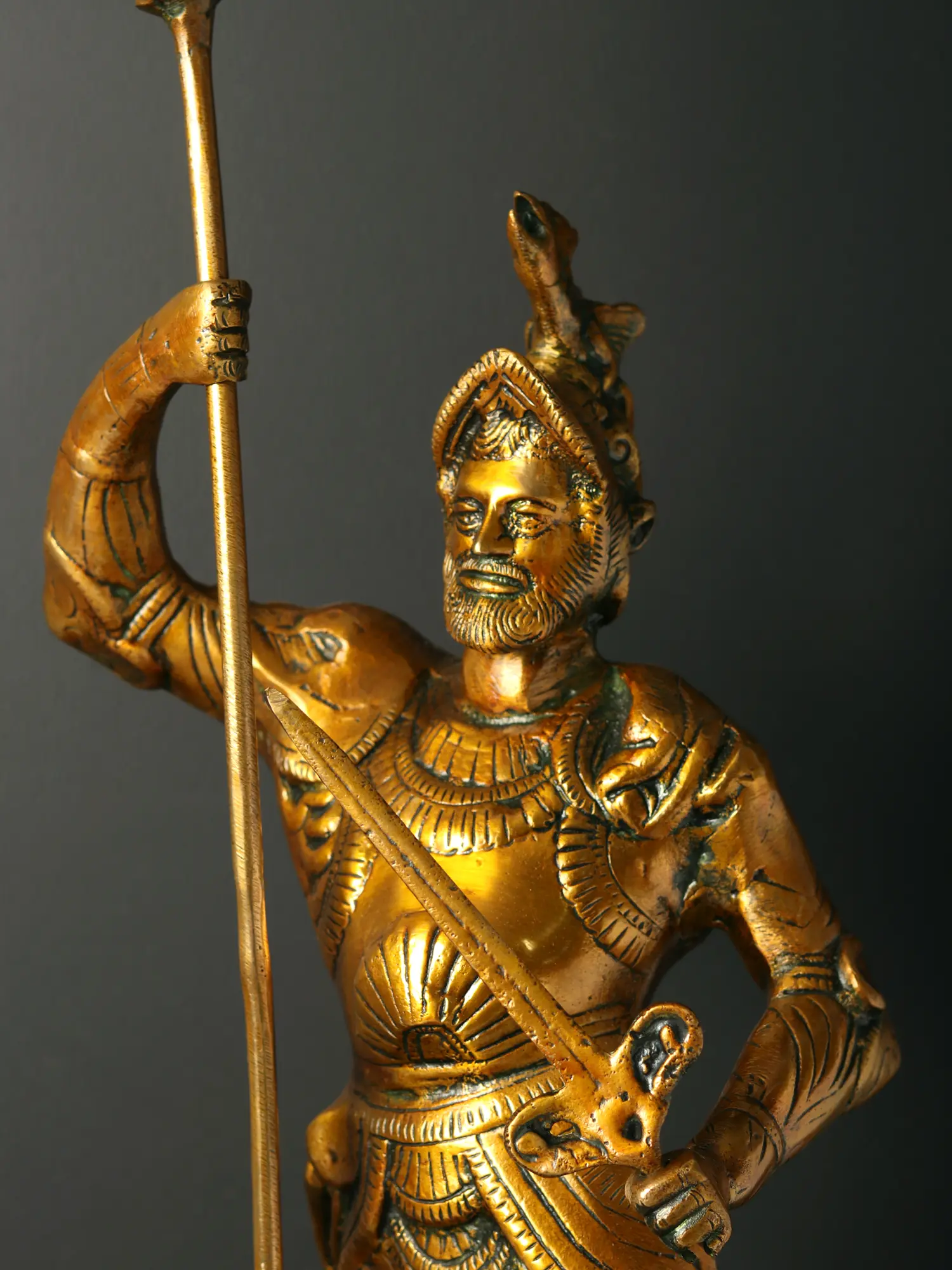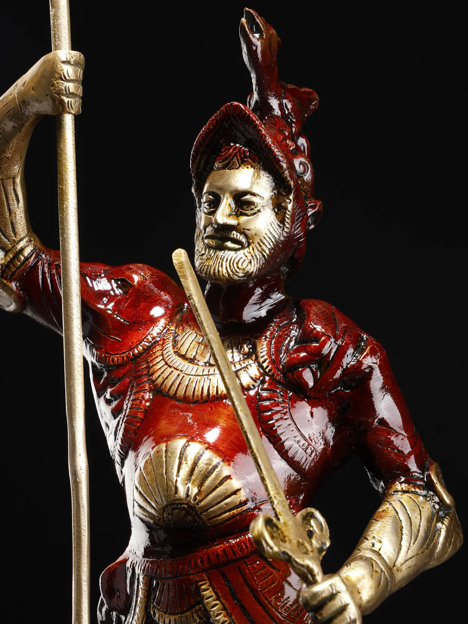 Clad in the traditional garb of a seasoned soldier, complete with the iconic crested helmet, he is a monument to Roman virtue. His stance is resolute, a firm grip on his spear and pike conveying unwavering resolve.