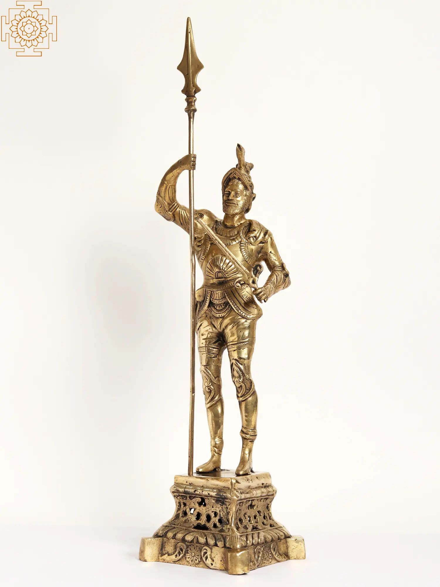 Clad in the traditional garb of a seasoned soldier, complete with the iconic crested helmet, he is a monument to Roman virtue. His stance is resolute, a firm grip on his spear and pike conveying unwavering resolve.