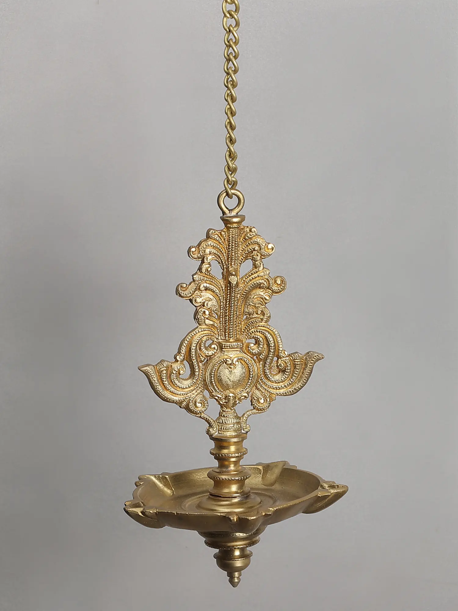 The Hanging Diya with Brass Peacock Bracket is a beautifully crafted traditional oil lamp, designed to add an elegant touch to any space.