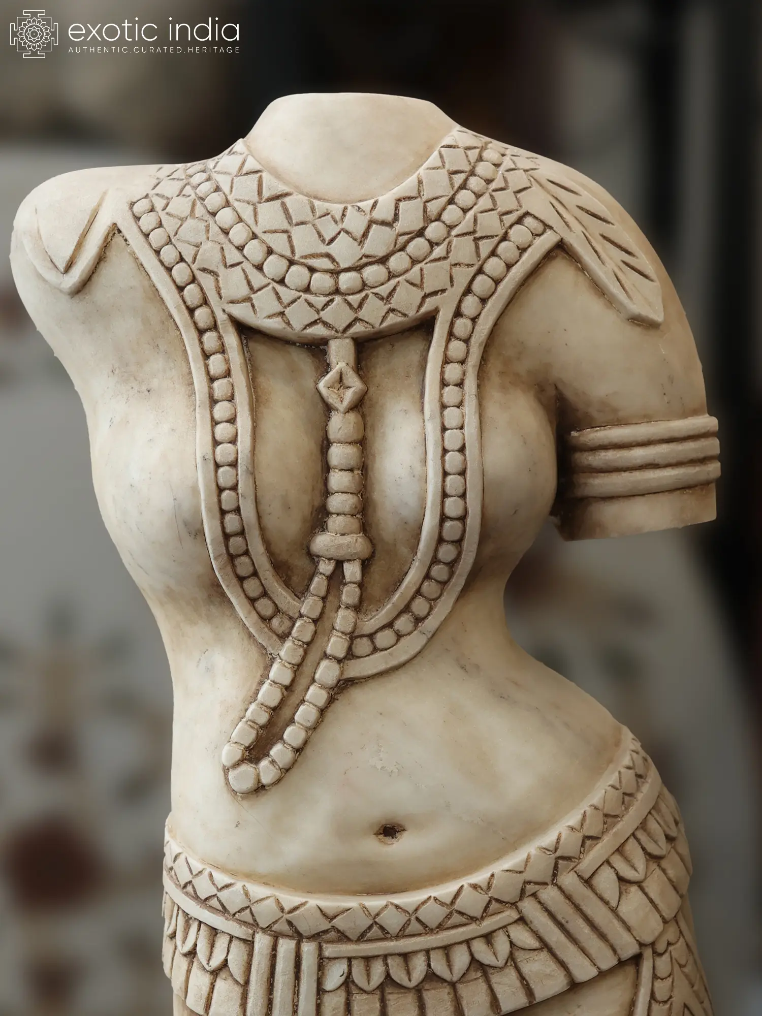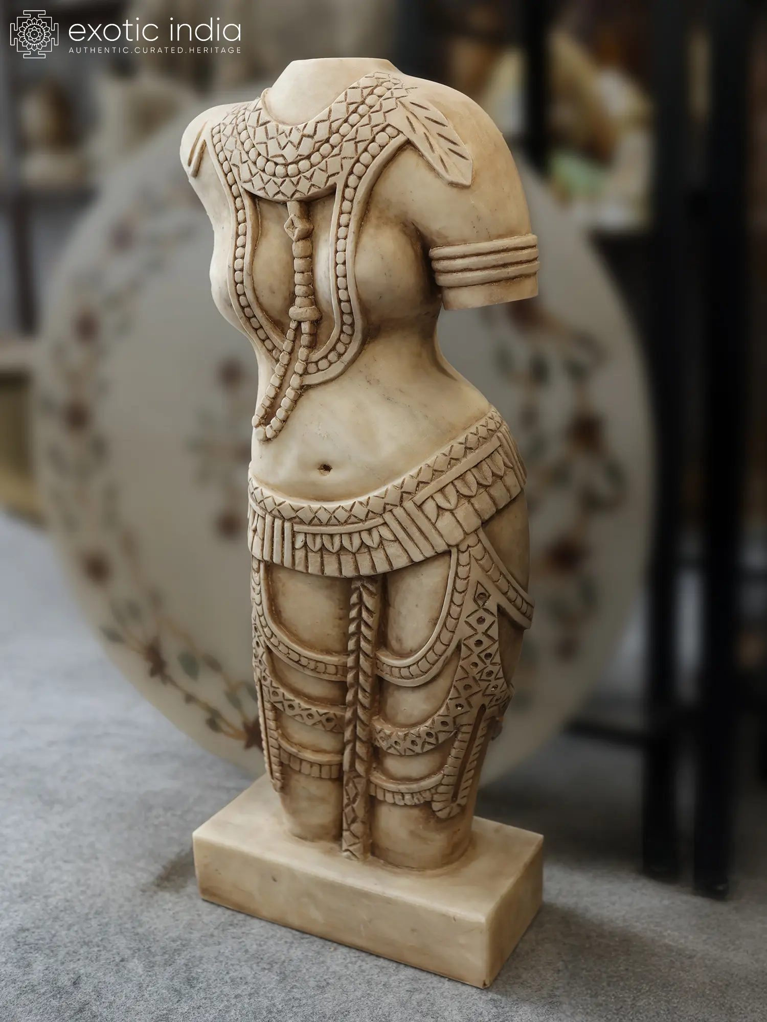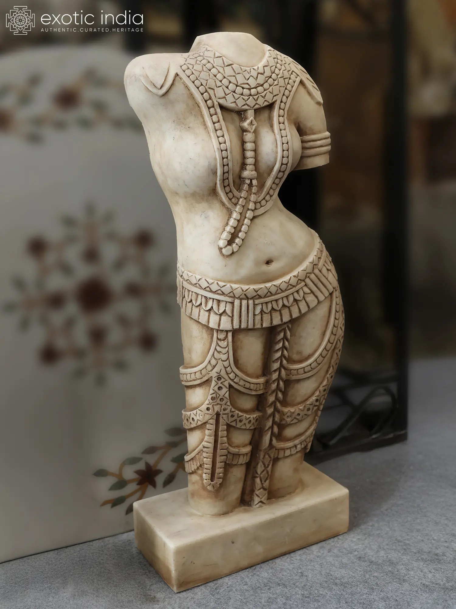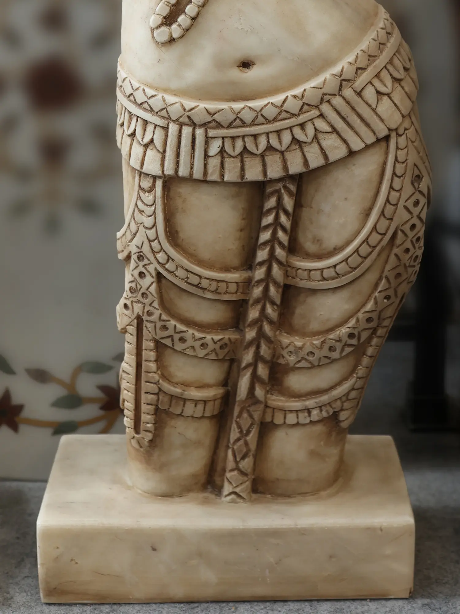 Adorned with exquisitely detailed ornamentation, from the elaborate beaded necklace cascading across the décolletage to the richly textured drapery that cinches the waist and falls gracefully. These elements are not merely decorative but integral to the narrative of the form, enhancing its visual depth and tactile appeal. The 34-inch height ensures a significant, yet not overwhelming, presence, with a width and length that provide perfect balance.