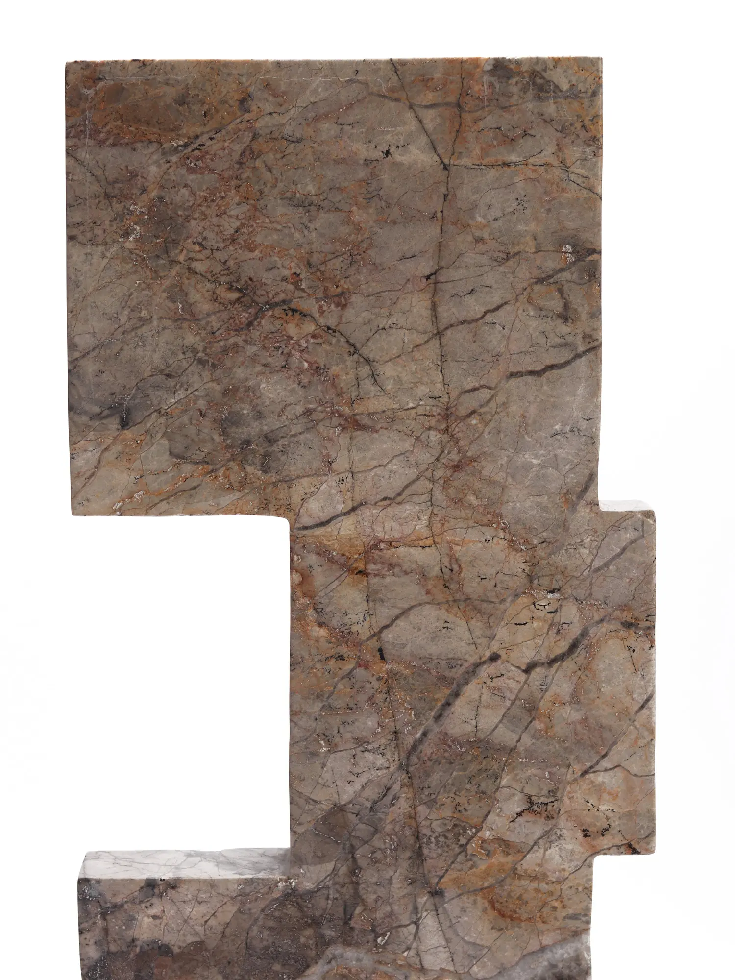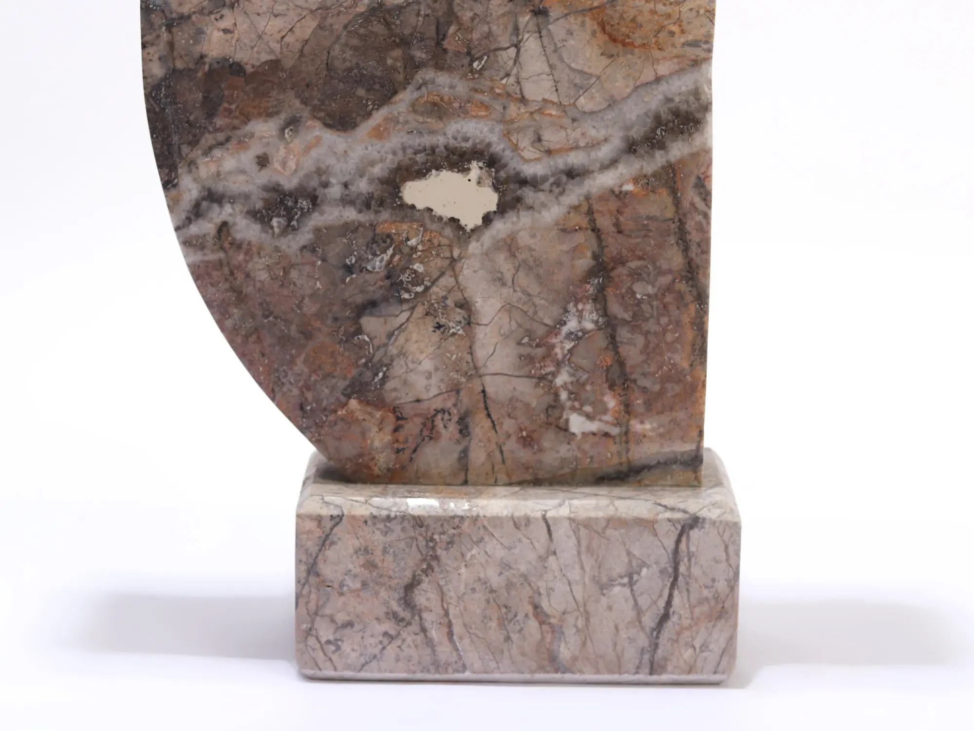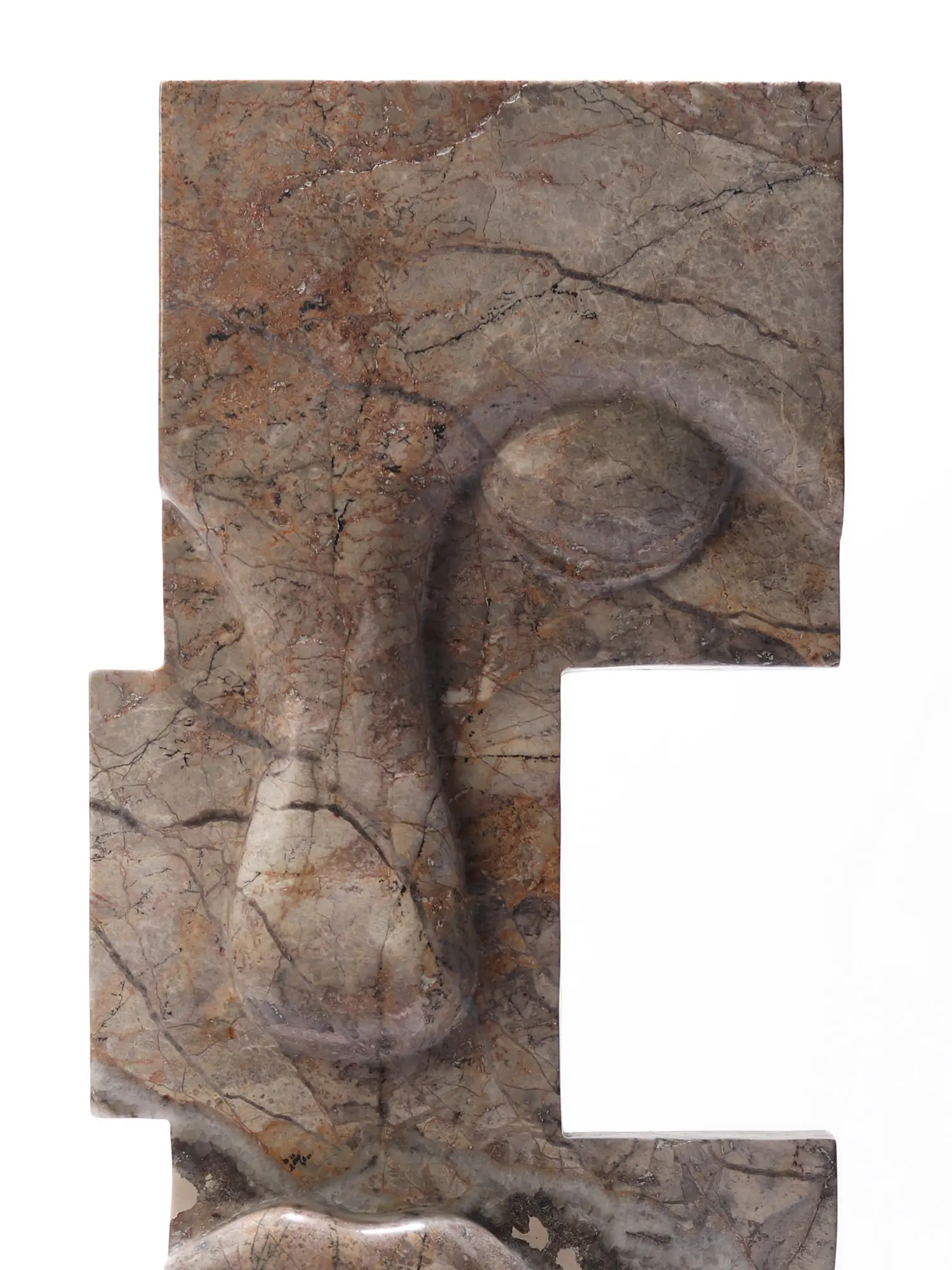 This abstract modern face sculpture is constructed of grey William Italian stone and depicts the notion of suppressing one's actual thoughts in order to live. The eyes are half drowsy shaped, indicating weariness and the nose is long and thin, indicating ego, which prevents a person from resting. An open mouth with large curving lips has been meticulously designed to portray the melancholy mood. Face portions have been taken out to convey a sense of bewilderment and loss. In short, this statuette is a sophisticated and modern depiction of the tiredness that people endure on a daily basis.