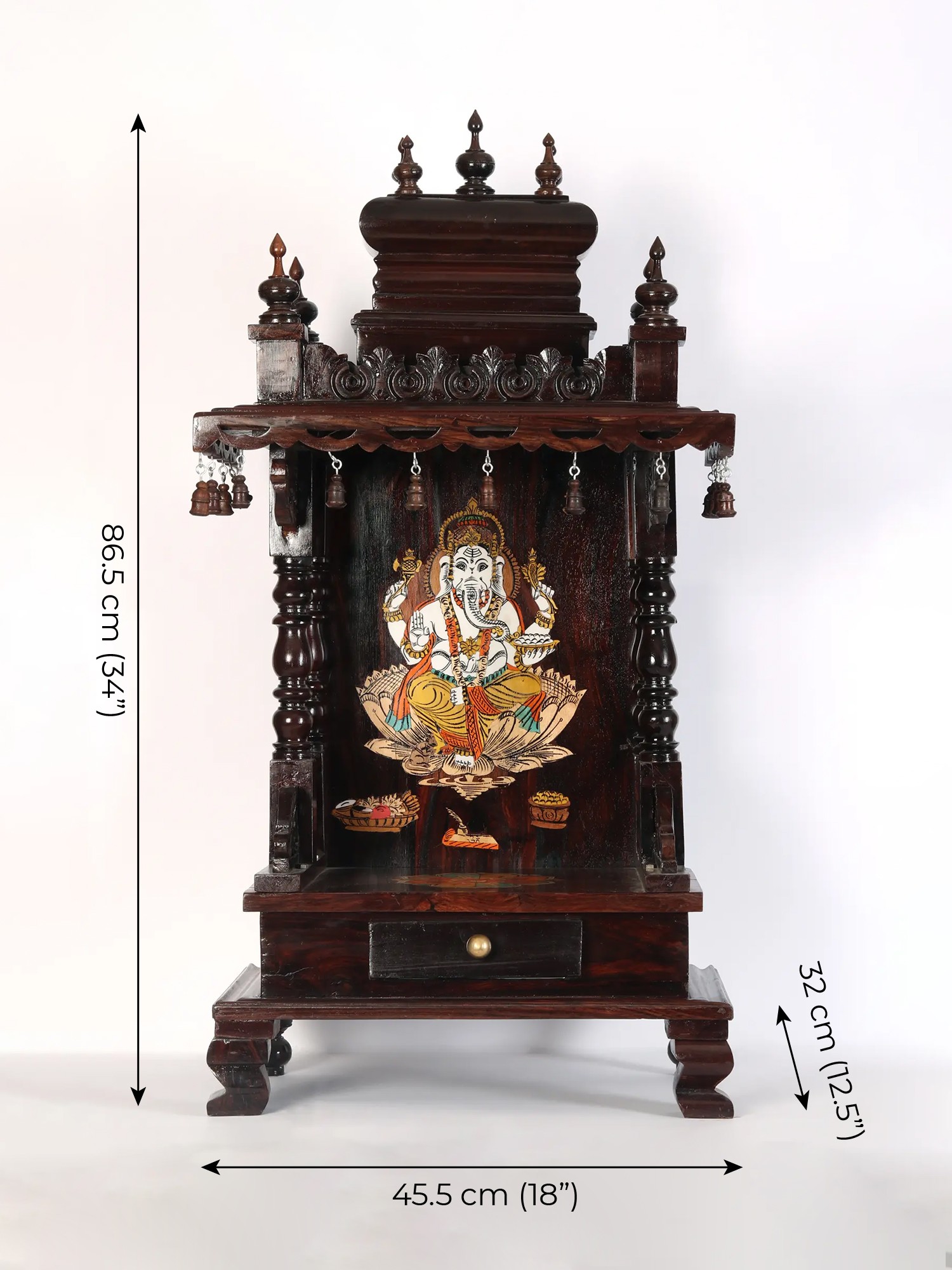Beyond its aesthetic appeal, this Ganesha temple is also incredibly practical. The spacious interior provides ample room for your Ganesha murti and other devotional items. A small, thoughtfully-placed drawer offers discreet storage for small offerings, incense sticks, or other puja essentials, ensuring that everything you need is easily accessible. This temple features small bells hanging on each side. The bells softly chime with the slightest breeze, adding another sensory dimension to your worship experience. The sturdy construction and durable wood guarantee this temple will be a cherished heirloom for years to come. The size is perfect for placement on a mantel, table, or shelf.
