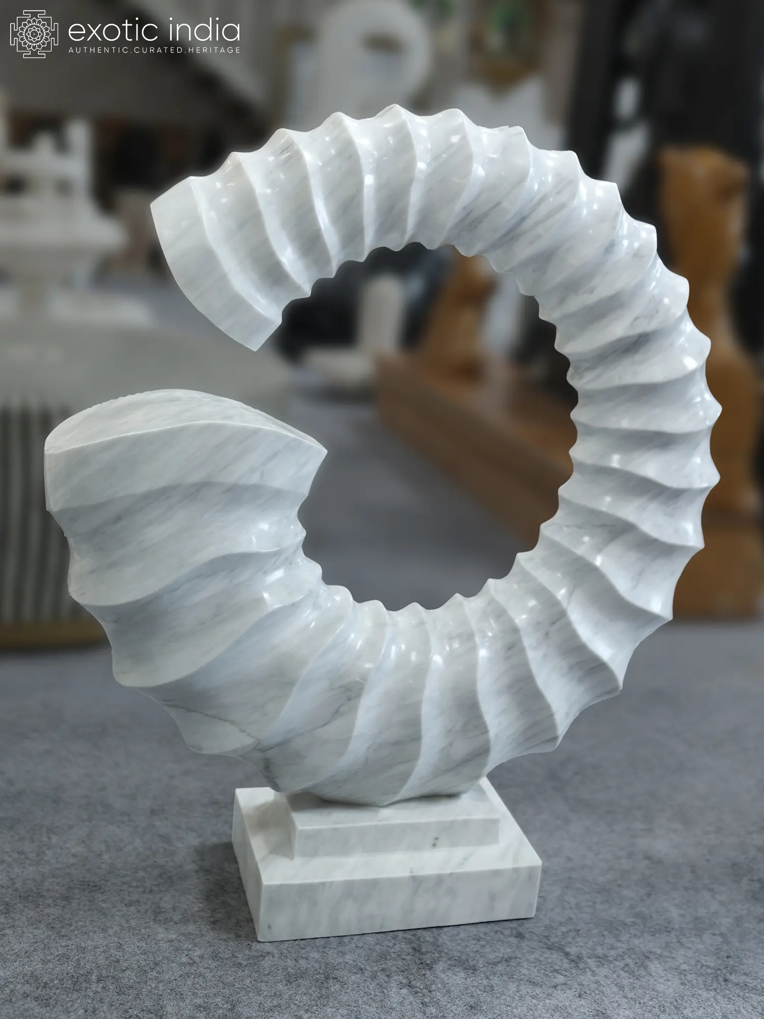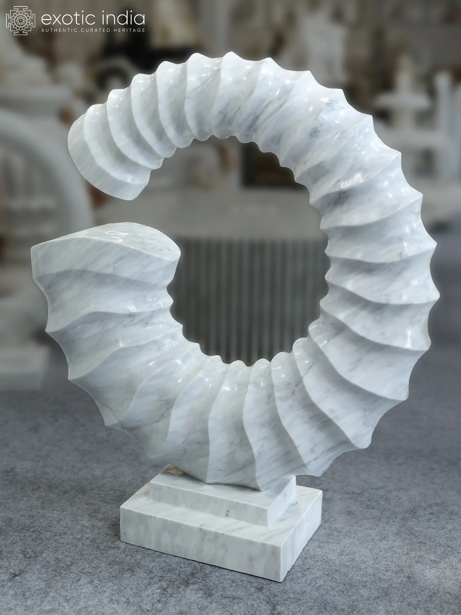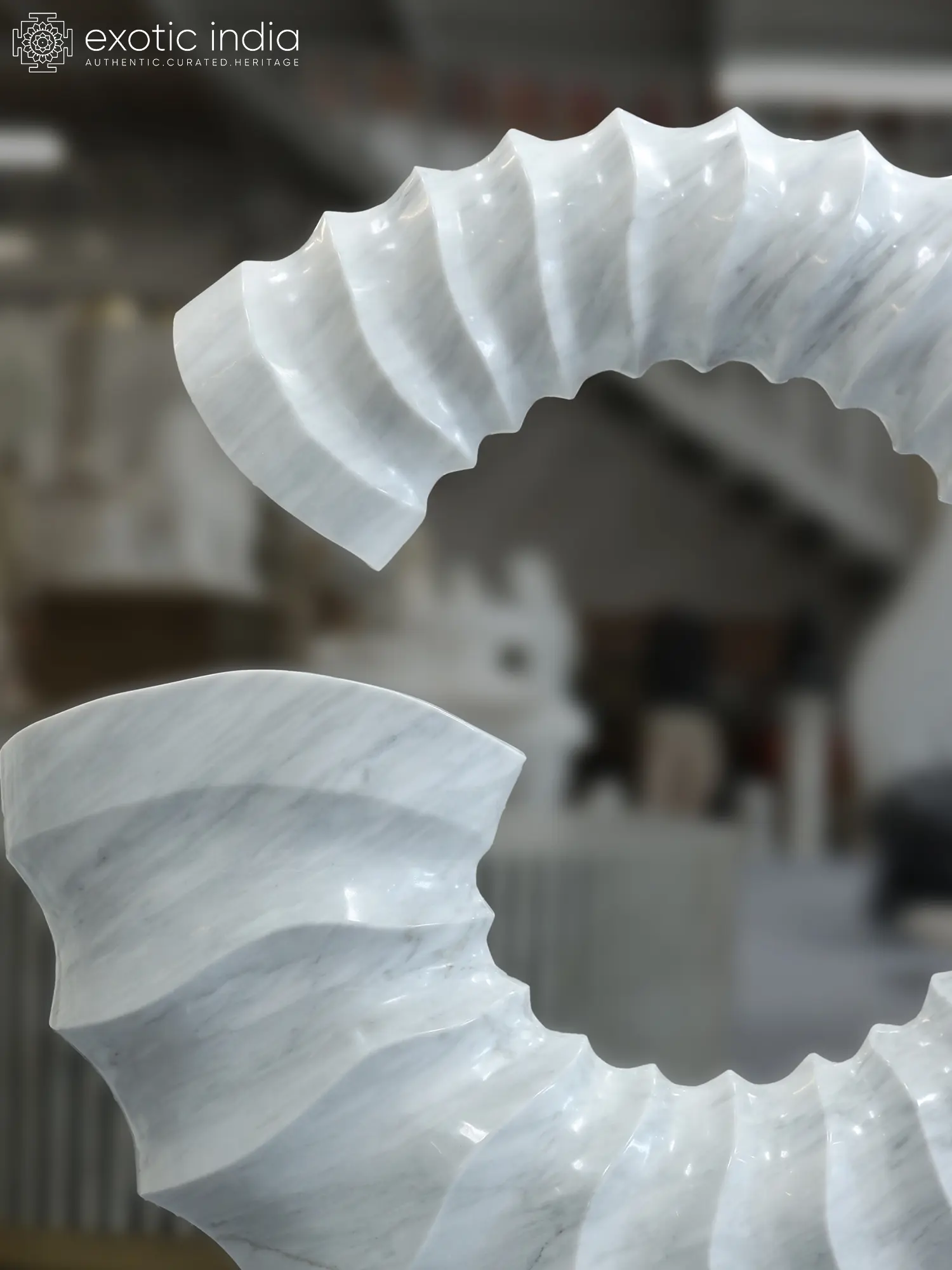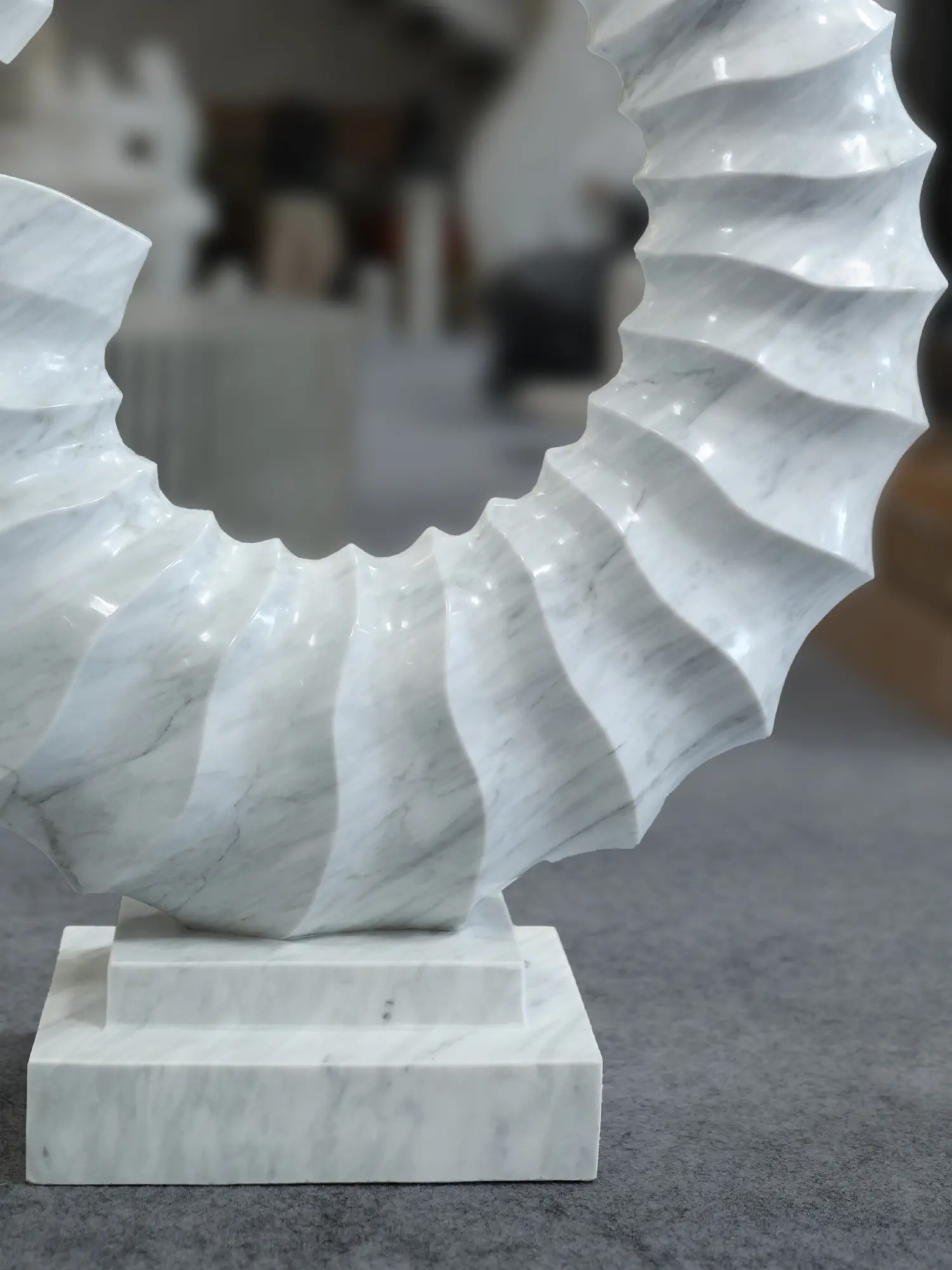 This marble sculpture draws its strength from precision rather than scale. Its circular form is articulated with a sequence of finely carved ripples, each groove cut with deliberation, creating a surface that closely recalls the structure of marine fossils shaped by water, pressure, and time.