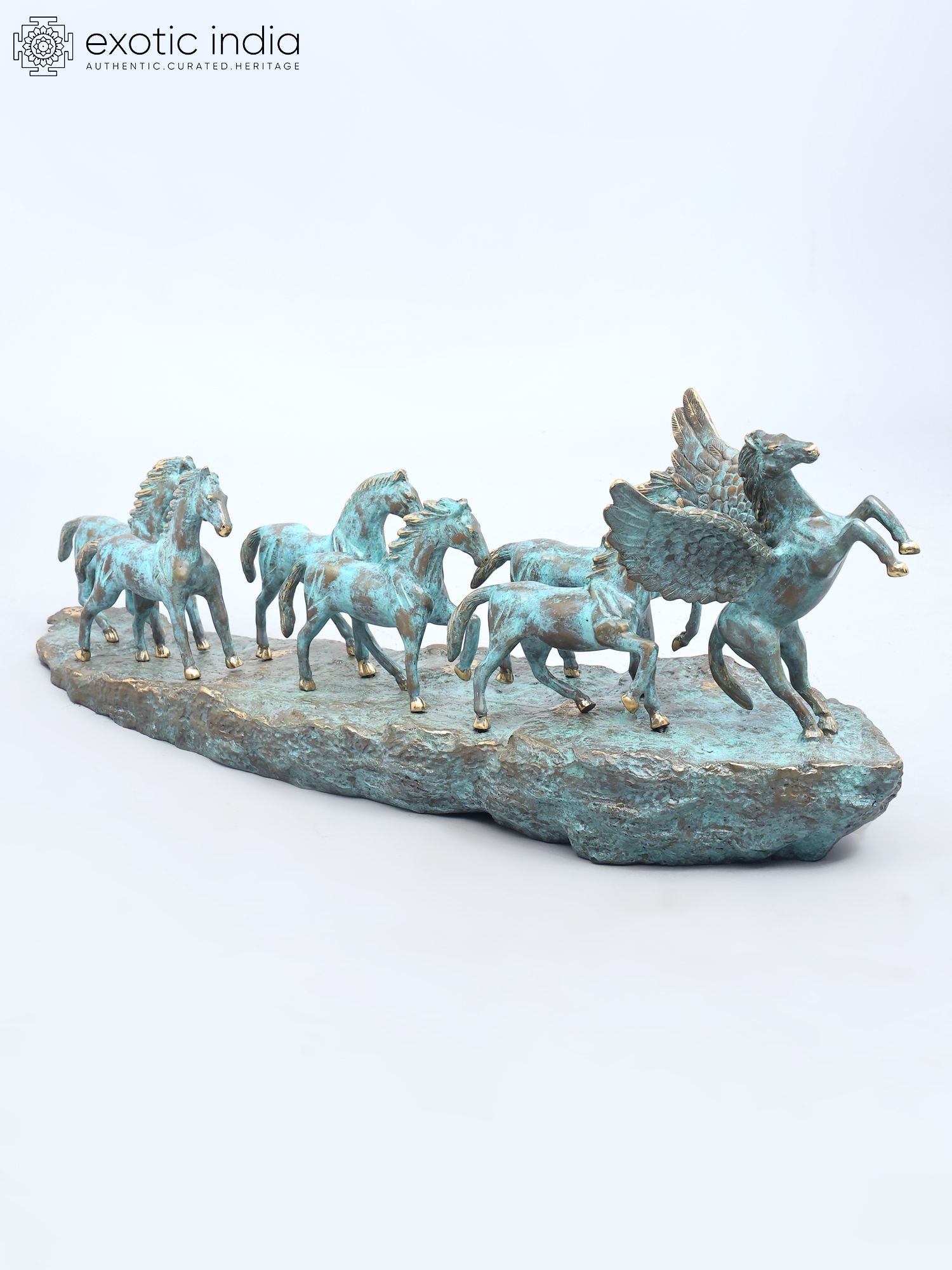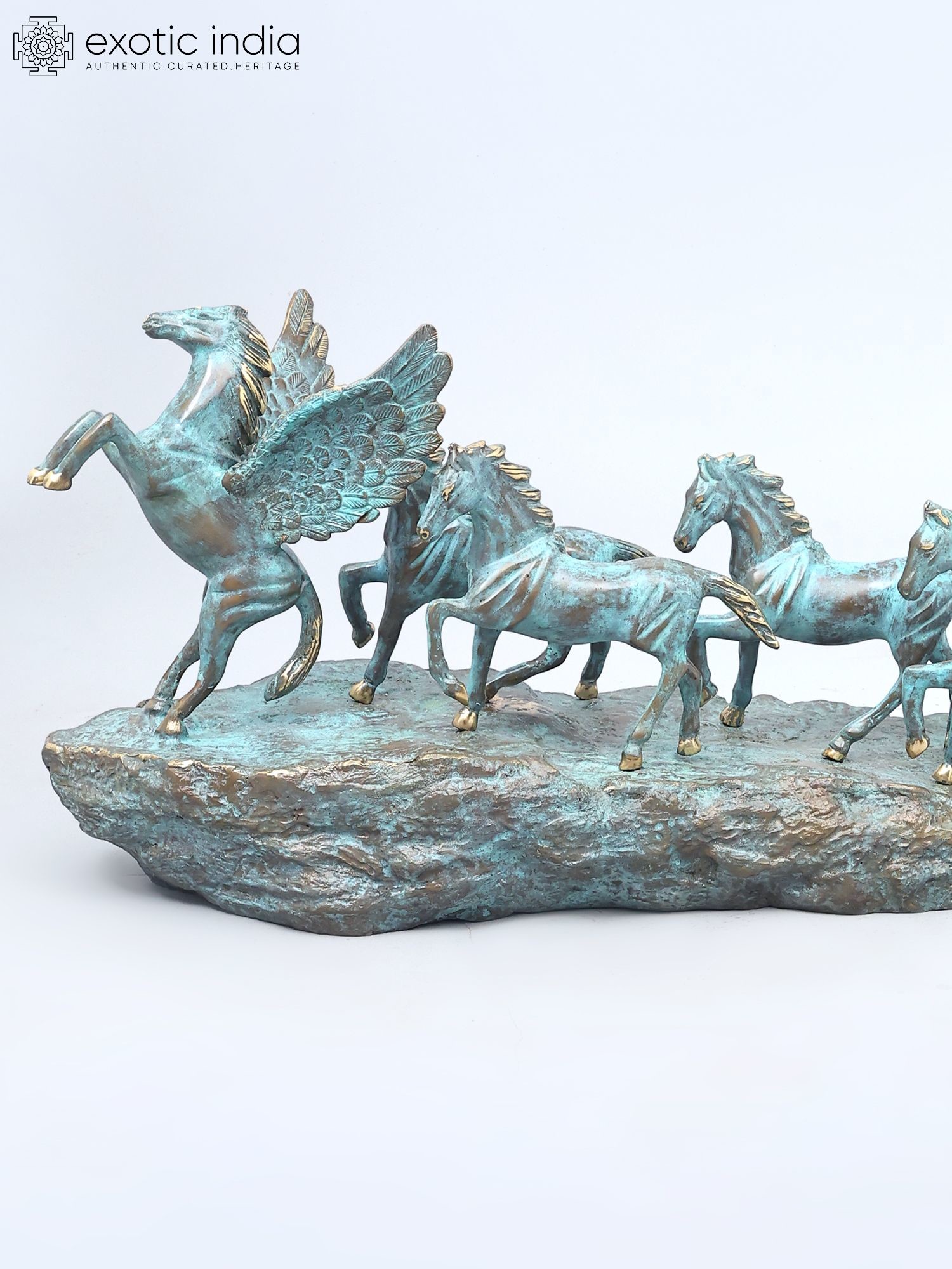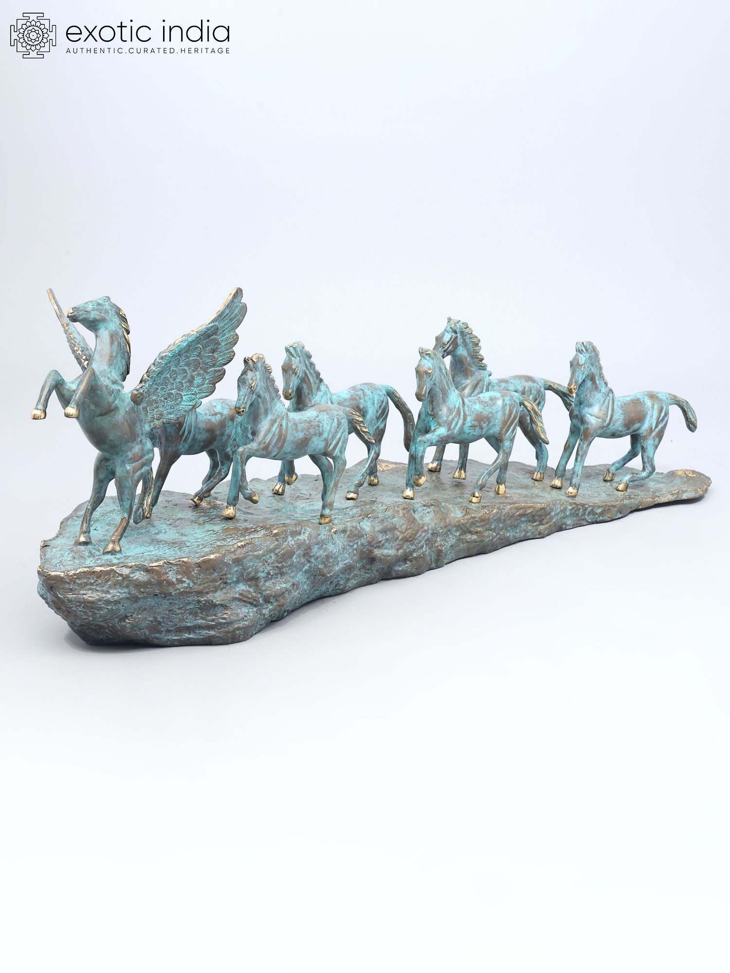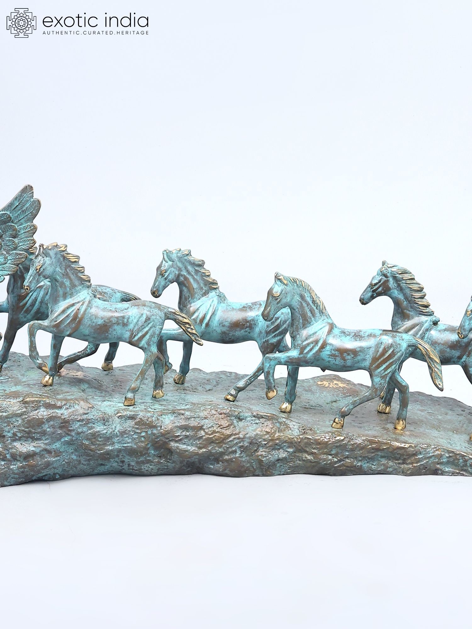 Features a dynamic depiction of seven galloping horses, led by a majestic winged horse.