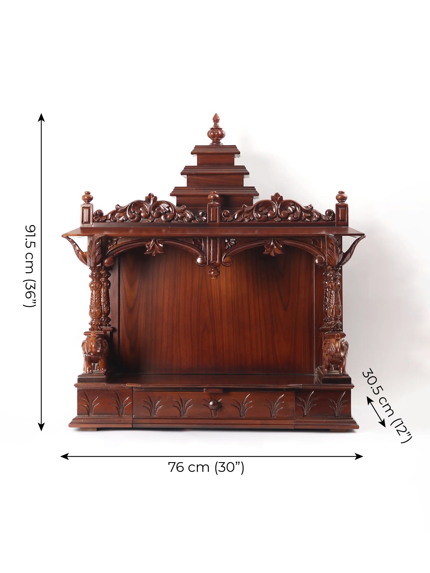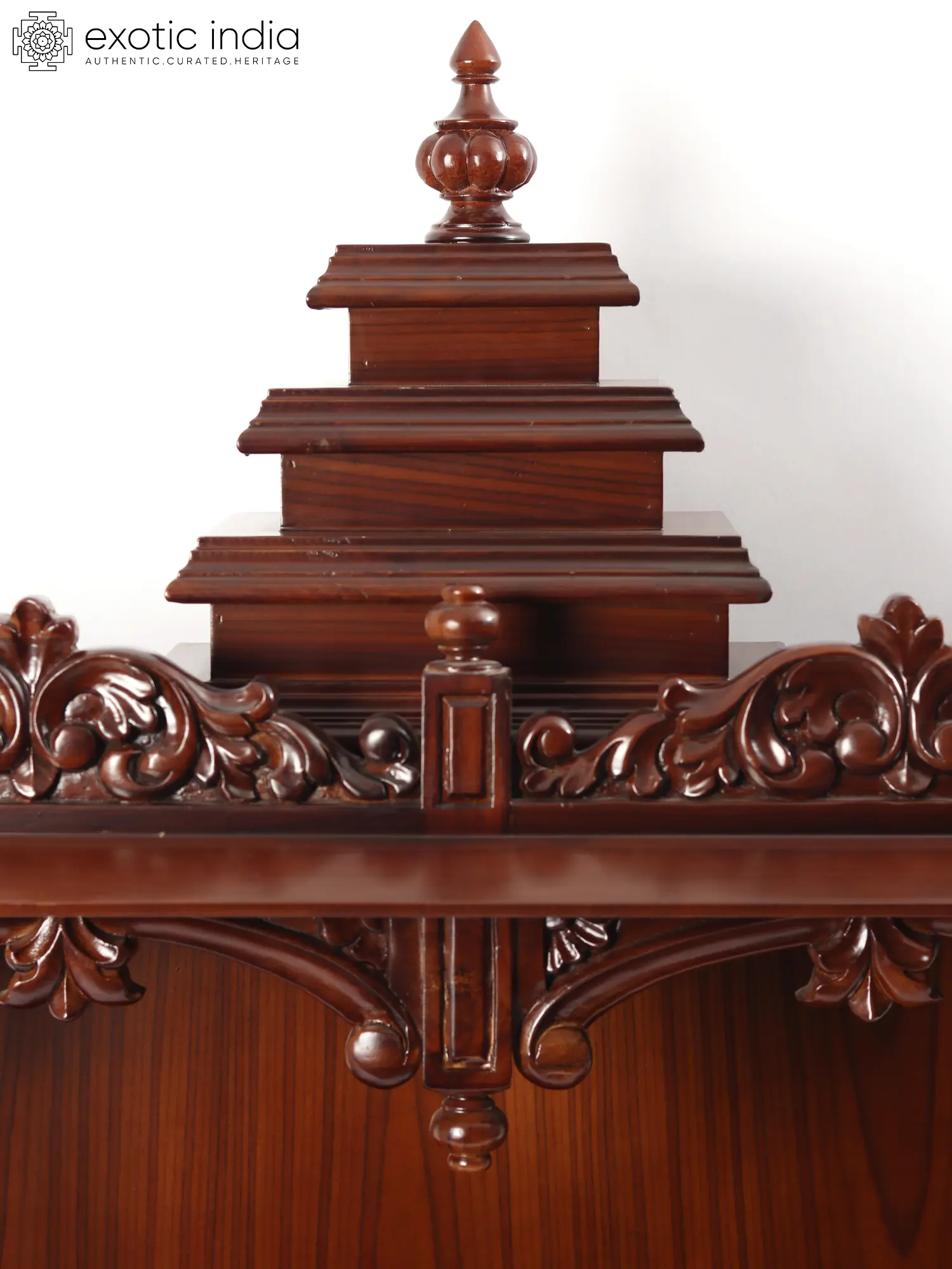 This Large Wood Carved Designer Temple with a Drawer, crafted from high-quality wood, stands as a testament to exquisite craftsmanship and thoughtful design. Ornamented with intricate floral motifs on the roof and pillars, the temple evokes a sense of divine elegance. The pillars resemble the distinctive Chettinad style, reflecting the cultural richness of South Indian architecture. The inclusion of a drawer adds practicality to this artistic piece.