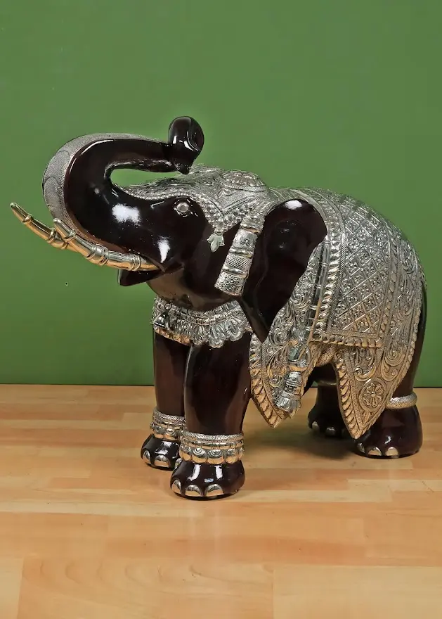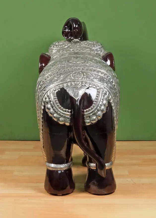 Made with the juxtaposition of wood and silver elements - this piece creates a harmonious fusion, blending the natural warmth of wood with the captivating gleam of silver. These large wooden elephant pairs are more than just decorative pieces; they are symbols of power and wisdom. As they stand tall and proud, they evoke a sense of awe and reverence. The skillfully hand-applied silver enhances the beauty and regal presence of these magnificent animals and the delicate motifs, reminiscent of traditional designs, flow seamlessly across the bodies, emphasizing the allure and majesty of these elephants.