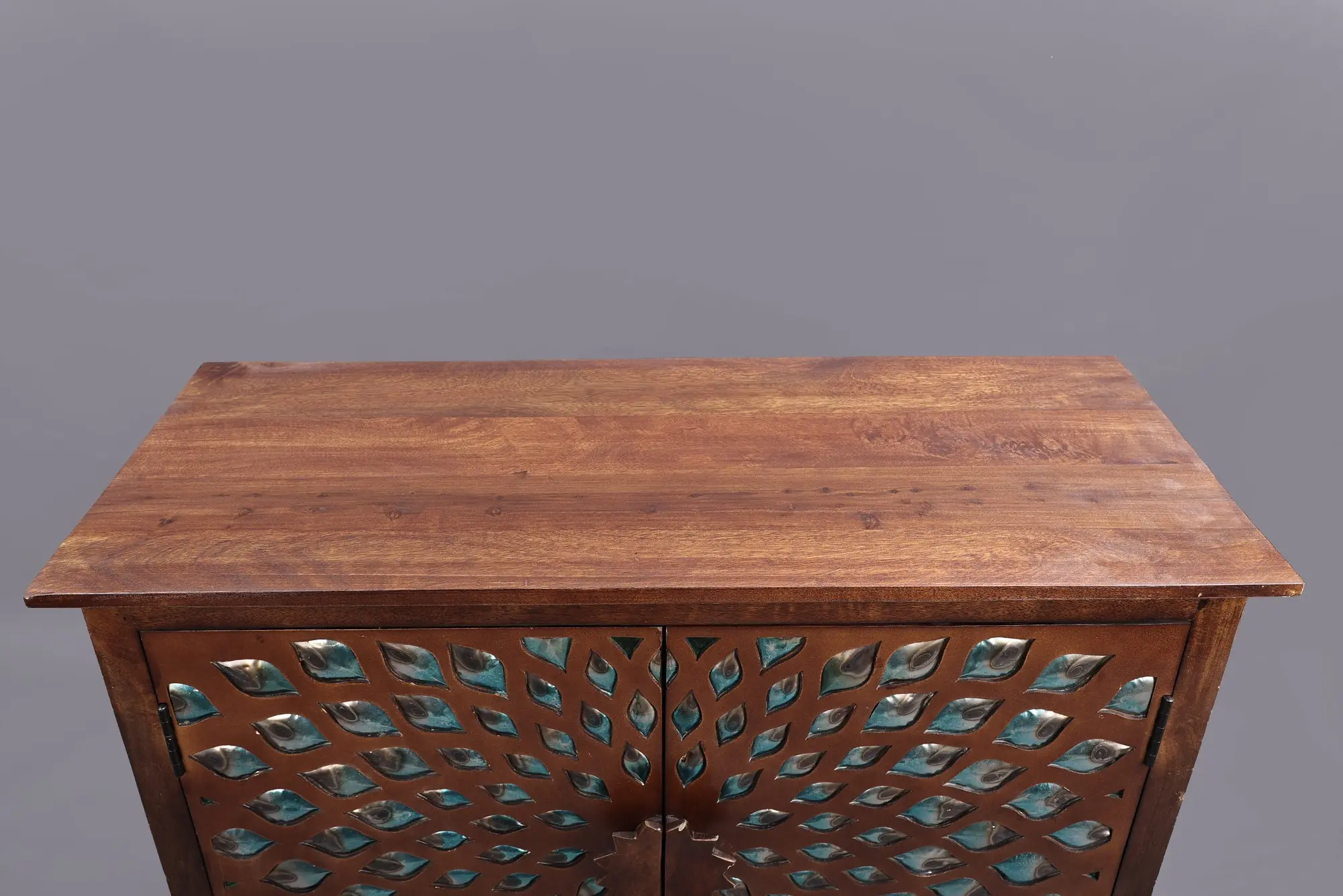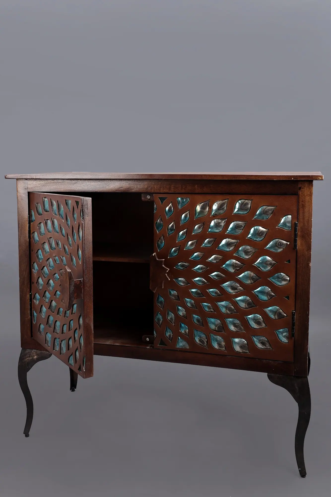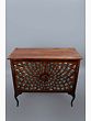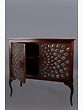What truly sets this cabinet apart is its stunning facade. The doors are adorned with a captivating design, carefully arranged to create a mesmerizing visual effect. This handcrafted artistic detail brings an element of sophistication and depth to the piece, ensuring it stands out as a focal point in your living room, dining area, or bedroom. The cabinet's design effortlessly blends artistic flair with functional design. The rich wood finish complements a variety of decor styles, from rustic to modern, while the spacious interior provides ample storage space for your belongings.