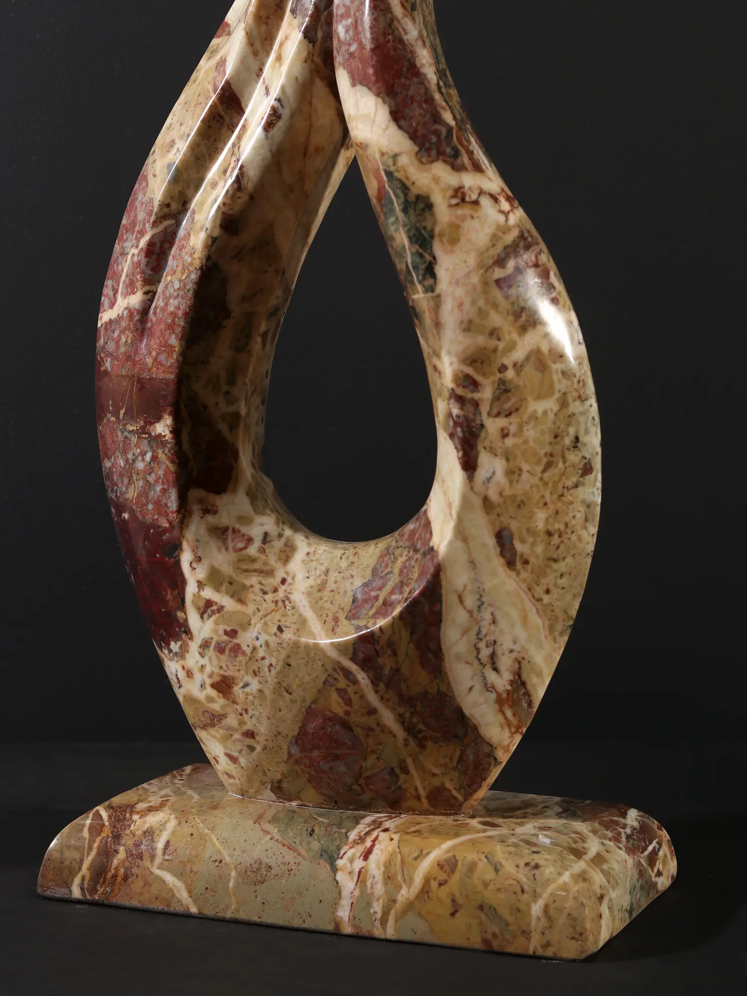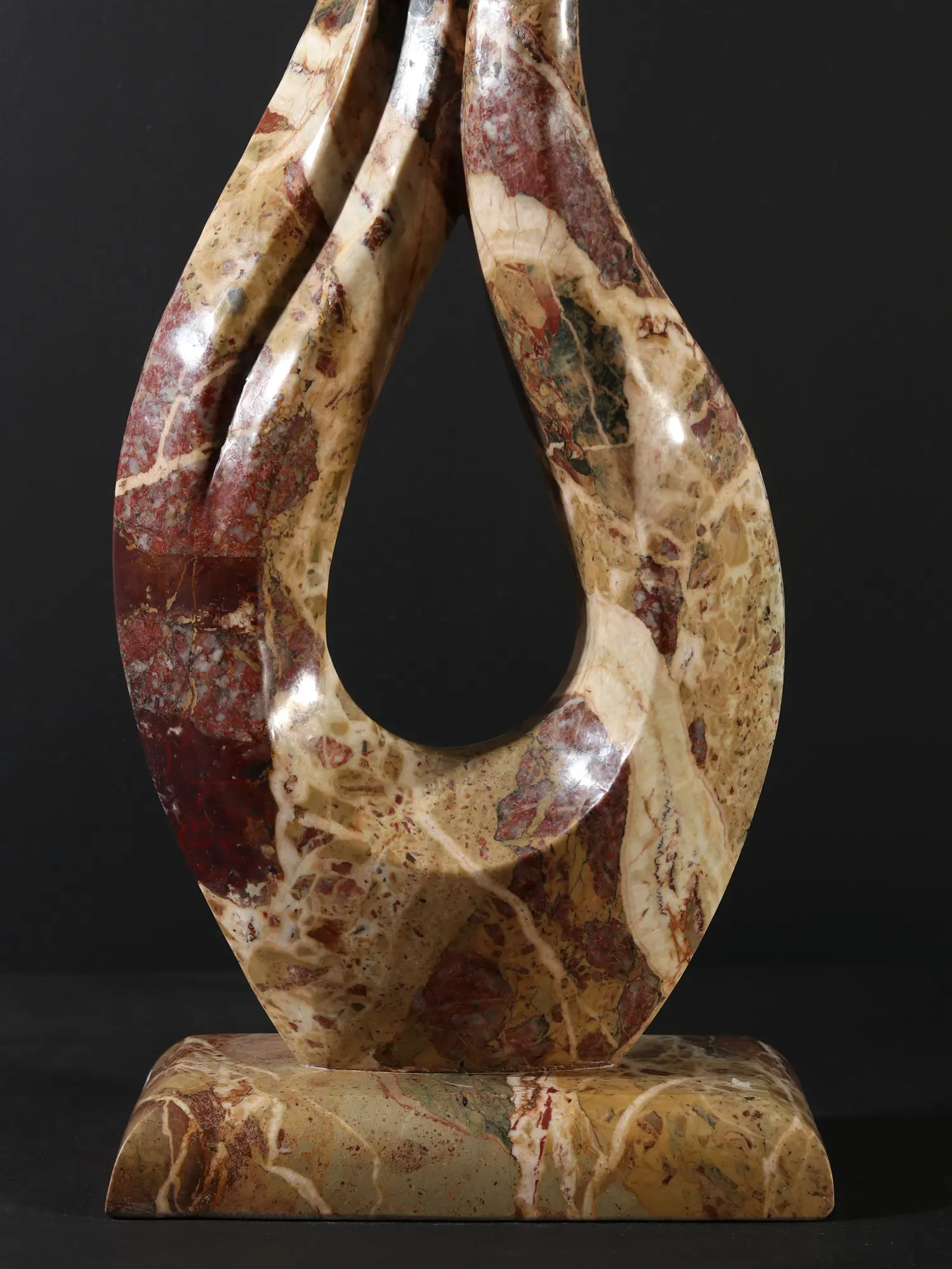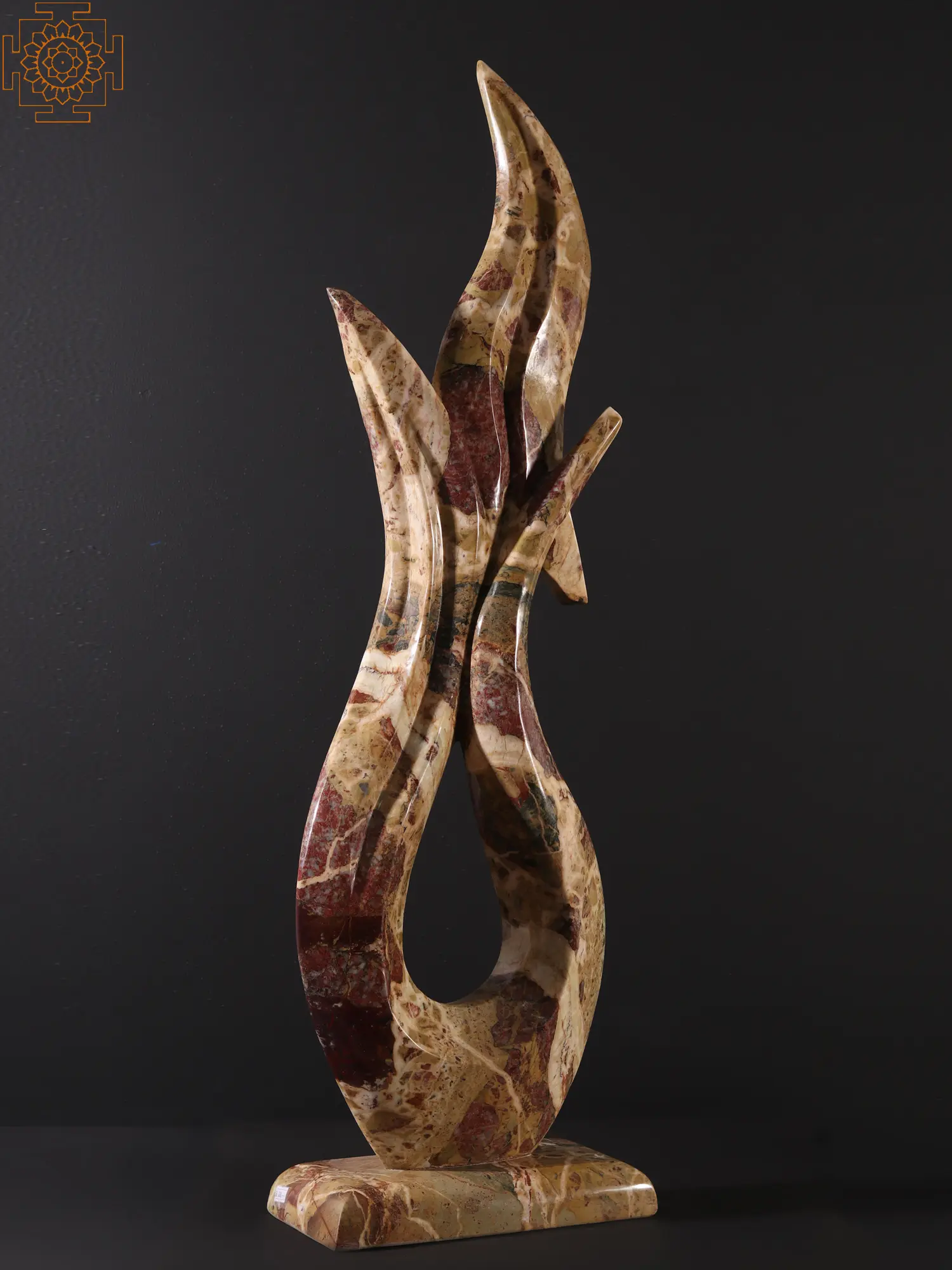 This Italian Beige Marble Abstract Statue is a modern art piece that displays two flame-like hands embracing and protecting a little flame in the centre. The artwork represents humanity's search for inner transformation and spiritual awakening. It depicts the idea that by nourishing and protecting our true selves' inner flame, we can experience great growth and radiate our authentic essence into the world. The statue asks spectators to consider the relevance of personal illumination, inner power, and the soul's eternal flame.