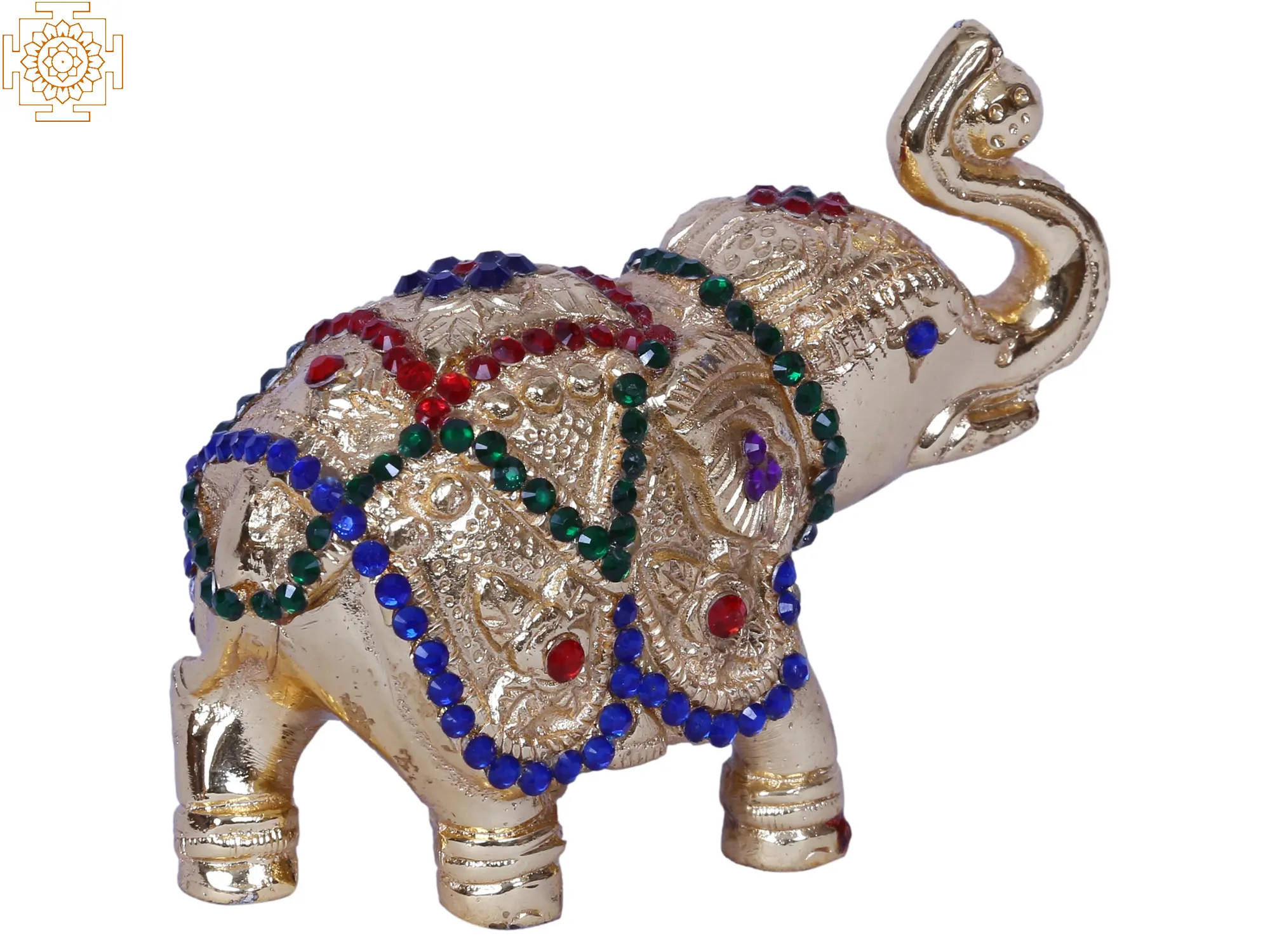 This Small Elephant With Stone Work, is a brass-made item and gold-plated. The elephant features intricate stone inlay work that enhances its aesthetic appeal. Notably, the elephant has an upraised trunk, symbolizing good luck, prosperity, and positive energy.