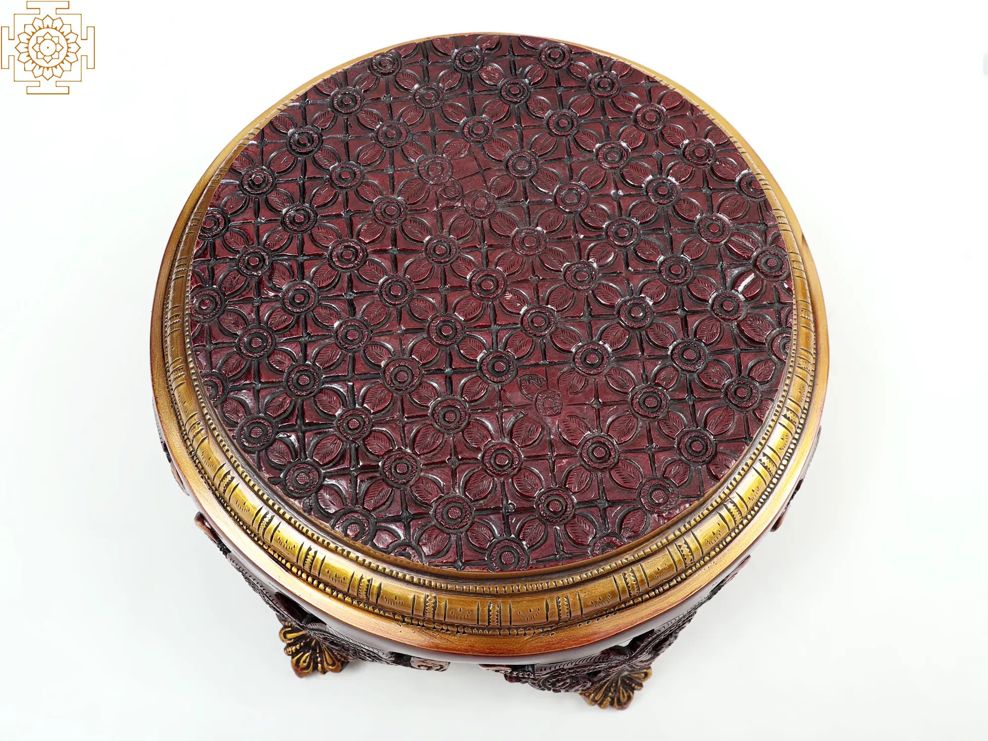 This chowki of a 4.2 inch height from the ground stands on triangular carved legs of ethnic designs, that holds a multiple layered thick brass tray, with the edges chiselled in lotus petal design and the top is graciously engraved in interconnected floral patterns, laid out in a structured manner forming a kind of a mesh.