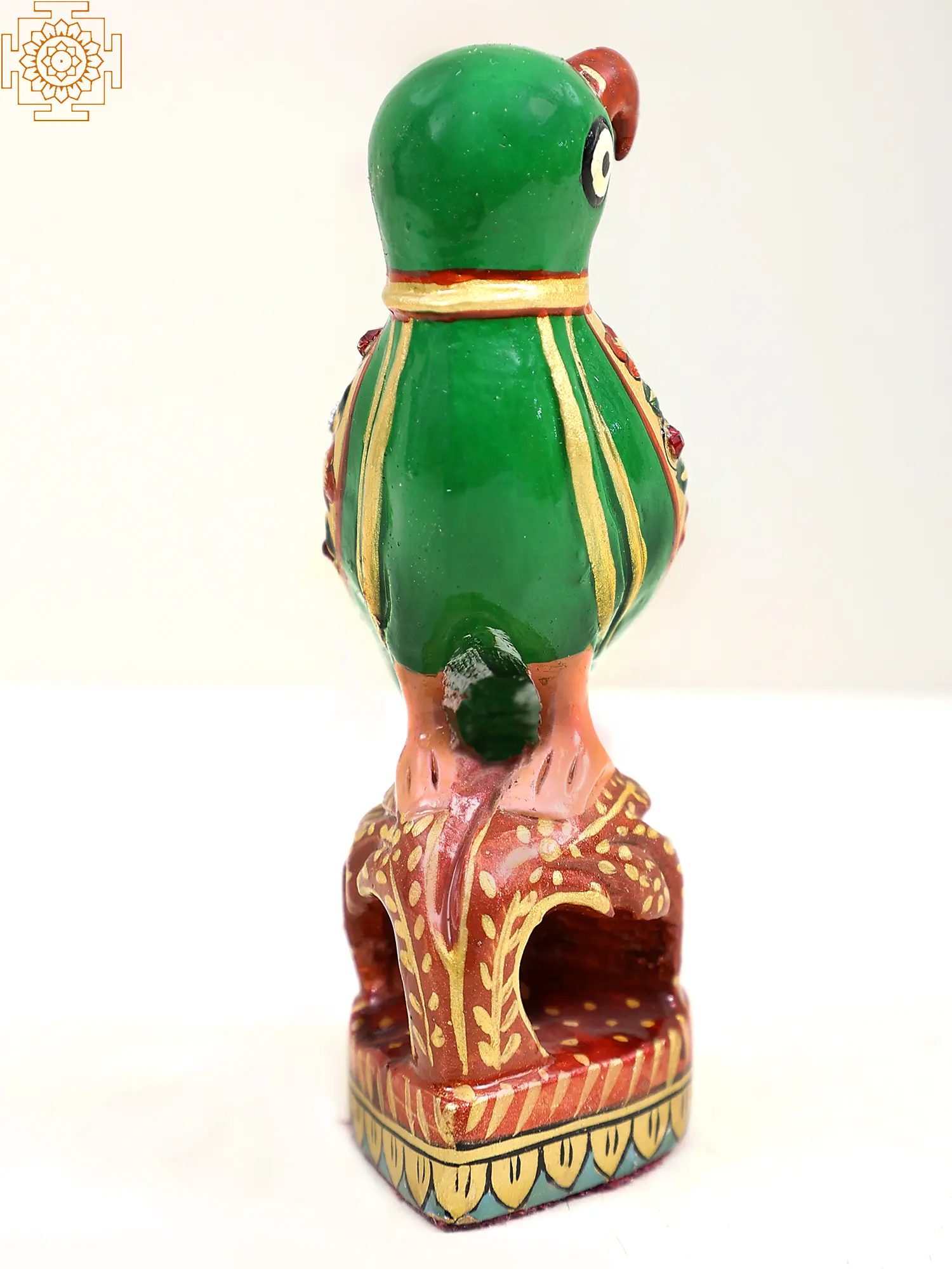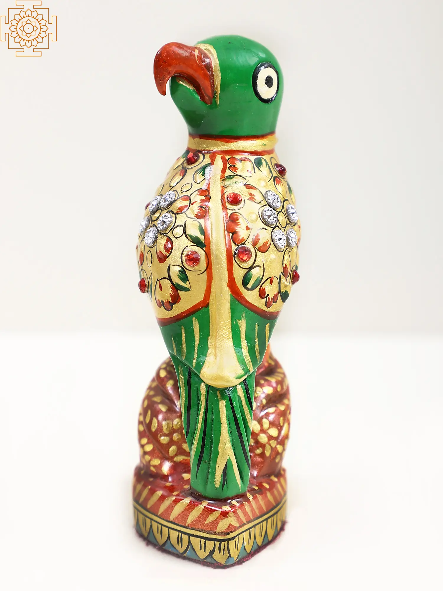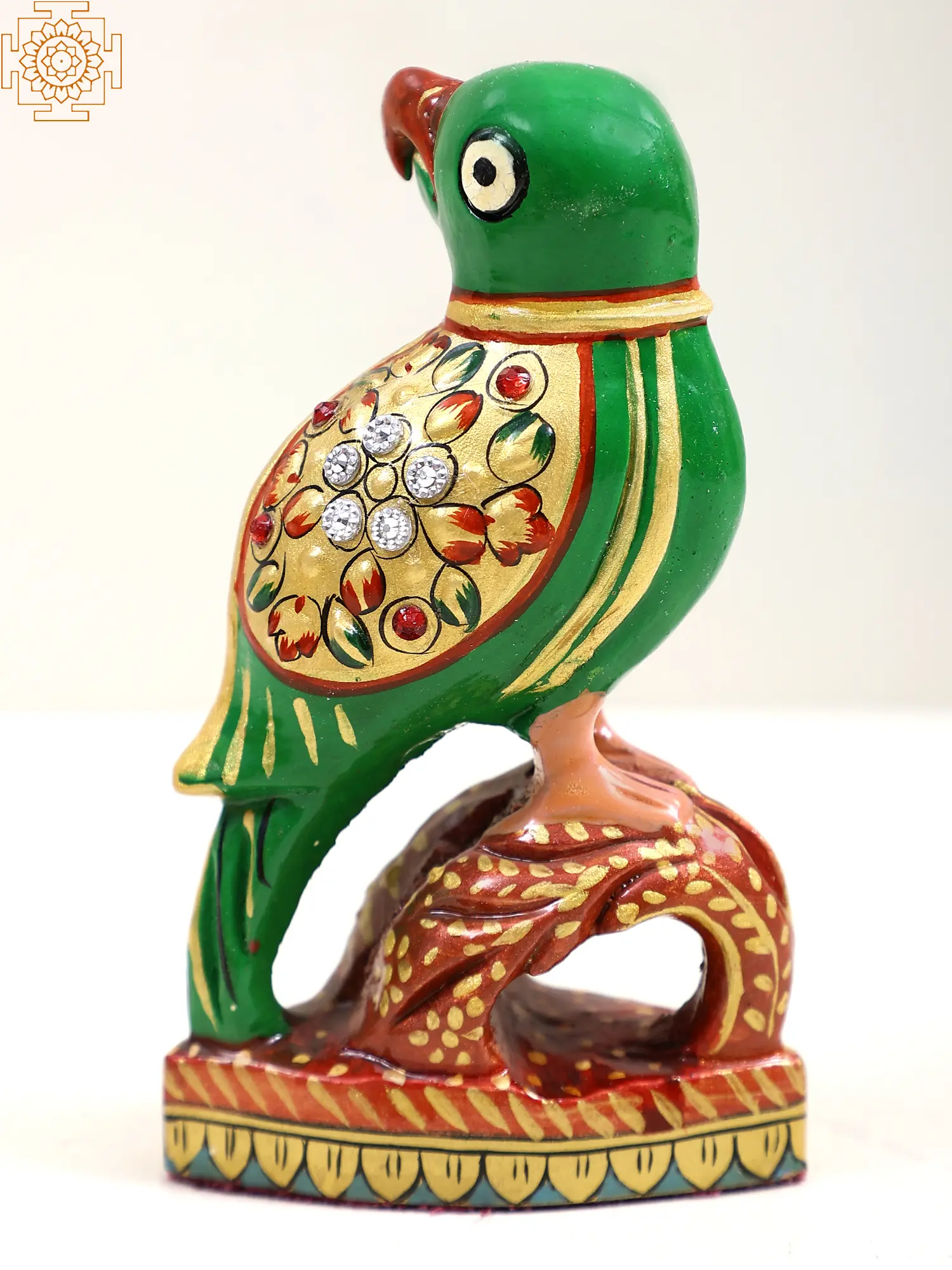 This exquisitely crafted 4-inch wooden parrot figurine is a captivating blend of artistry and charm. Hand-painted with meticulous detail, it showcases a vibrant green plumage accented with gold detailing and sparkling embellishments. The parrot is perched on a beautifully carved reddish-brown base, adding to its overall elegance and visual appeal. This delightful piece is more than just a decoration; it's a statement piece that reflects a unique sense of style and appreciation for handcrafted artistry. Perfect for adding a touch of exotic flair to your living space, this parrot figurine is sure to become a cherished addition to your collection or a thoughtful gift for someone special.