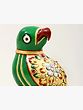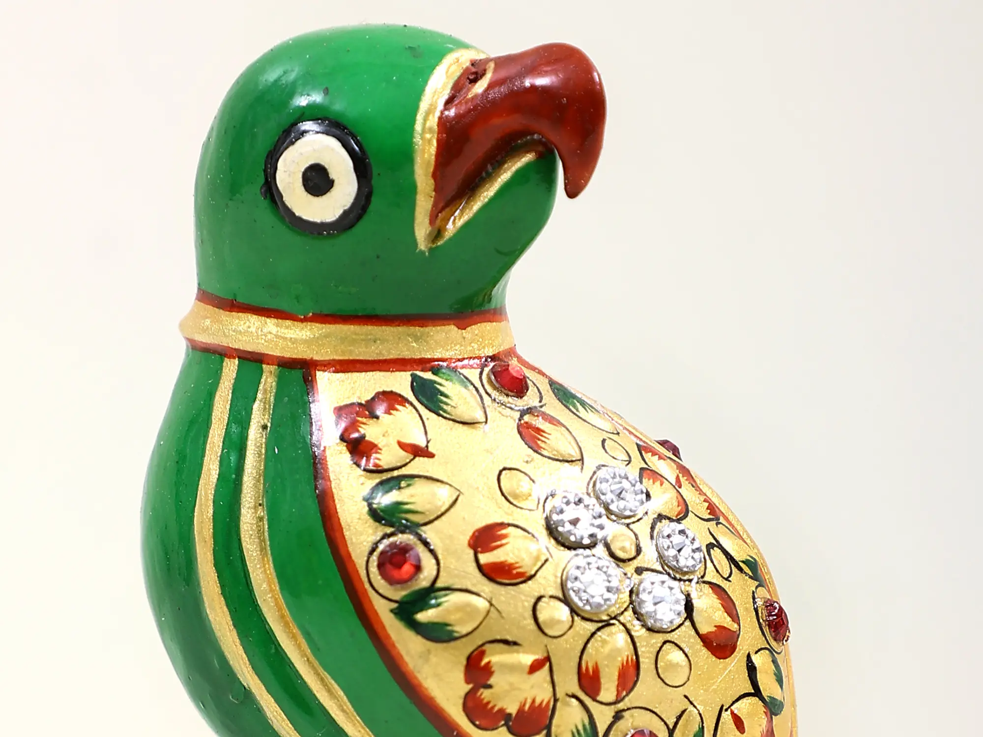 The artistry of this small wooden parrot is truly remarkable. Each feather, intricate floral pattern, and sparkling stone is painstakingly hand-painted, creating a piece that’s as unique as it is beautiful. The rich green body is complemented by accents of gold leaf and red, adding depth and visual interest. The attention to detail extends to the bird's beak, eyes, and even its tiny claws, resulting in a highly realistic and captivating representation of this beloved bird. The combination of colours and textures creates a captivating visual experience that adds a vibrant touch to any room.