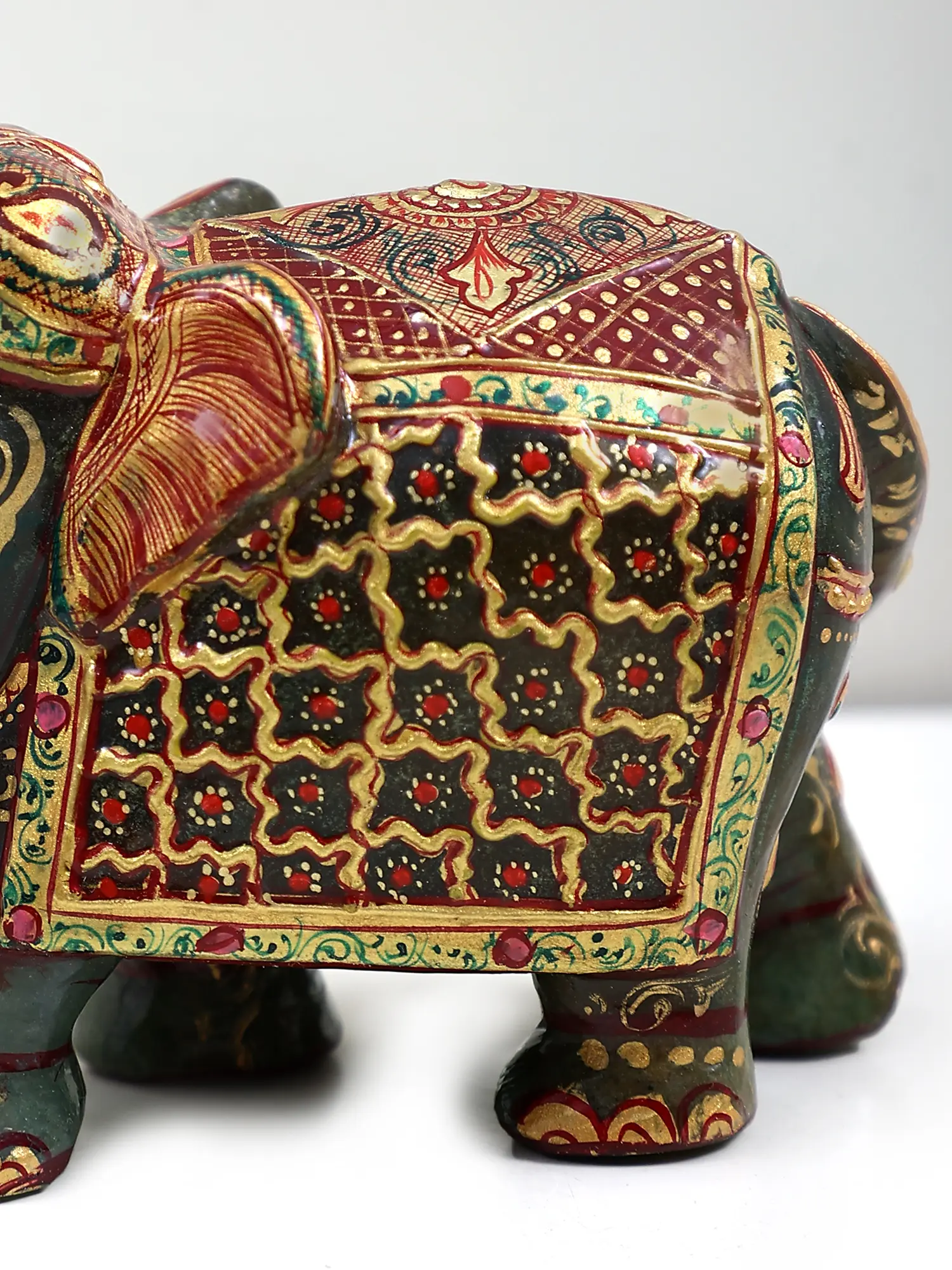 This charming elephant figurine measures approximately 3.40 inches in height, 2.30 inches in width, and 4.70 inches in depth, making it the perfect size to add a touch of elegance to a variety of settings. Place it on a mantelpiece, bookshelf, or display cabinet – its vibrant colours and intricate detailing will instantly brighten any space. Its compact size makes it suitable for various décor styles, from traditional to modern, adding a touch of sophistication without overpowering the surrounding décor. Consider it as a focal piece for a small table, a shelf accent, or an element within a larger collection of decorative figurines.