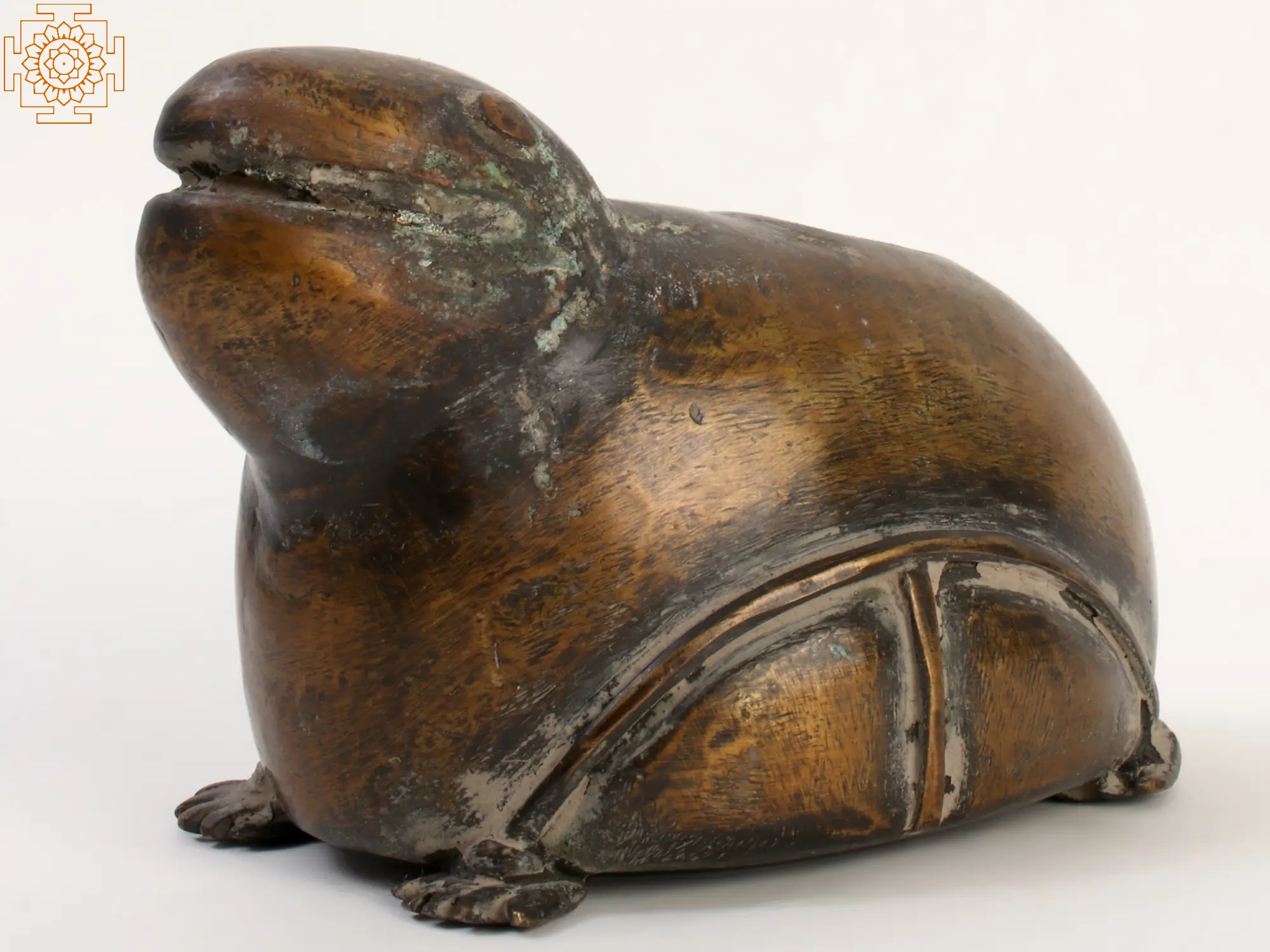 This diminutive Brass Frog Figurine, disguised as a pepper sprinkler, merges functionality with understated charm. The rudimentary shape, deliberately obscured, beckons beholders to decipher its form independently, fostering a sense of engagement. Veiled in a brass patina tint and adorned with black sediments evoking antiquity, it exudes timeless allure. The deliberate imperfections tell a tale of age and character. Functionally, discreet holes on its back transform this whimsical creature into a versatile spice dispenser, whether for salt or pepper. This artful marriage of form and function invites curiosity, urging admirers to appreciate both the aesthetic mystique and practical ingenuity within this small, enigmatic brass masterpiece.