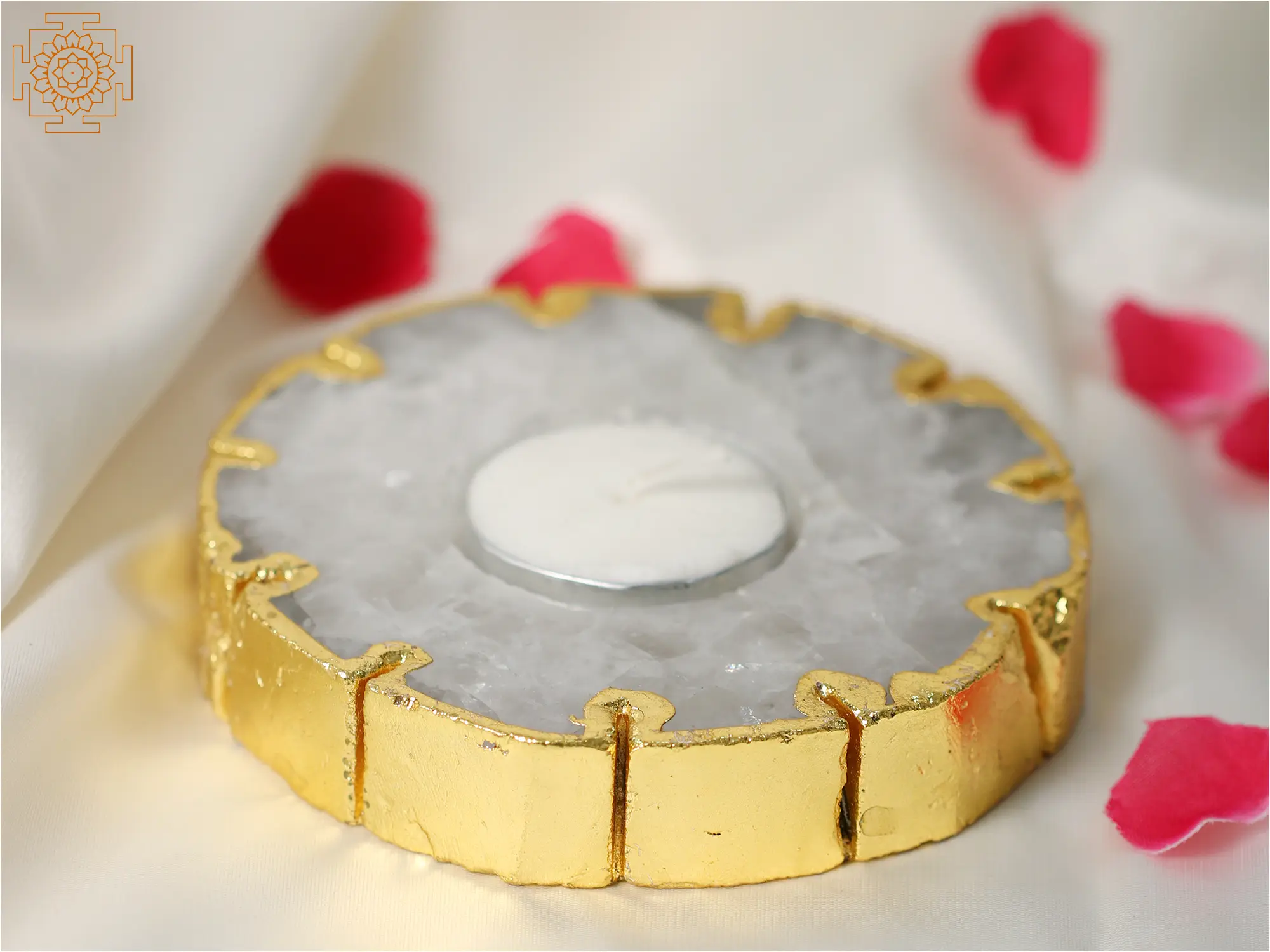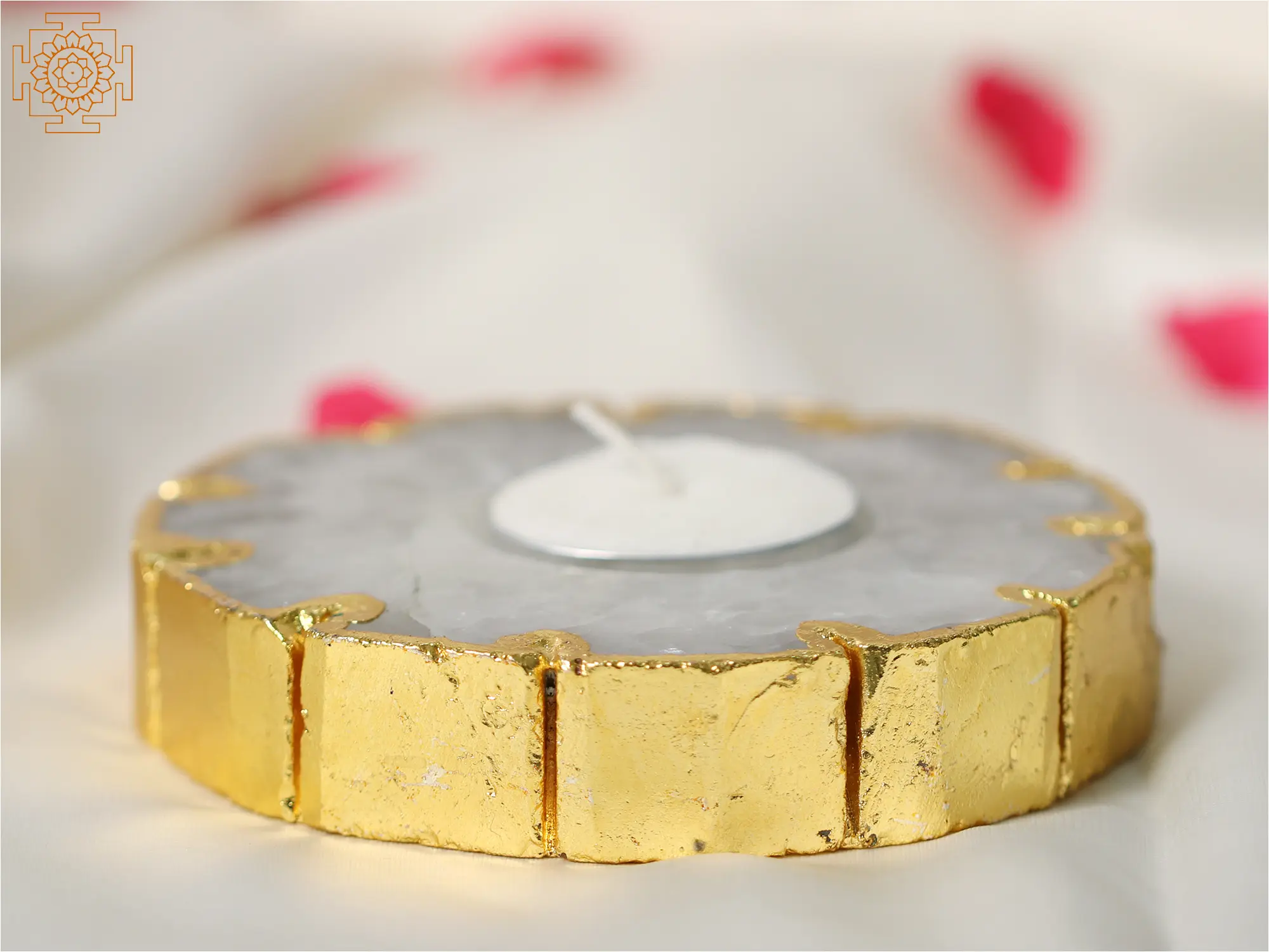 The designs of home décor objects have gone a long way thanks to a great deal of innovation in terms of style, feel, and meaning. Every element of a piece now has a symbolic meaning or is Vaastu certified to create positivity. This Small Natural White Quartz Crystal Candle Holder with Gold Edge combines beauty and positive energy. Its combination of delicate quartz and sumptuous gold emphasizes the crystal's innate beauty. Beyond appearances, the white quartz holder has advantages such as increasing clarity, healing, and optimism. White quartz, often known as a "master healer," can purify energy and improve focus. The surface of the crystal comes alive with the light of a candle, creating an environment of peace and regeneration.