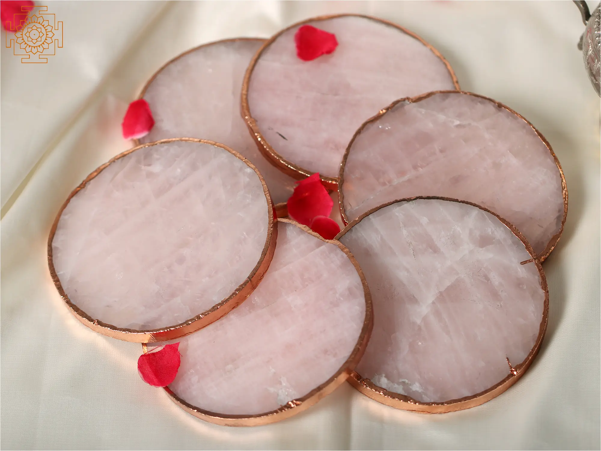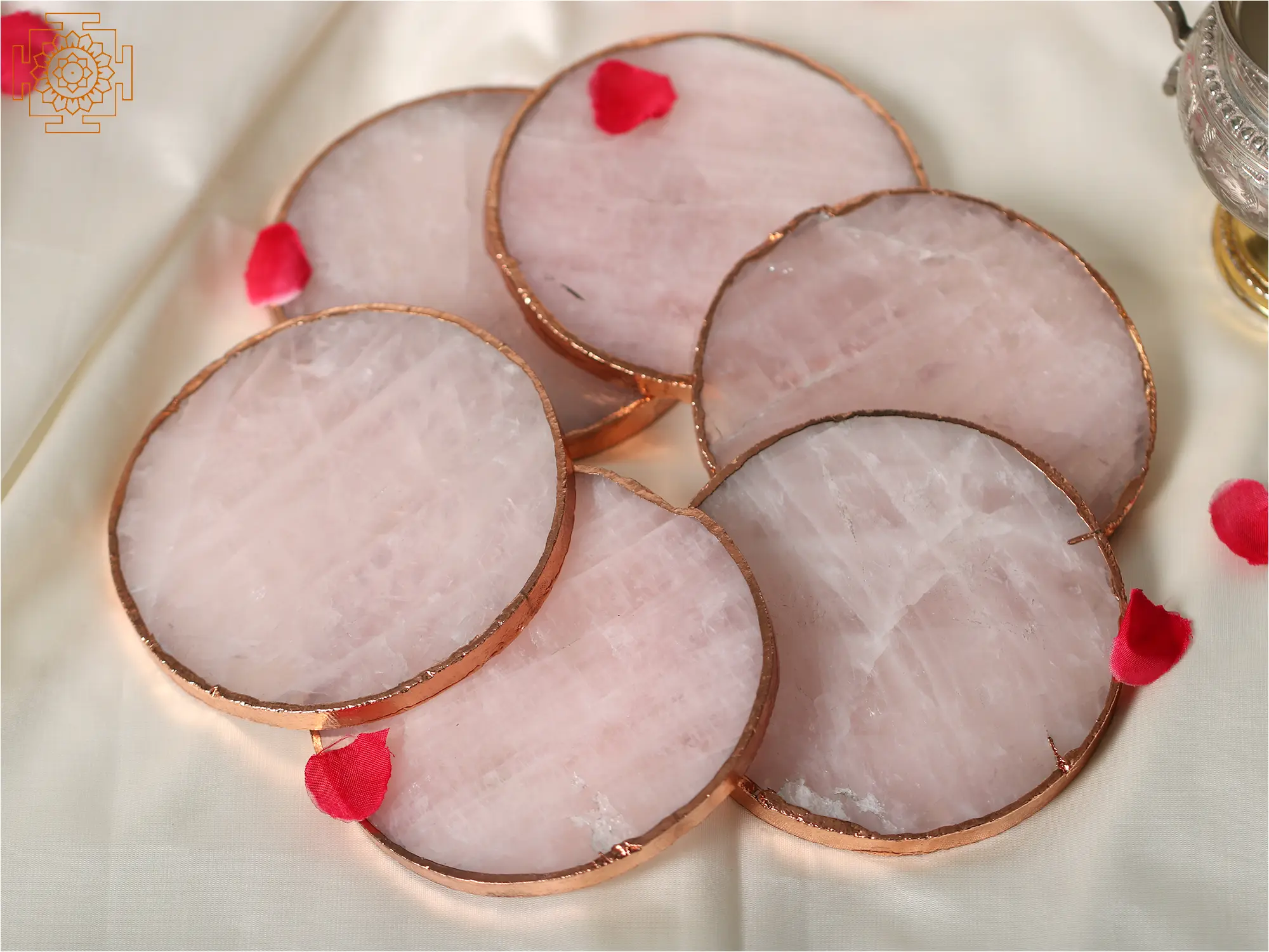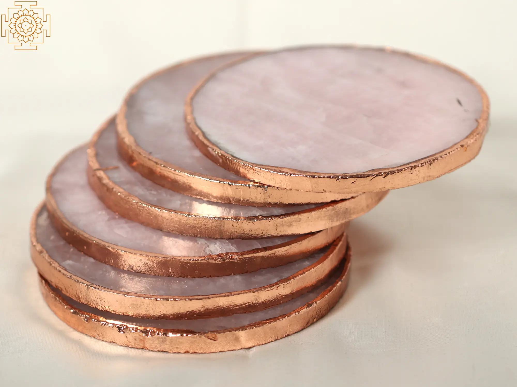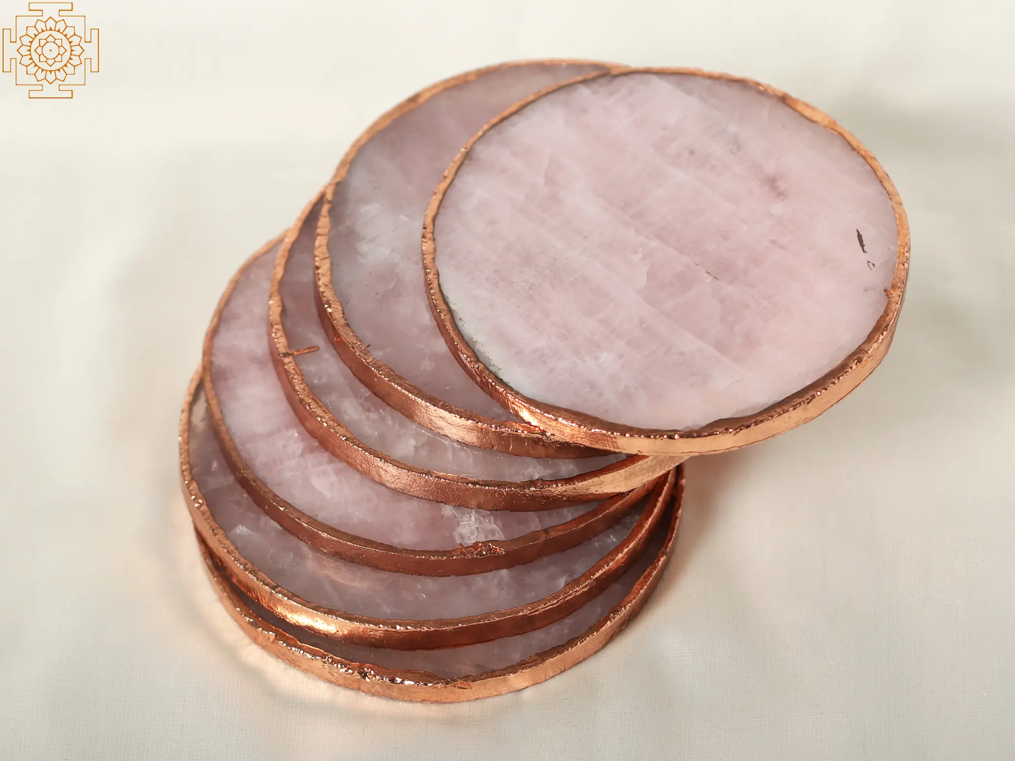 Rose quartz is known as the Heart Stone and promotes profound inner healing and self-love. Here, in this set of 6 Small Rose Quartz Round Coasters, the gemstone is used for its serene appearance. Crafted with care, each coaster features the gentle hues of rose quartz, known for its calming energy and exquisite beauty. The pieces are given a smooth finish and round shape and are painted with a rose gold hue on the corners. The combination of the rose quartz and the rose gold paint is one of the most elegant. For entertaining or quiet moments, these coasters infuse your space with a delicate charm, making them a thoughtful addition to your decor.