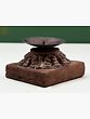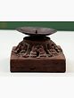 The stand features a robust square wooden base, showcasing the natural grain and warm tones of aged wood. Rising from this solid foundation is a beautifully sculpted pedestal, adorned with detailed carvings that evoke a sense of cultural heritage. These ornate elements suggest a lineage of skilled artisans who poured their passion into every curve and contour. The dark, weathered finish of the wood further enhances its vintage appeal, hinting at a past where it may have graced many a sacred space or cherished hearth.