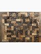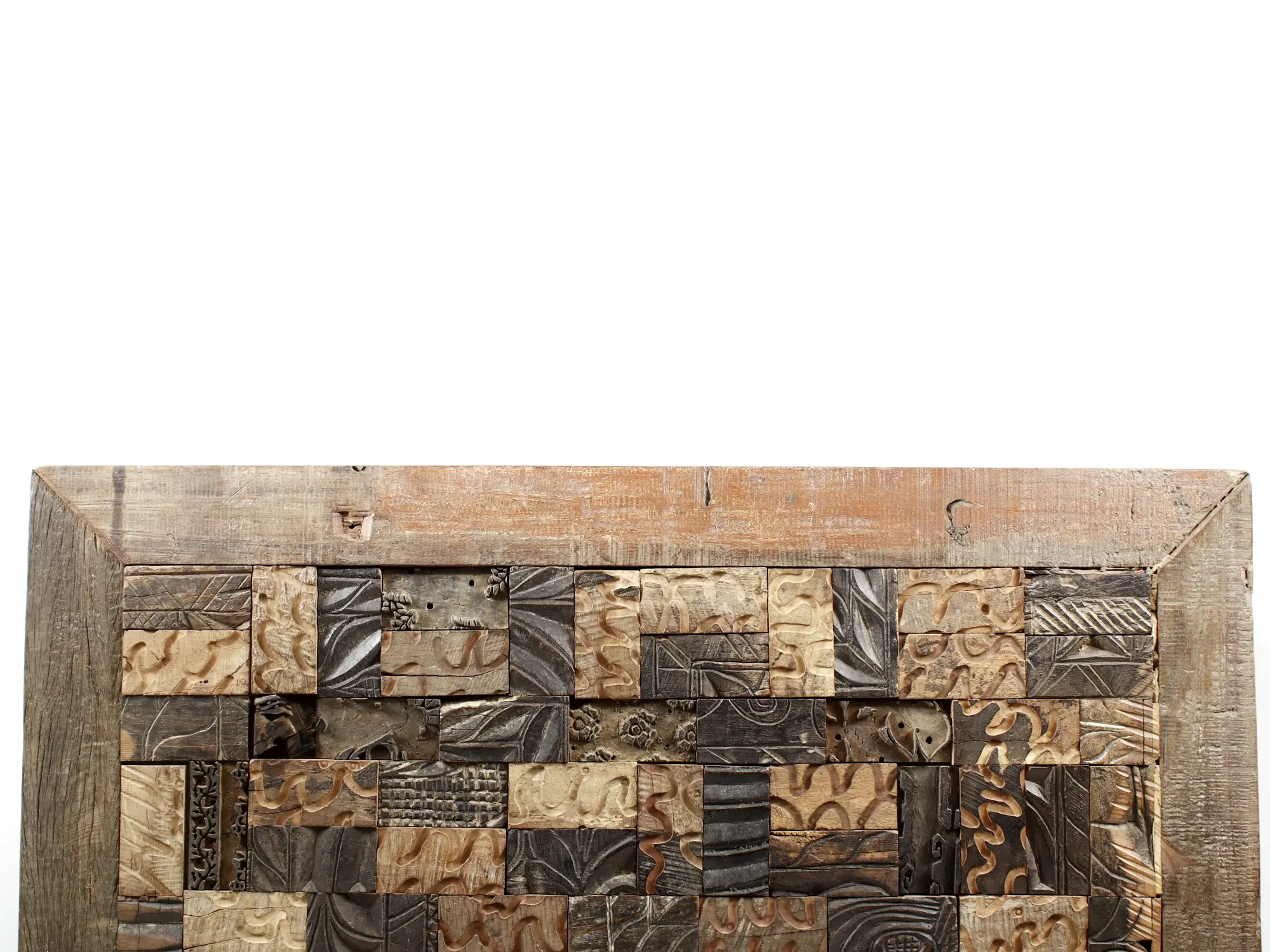 The heart of this artwork lies in its meticulously arranged mosaic of wooden blocks. Each block tells its own story, boasting a unique carved pattern. From flowing, organic lines reminiscent of natural foliage to geometric designs with a rhythmic repetition, the variety of textures and motifs creates a dynamic and engaging surface. The interplay of light and shadow across these carved elements adds a captivating depth, drawing you in to explore the subtle details. The natural variations in the wood grain, coupled with the distressed finishes that range from pale, honeyed tones to deep, rich charcoals, contribute to an authentic, vintage aesthetic. This piece feels as though it has been gathered from forgotten corners of the world, each fragment bearing the marks of time and tradition.