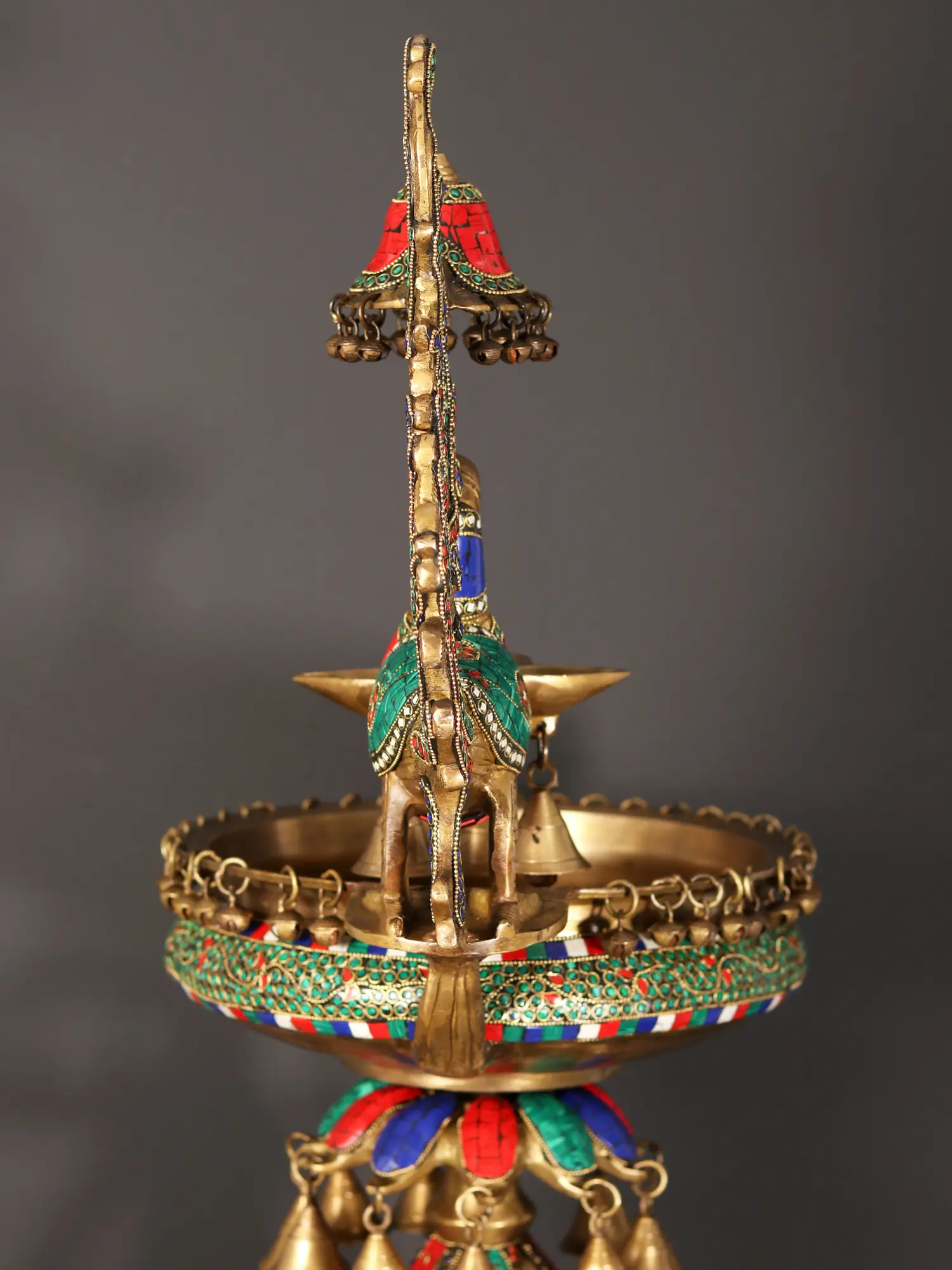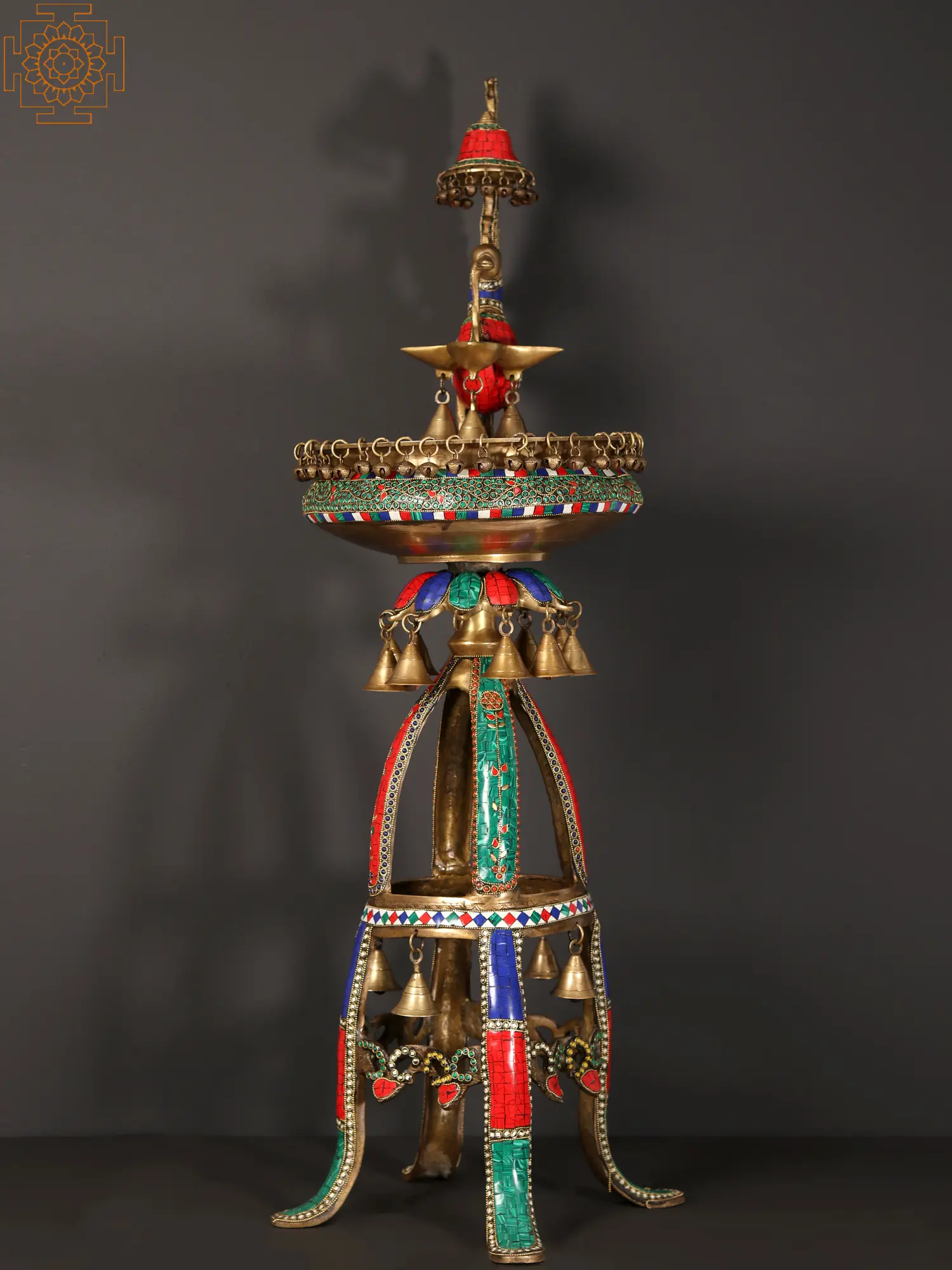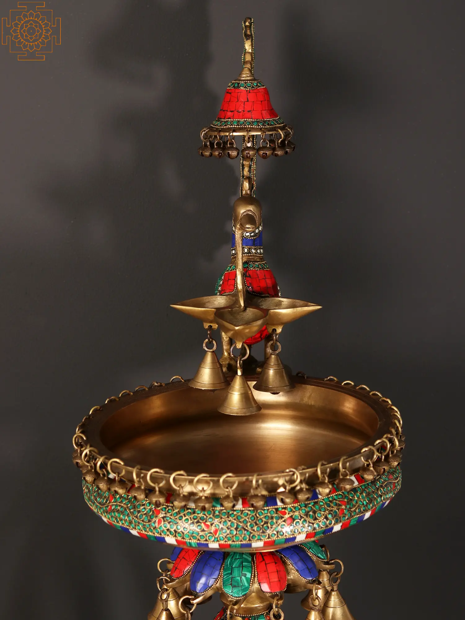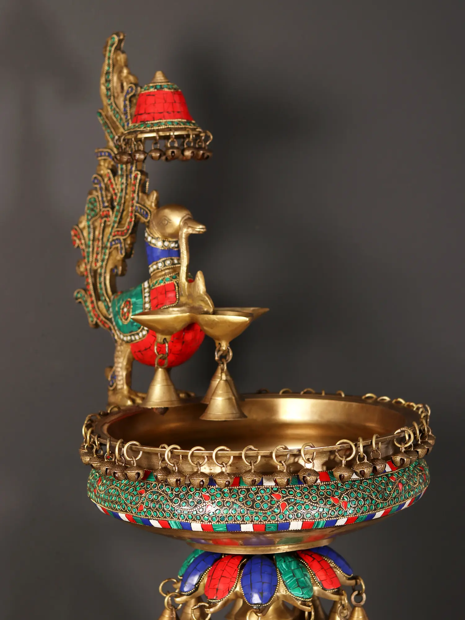 The Large Size Lamp with Hanging Bells and Ghungroos, accompanied by a peacock statue, creates a beautiful show of craftsmanship and heritage. The amply sized lamp is further embellished with gorgeous red and blue stone inlay work, producing a warm and inviting illumination. The stand's head is adorned with hanging bells, which emit lovely tinkling tones. Anam, or peacock statue, has a magnificent tail that depicts elegance and beauty. The Urli bowl's Ghungroos generate a rhythmic reverberation. The peacock finds shelter under a Chatri, a traditional brass umbrella. This wonderful set combines craftsmanship, history, and beauty to create an enticing atmosphere in any area.