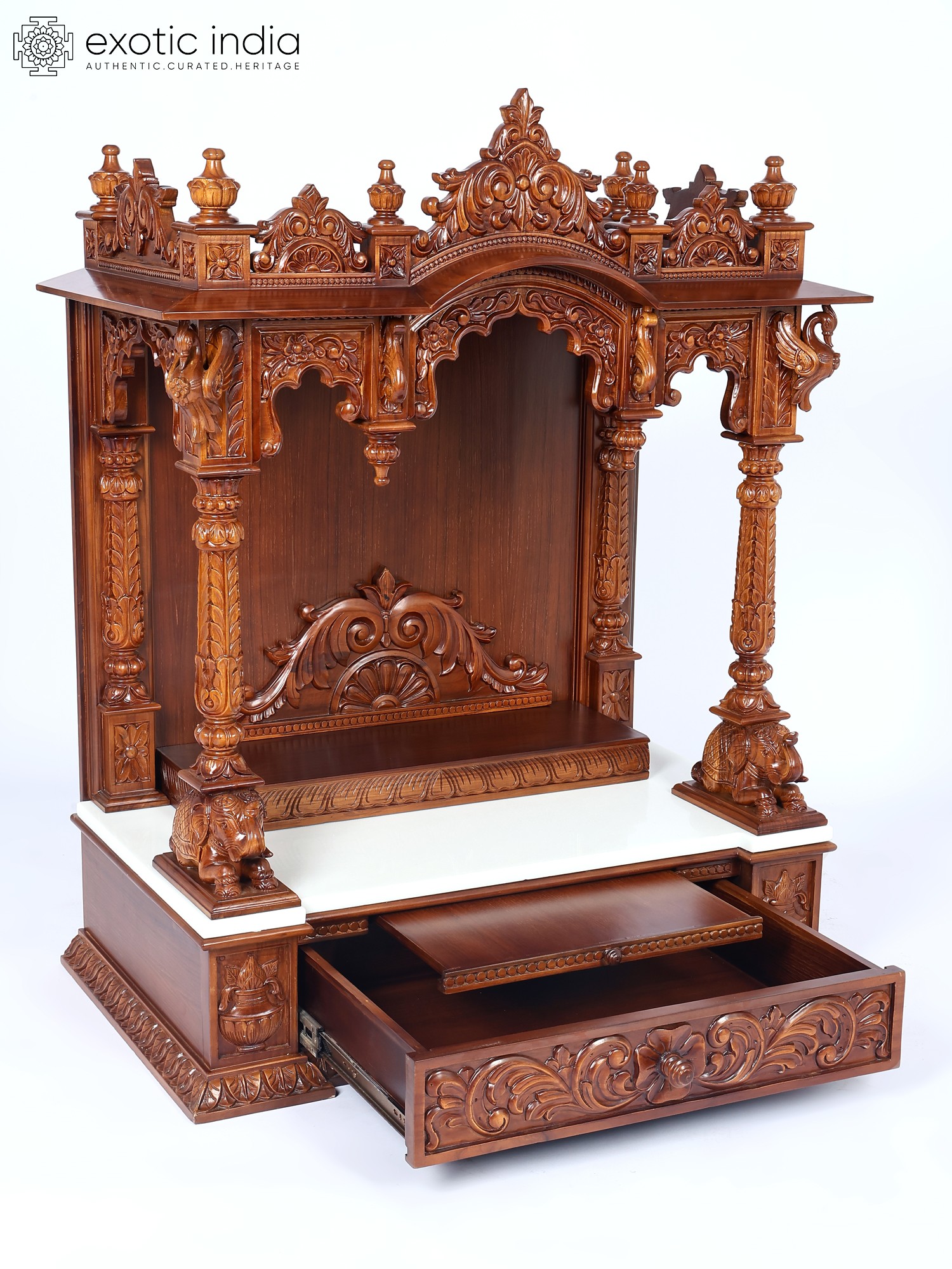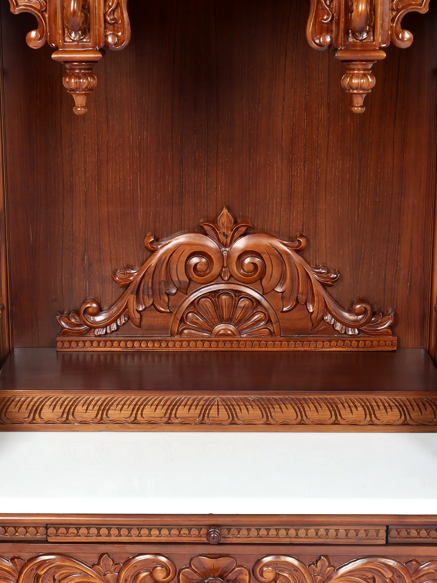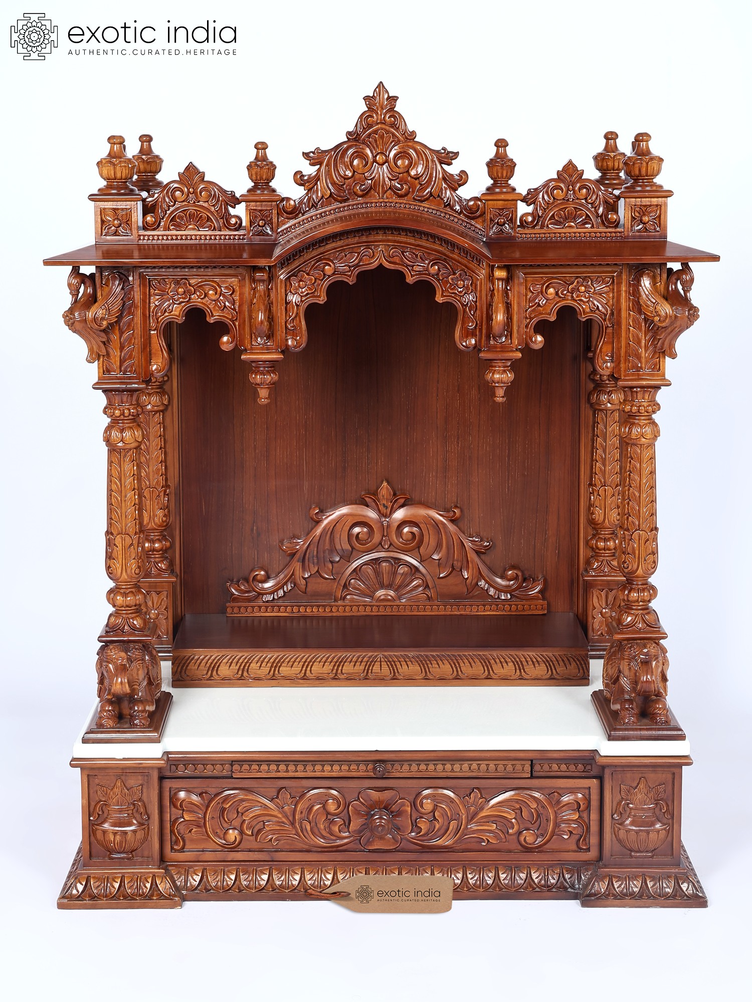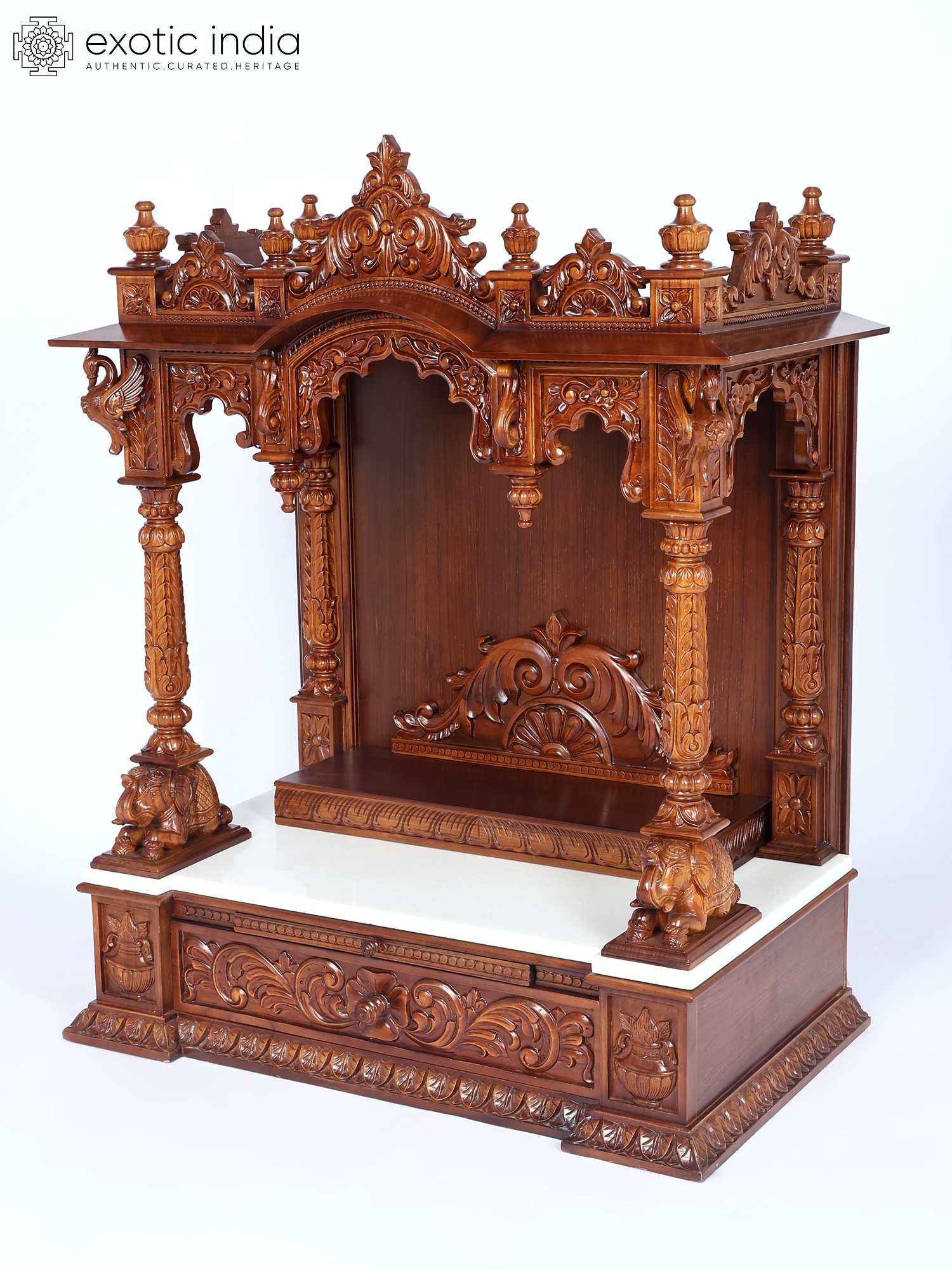 Experience the culmination of generations of artisanal expertise. Each element is meticulously carved from the finest quality wood, showcasing intricate floral motifs and divine figures that speak of devotion and skill. The rich grain of the wood is expertly brought to life, complemented by a smooth marble platform that adds an element of serene beauty and refined contrast.