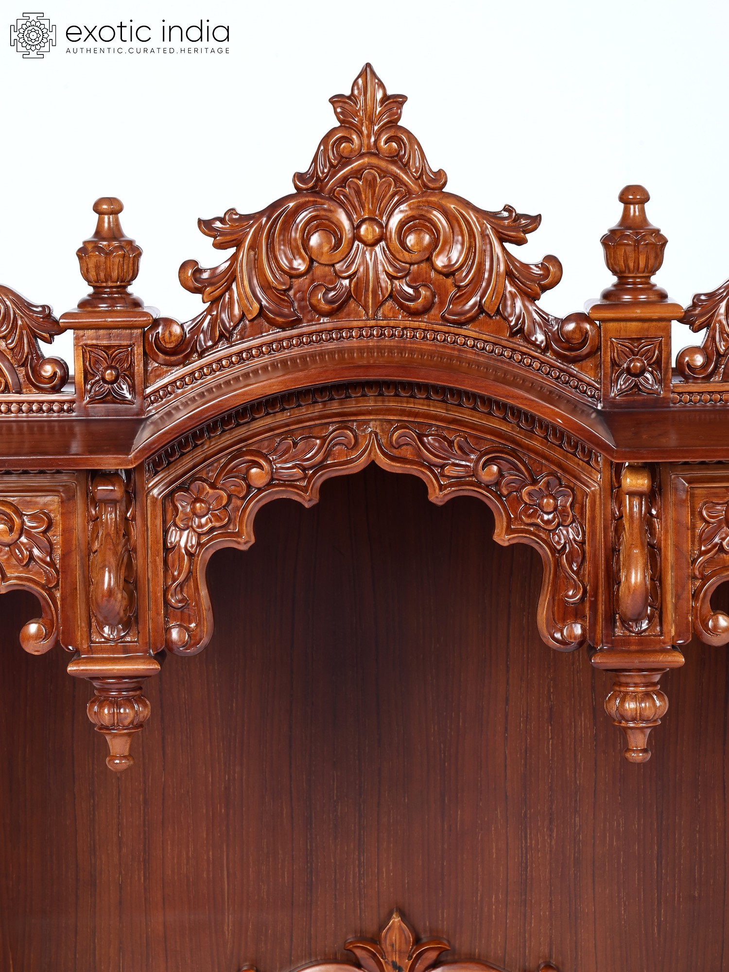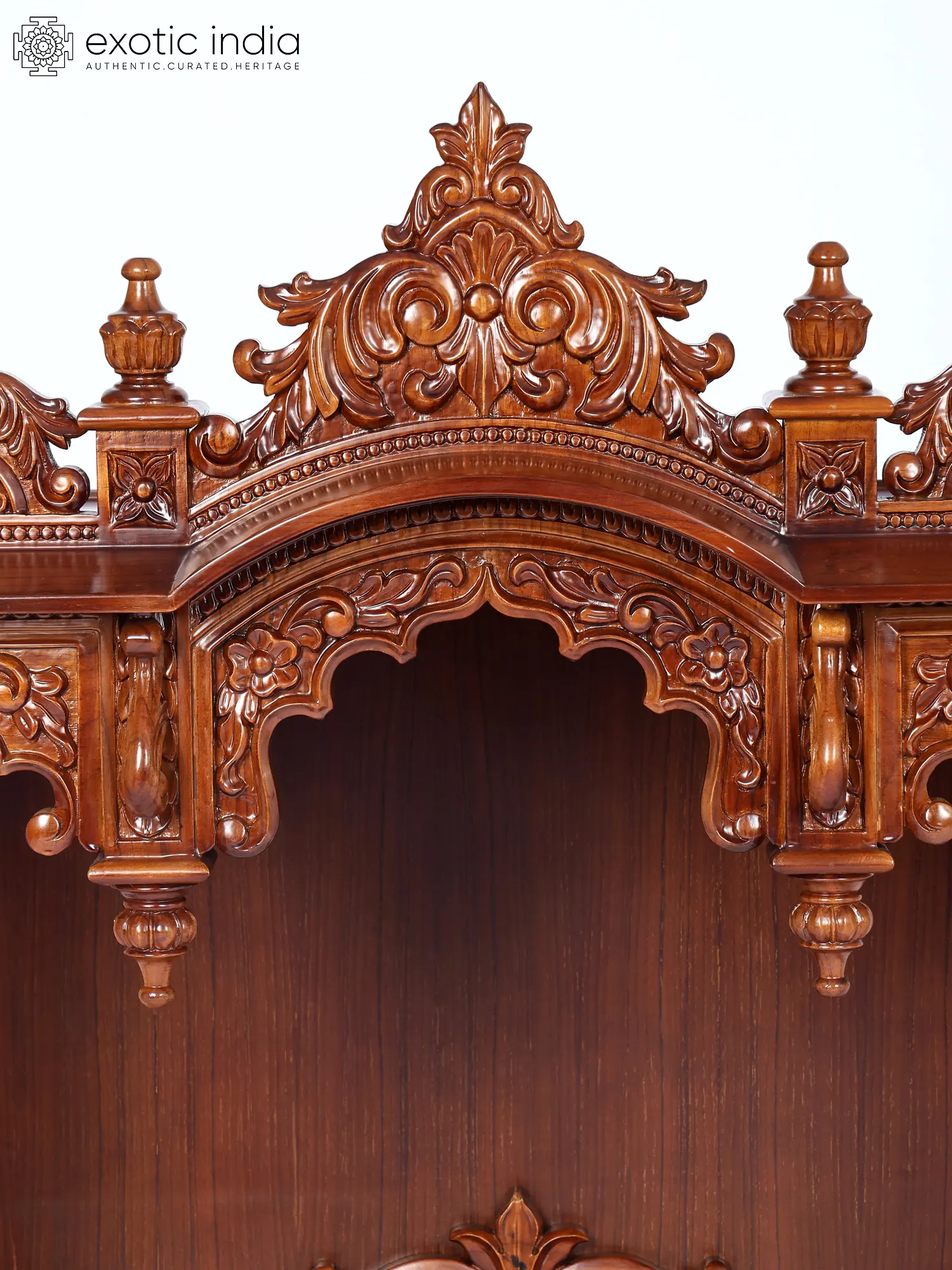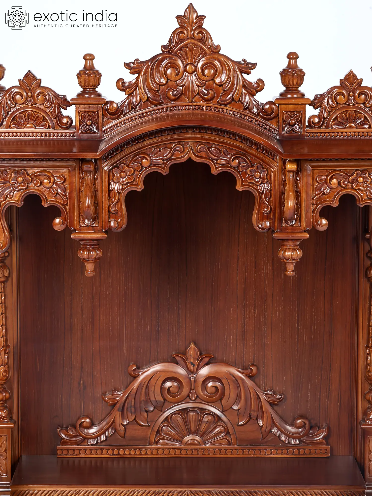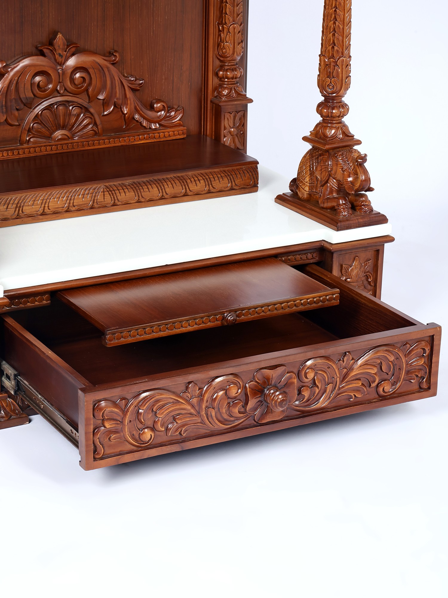 Experience the culmination of generations of artisanal expertise. Each element is meticulously carved from the finest quality wood, showcasing intricate floral motifs and divine figures that speak of devotion and skill. The rich grain of the wood is expertly brought to life, complemented by a smooth marble platform that adds an element of serene beauty and refined contrast.