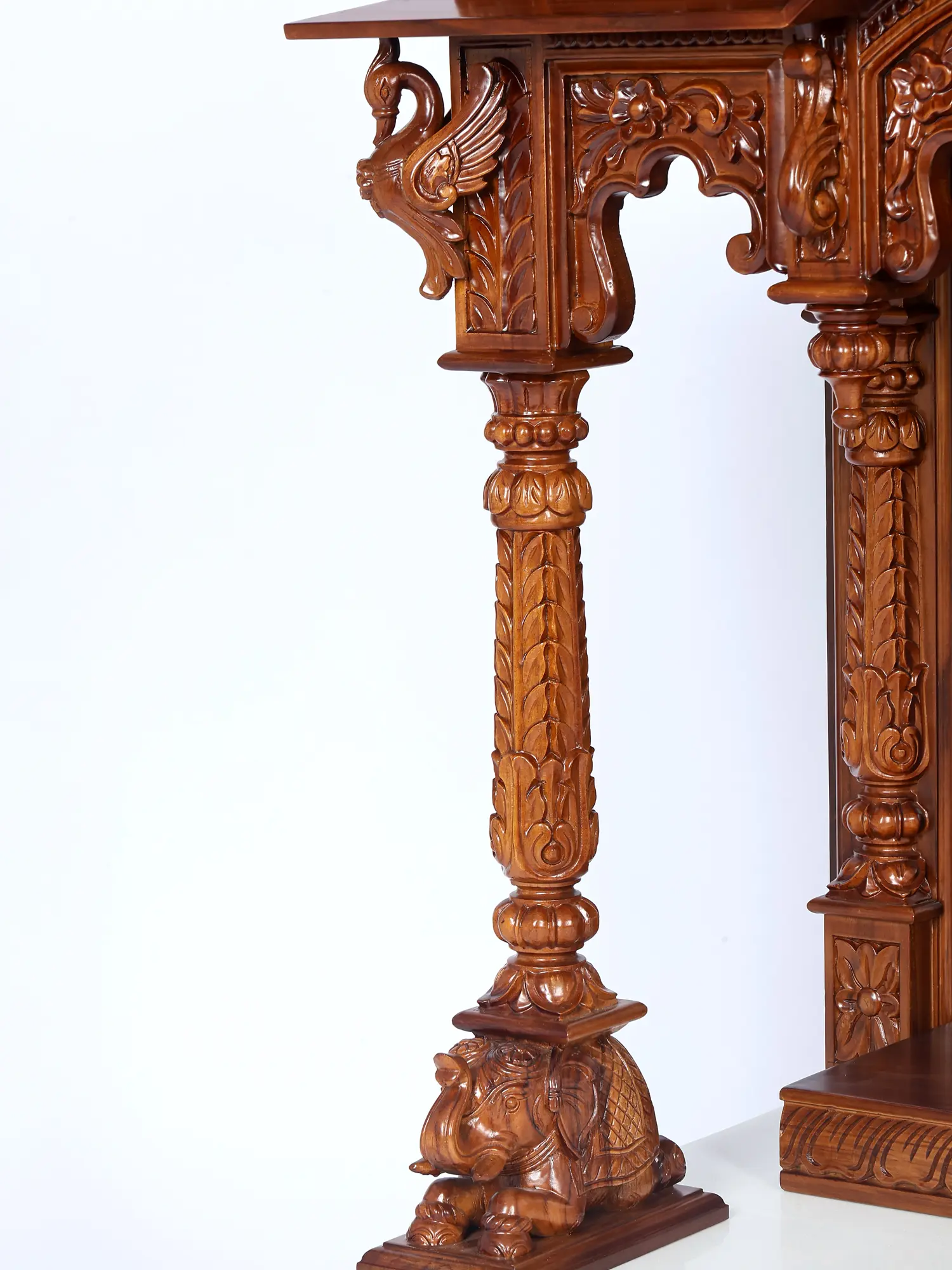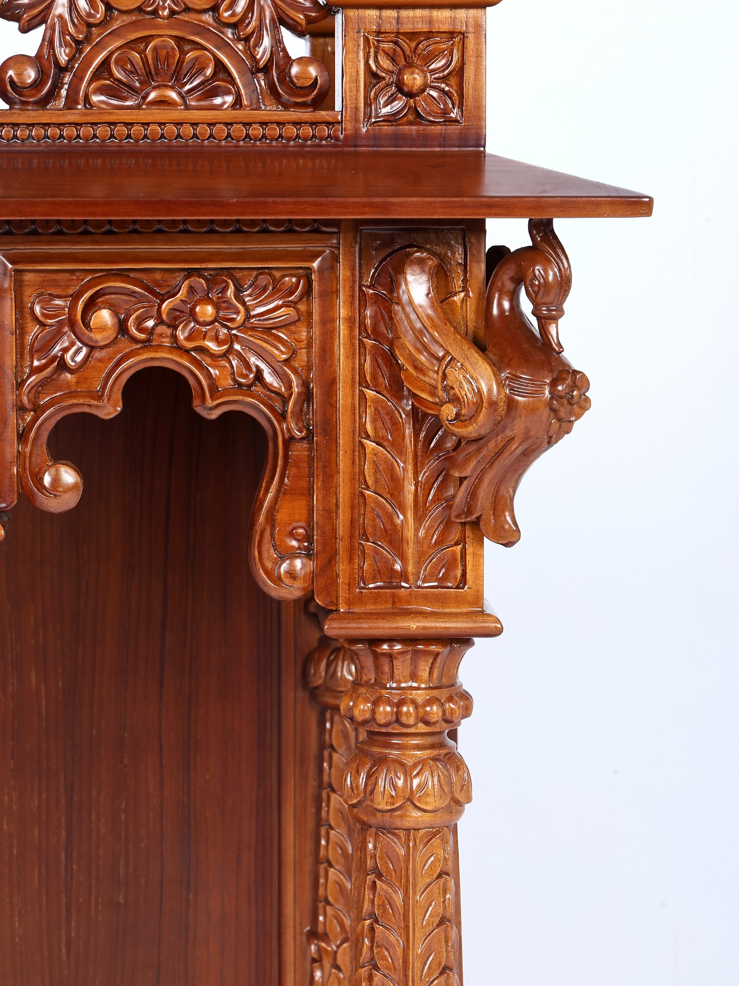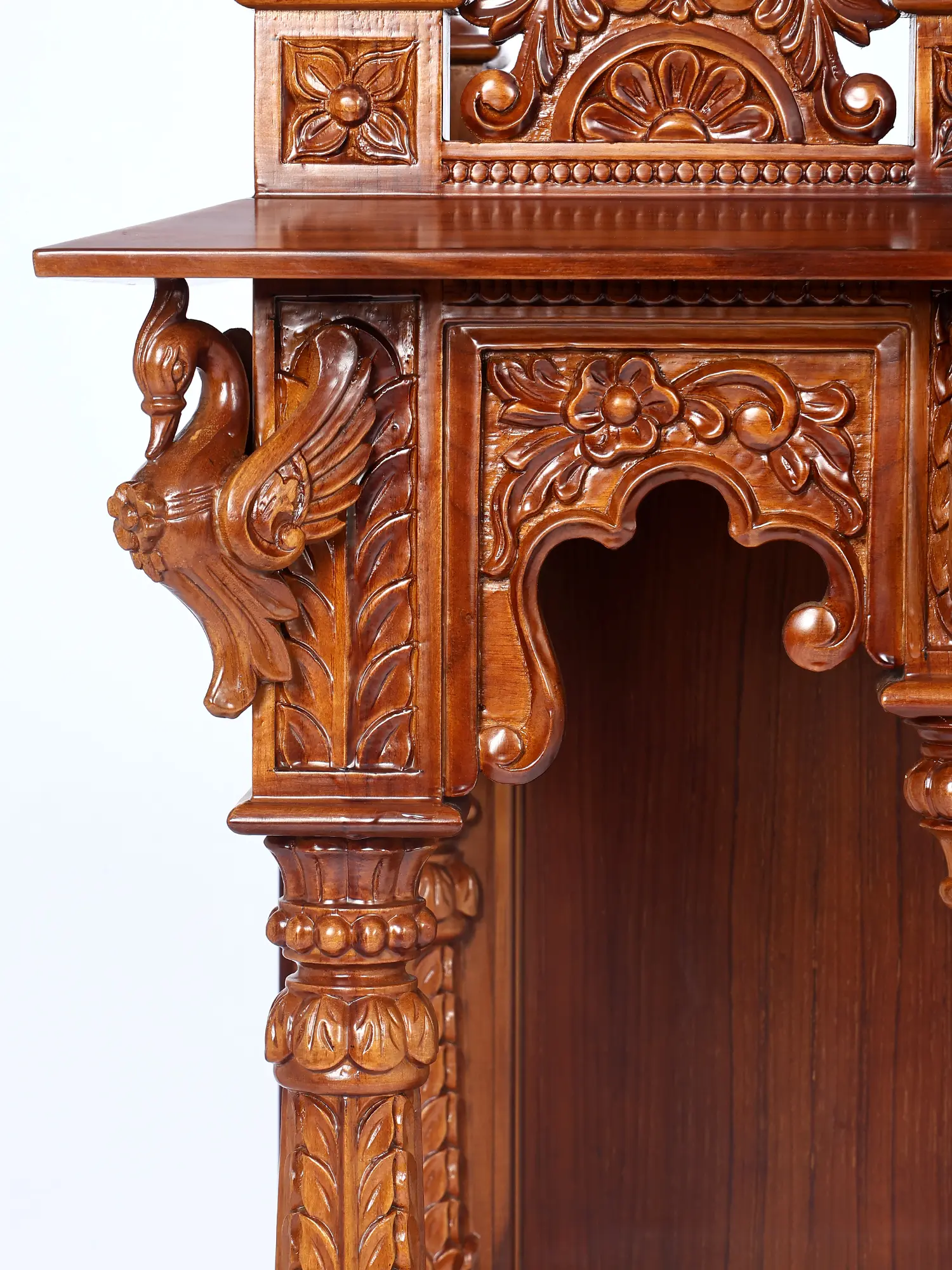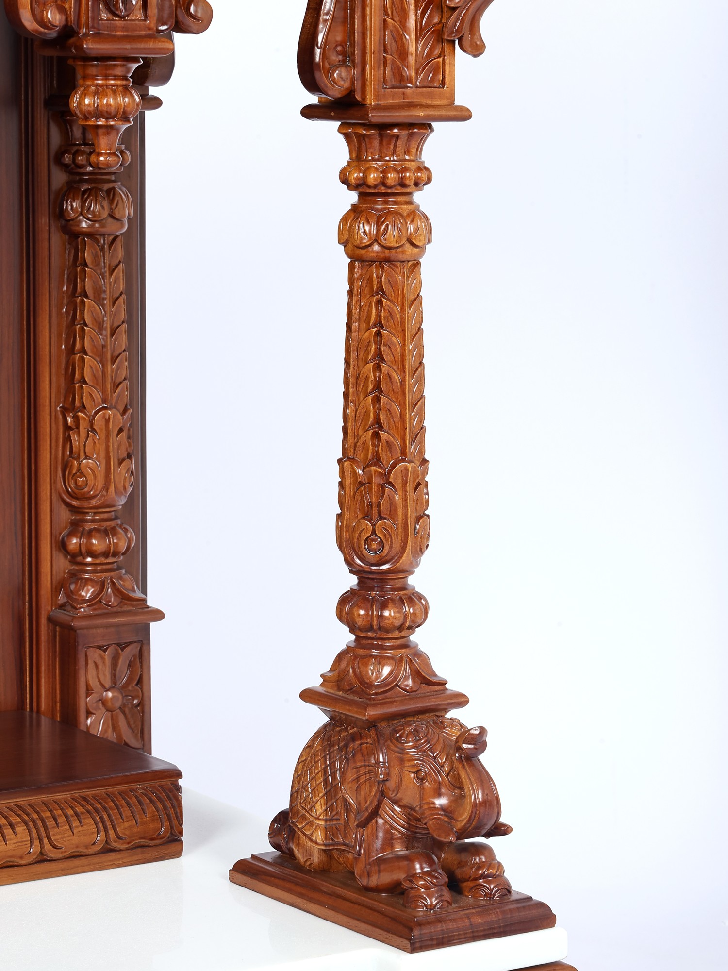 Experience the culmination of generations of artisanal expertise. Each element is meticulously carved from the finest quality wood, showcasing intricate floral motifs and divine figures that speak of devotion and skill. The rich grain of the wood is expertly brought to life, complemented by a smooth marble platform that adds an element of serene beauty and refined contrast.