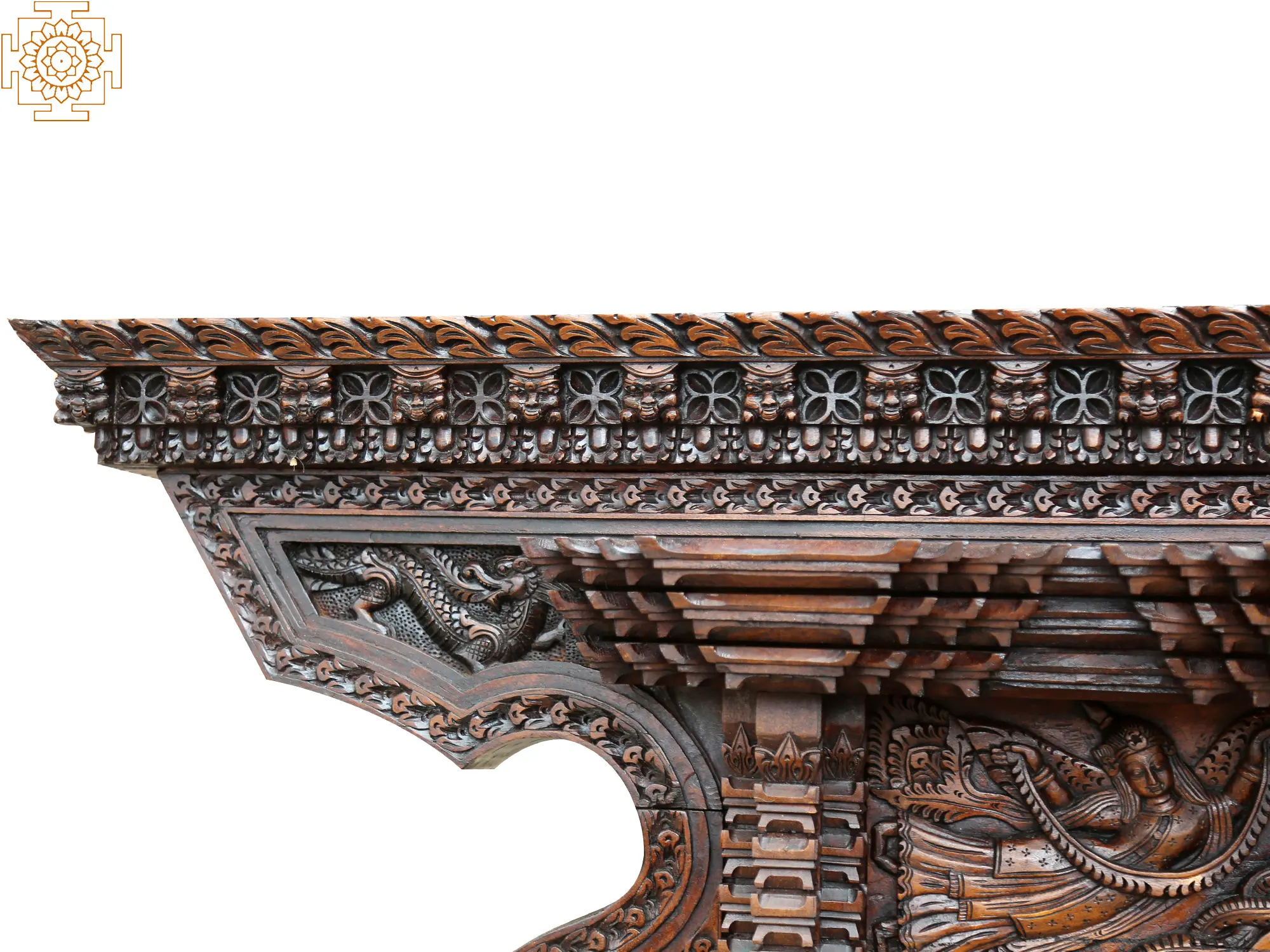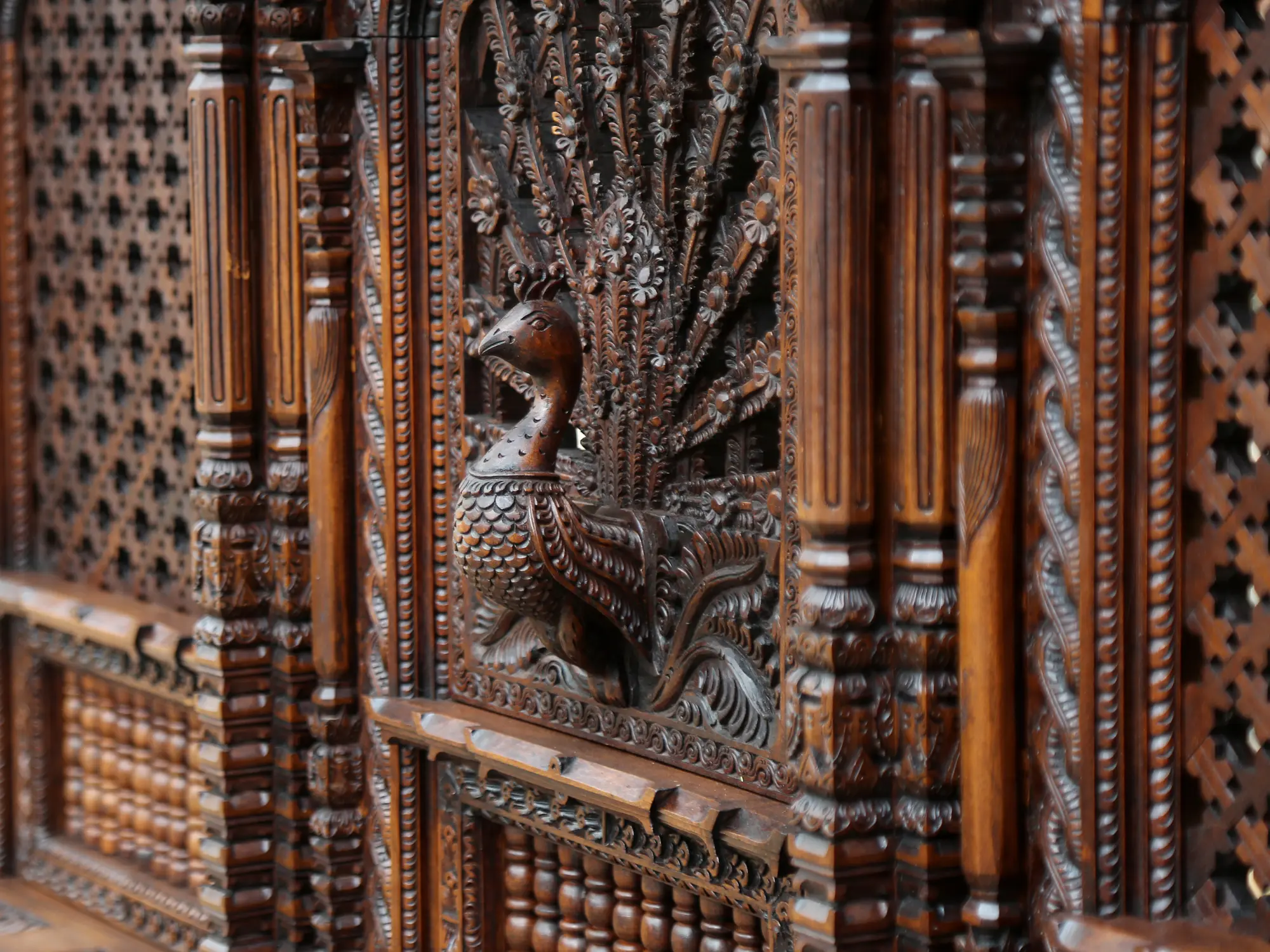 An exquisite, lifelike wooden–carving chubby, classy peacock in the center, surrounded by patterns of Nepalese gods is a beautiful masterpiece of Hindu architecture. Every tread speaks the wisdom and sweat of the artisans.