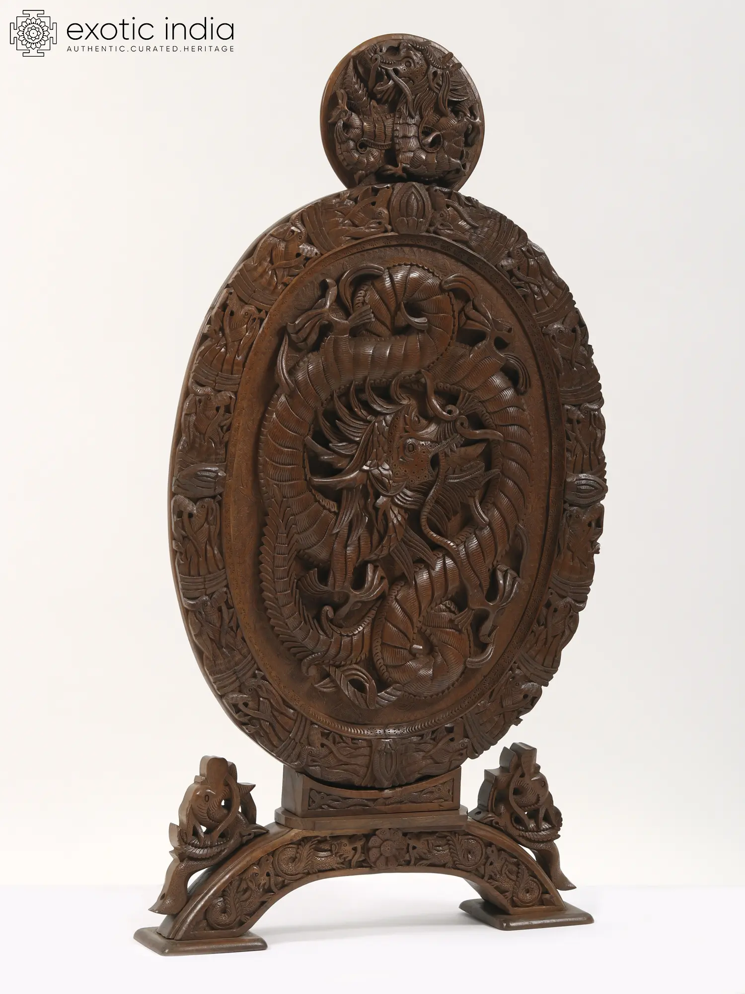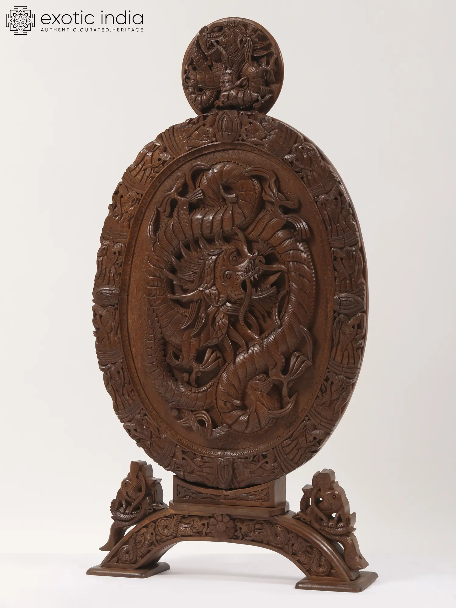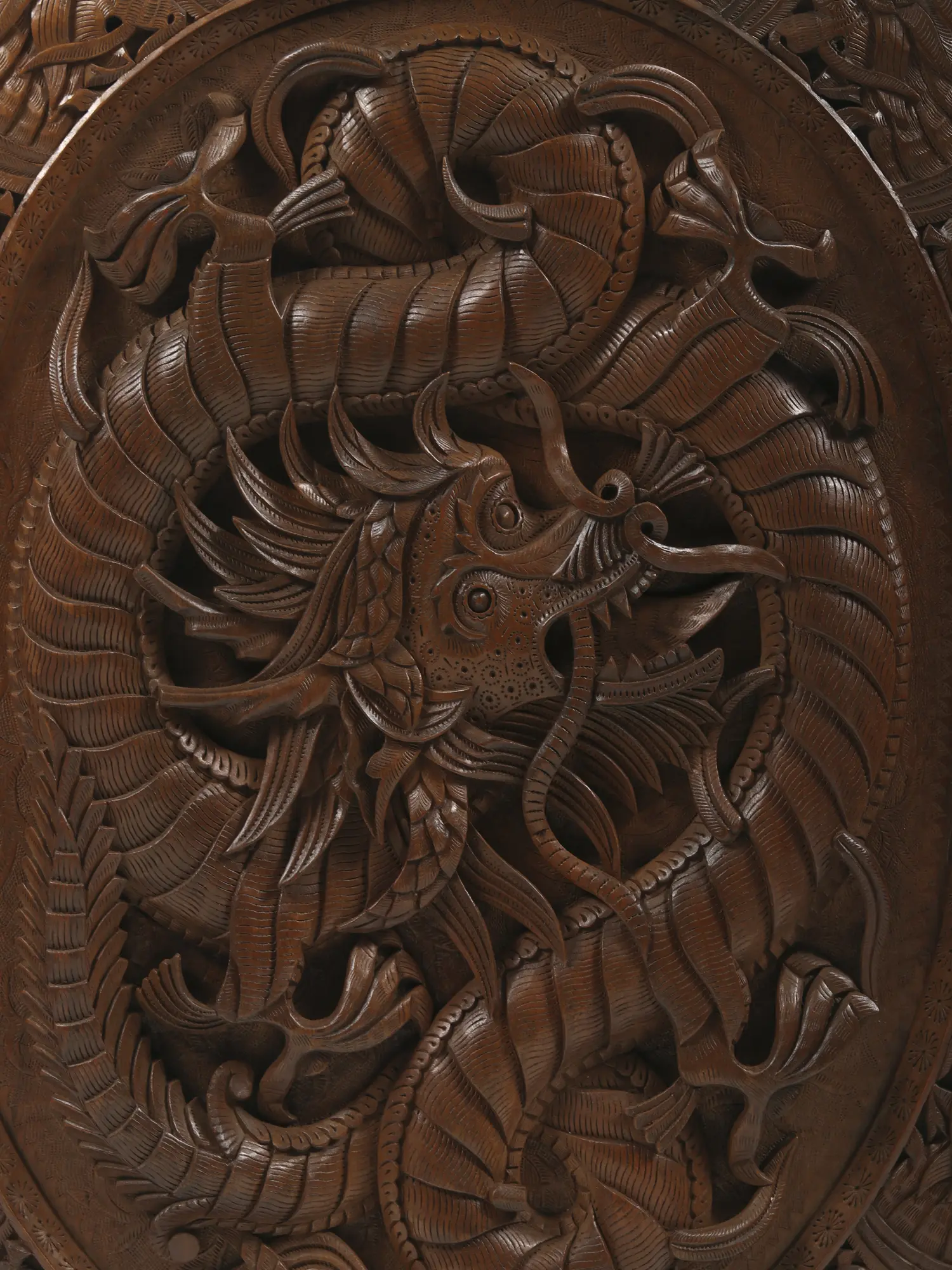 Step into the realm of mythical elegance and artistic craftsmanship with our Large Walnut Wood Carved Dragons Design Panel, a masterpiece from the heart of Kashmir. This striking panel reflects the profound philosophy of the eternal struggle between good and evil, as embodied by the fierce dragons. The intricately carved dragons in this panel symbolise the balance of opposing forces and the interplay of power. The craftsmanship captures their fierce and majestic nature, reminiscent of the dragon lore found in various cultures. As a decorative piece, this panel not only adds a touch of mystique but also serves as a visual representation of the profound philosophy that life is a delicate dance of opposing energies, forever intertwined in the grand design of the universe.