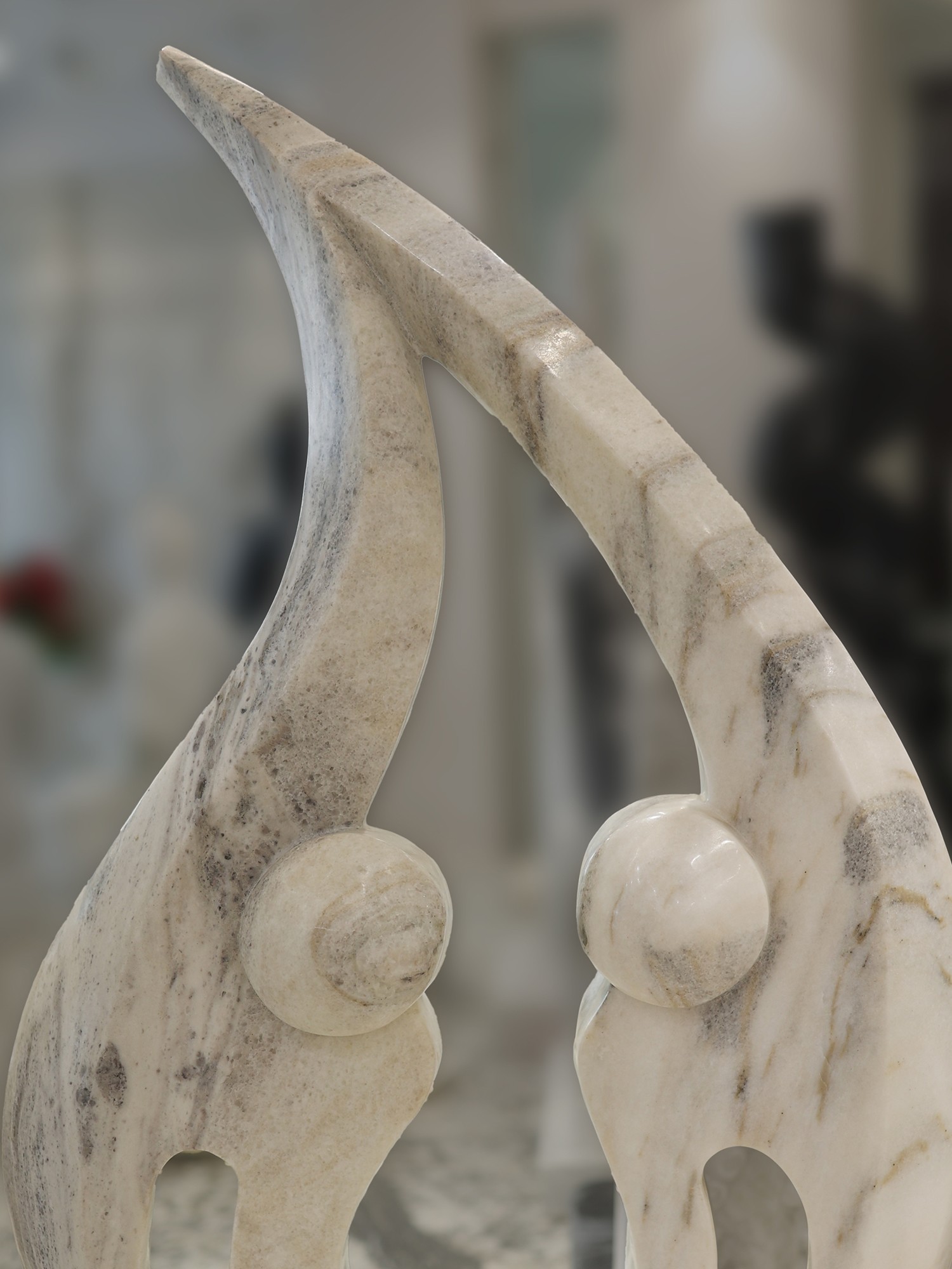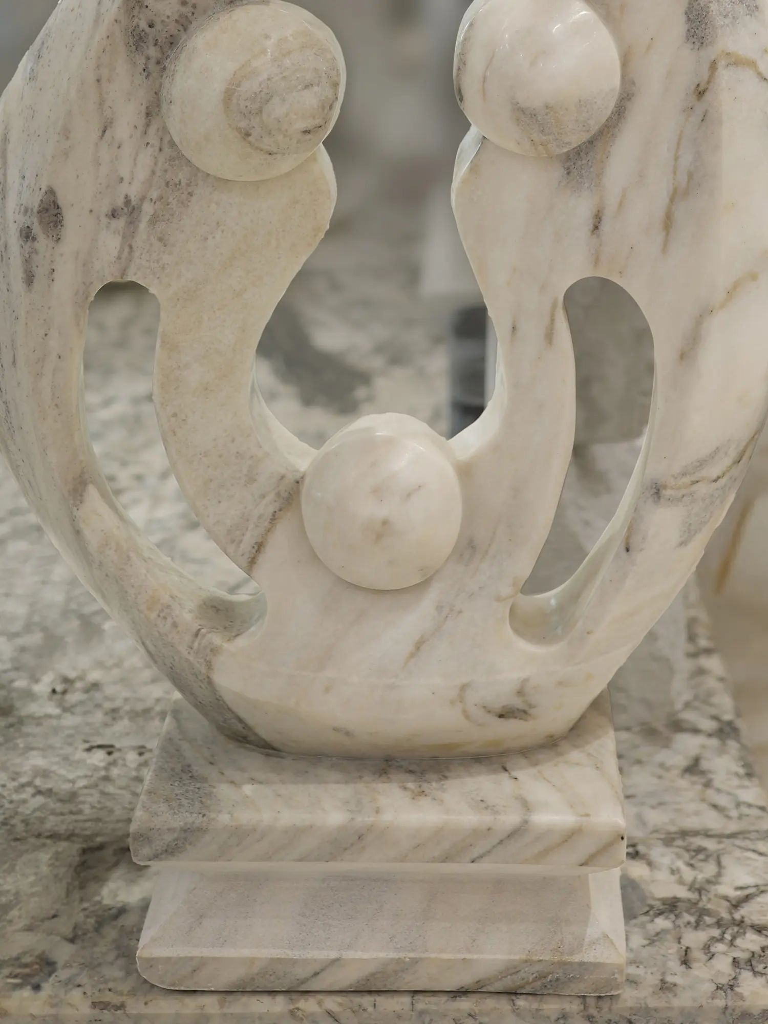 This magnificent sculpture, crafted from exquisite natural white marble, is a testament to the enduring power of family bonds. Standing tall and commanding attention, its graceful, abstract form evokes a sense of fluidity and organic growth, reminiscent of a protective embrace. The artist has masterfully captured the essence of familial connection, portraying a sense of unity and mutual support through the interplay of flowing lines and rounded forms. The dynamic curves suggest movement and life, while the placement of spherical elements within the structure signifies the interconnectedness of individuals within a family unit. ––––––––––