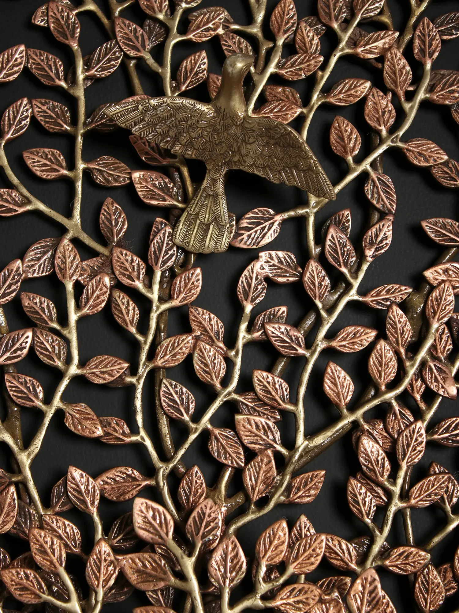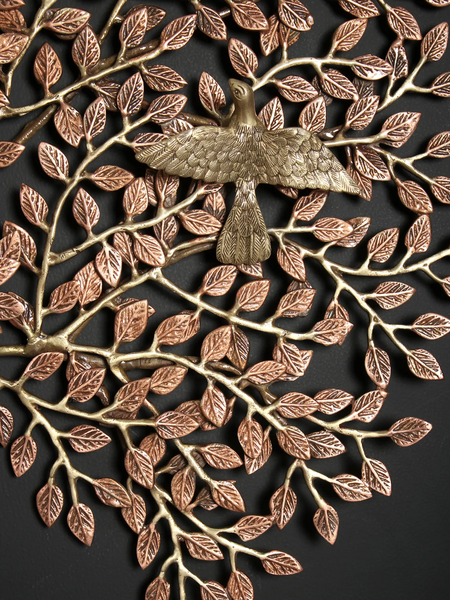 Kalpavriksha, also known as kalpataru, is a sacred tree that grants wishes in Indian faiths. It is either a divine, heavenly, or spiritual tree. The tree is associated with the Pandava clan's prince Arjuna, who is claimed to have brought it from heaven. This Large Tree of Life with Chirping Birds is made of brass and has 24 Karat Rose Gold Plating on it. It is an item that can be wall-mounted. The brass tree has been crafted by skilled craftsmen who painstakingly joined each element like the leaves, lotus flower, and birds individually through wielding.
