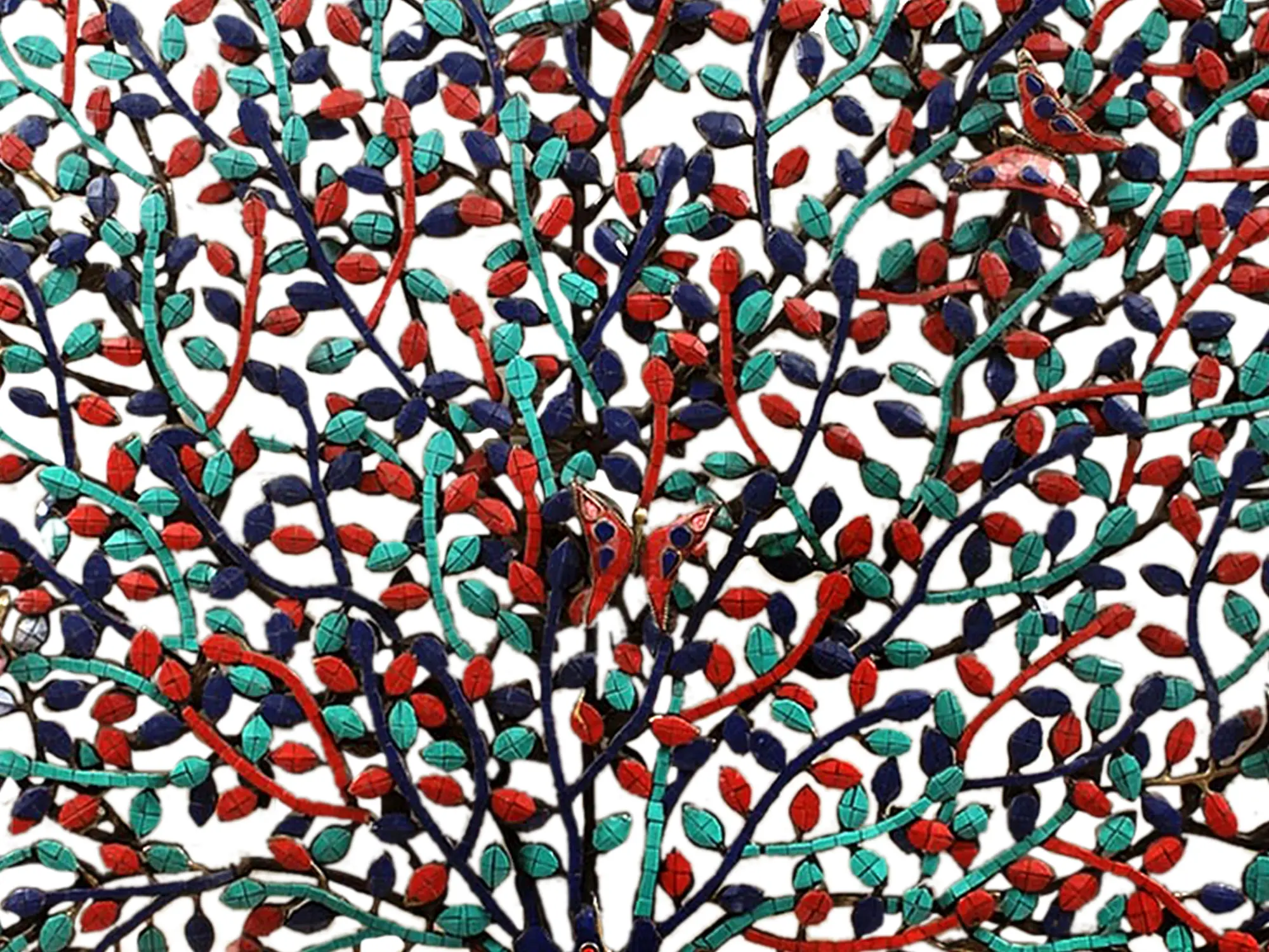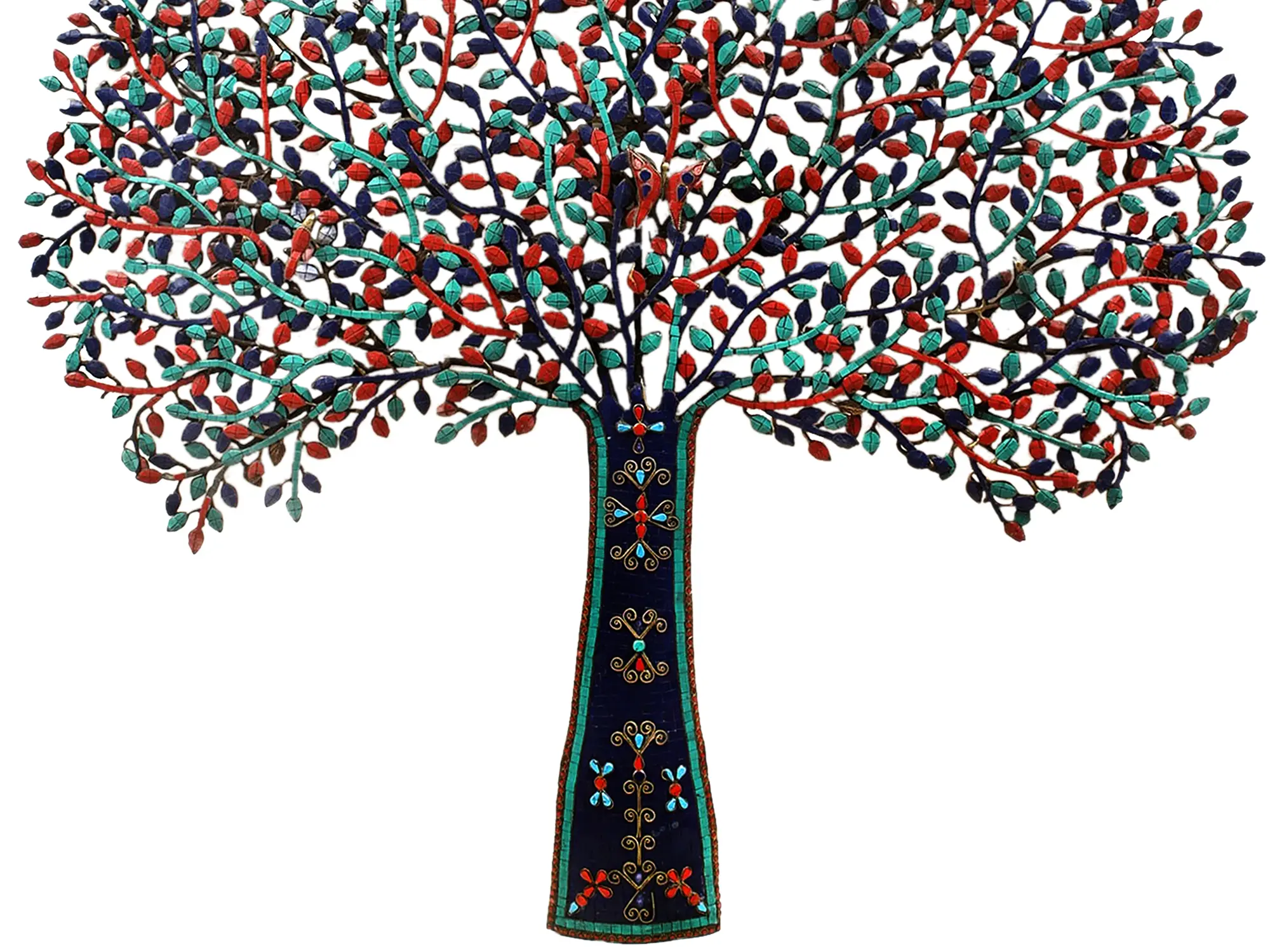 The sumptuous masterwork Large Tree of Life, exudes imperial splendour and eternal beauty. It is handcrafted with excellent craftsmanship and features a harmonic combination of brass, red, blue, and green inlay work. The tree's branches are covered with brilliant crimson butterflies and colorful leaves that dance in the mild breeze. The tree's trunk is a work of art in and of itself, covered with delicate inlay work in blue and little designs of brass wire that catch the light and shimmer with magic.