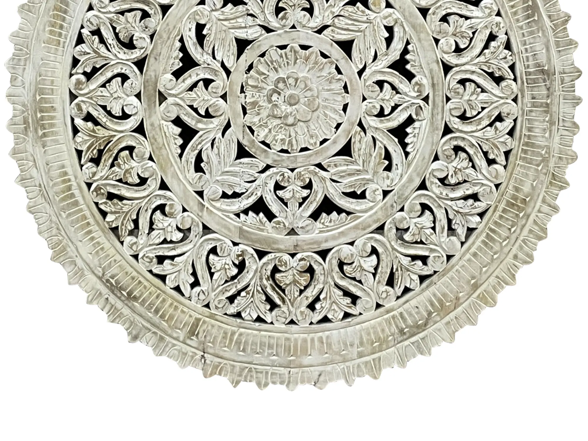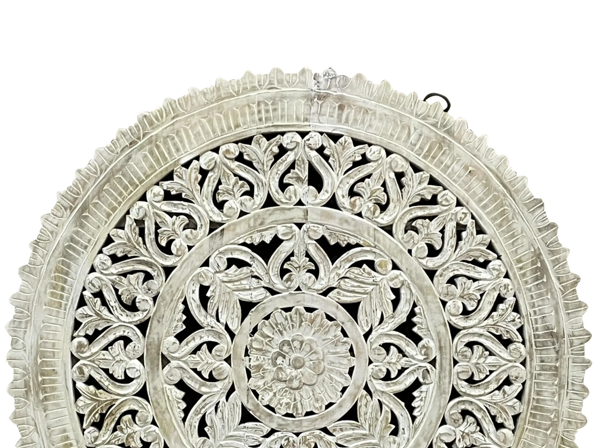 In India, wooden panels are long associated with traditional temples and home decoration. This round flower panel made from high-quality mango wood is a testimony to the regal lifestyle. The smooth grey finish on the panel offers a sense of timeless beauty. Jodhpur Shekhawati style flawless floral carvings captivate and amaze the viewer, conveying stories of artwork and heritage. With its traditional beauty, these panels stand as a testimony to the durability of artwork, capturing hearts and minds for hundreds of years to come.