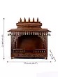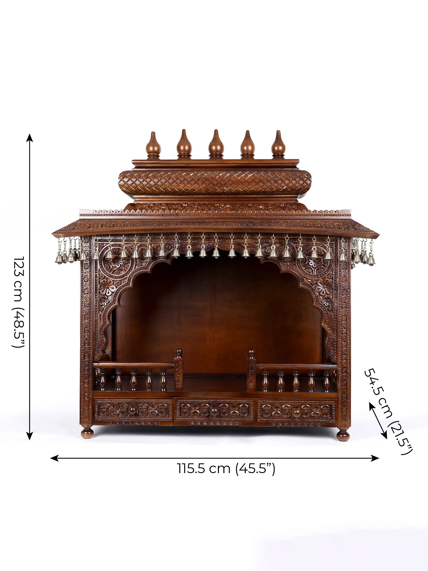 Every inch of this puja temple is a testament to meticulous craftsmanship. The richly detailed carvings are not merely decorative; they are expressions of devotion, each motif thoughtfully chosen and meticulously executed. The gracefully arched entryway frames the inner sanctum, creating a sense of sacred space and reverence. The decorative elements, including the intricately carved floral patterns and geometric designs, reflect traditional Indian artistry. The top of the temple features a stunningly designed crown, adding a regal touch to the overall design. The smooth, polished finish of the wood enhances the natural beauty of the material, while the deep, rich brown color exudes warmth and elegance. The small details, such as the intricately carved drawer fronts and the elegant balusters on the shelf, demonstrate the level of craftsmanship invested in this piece.